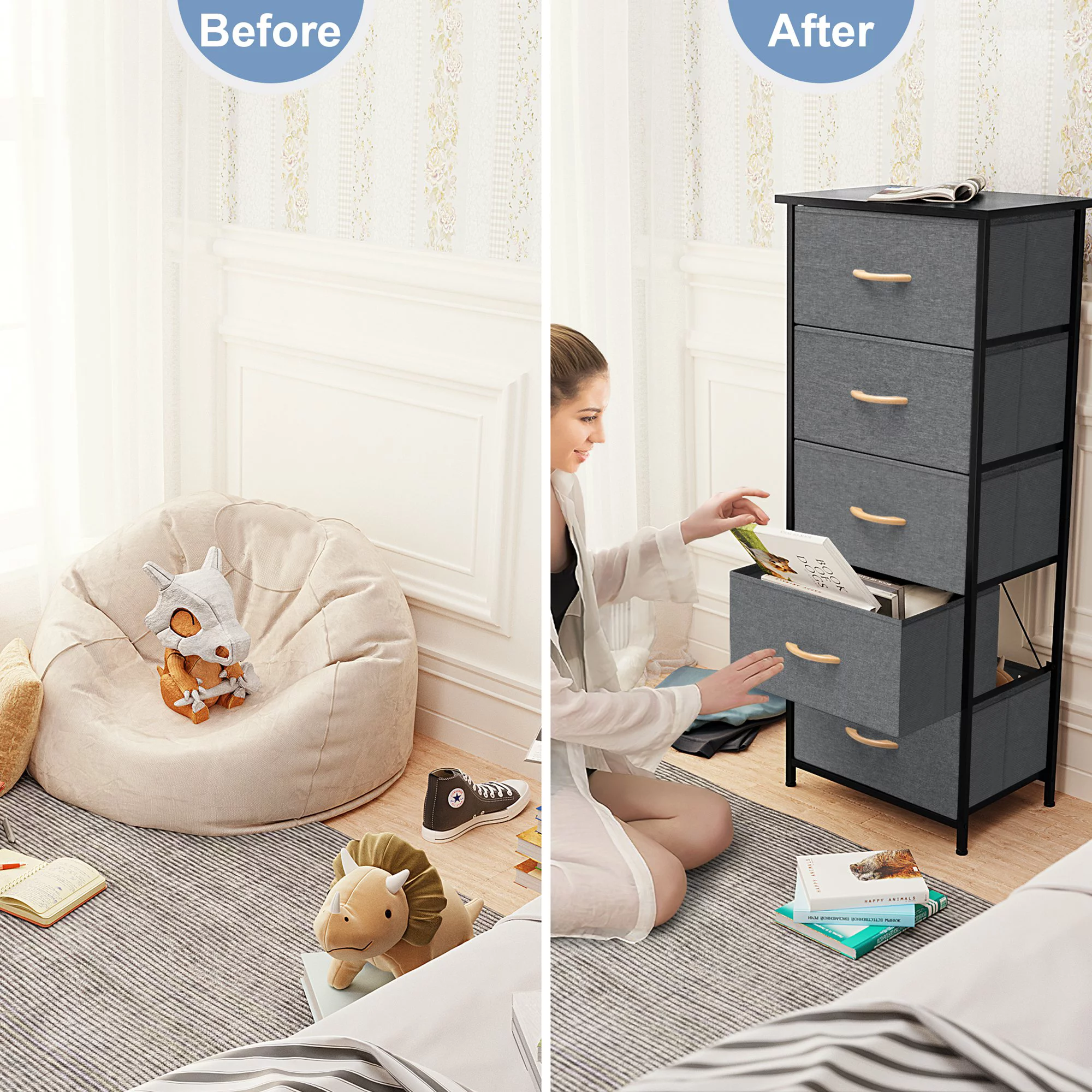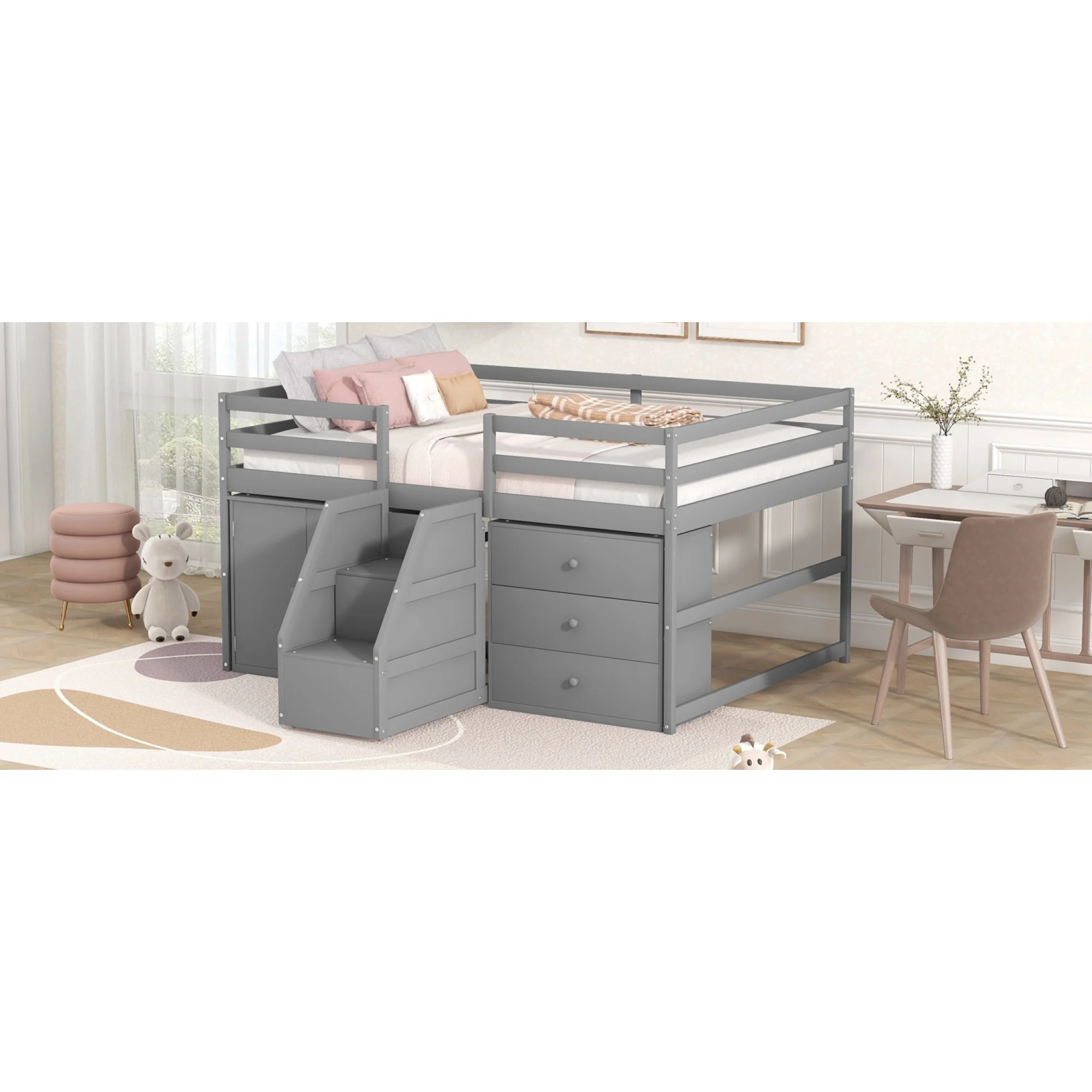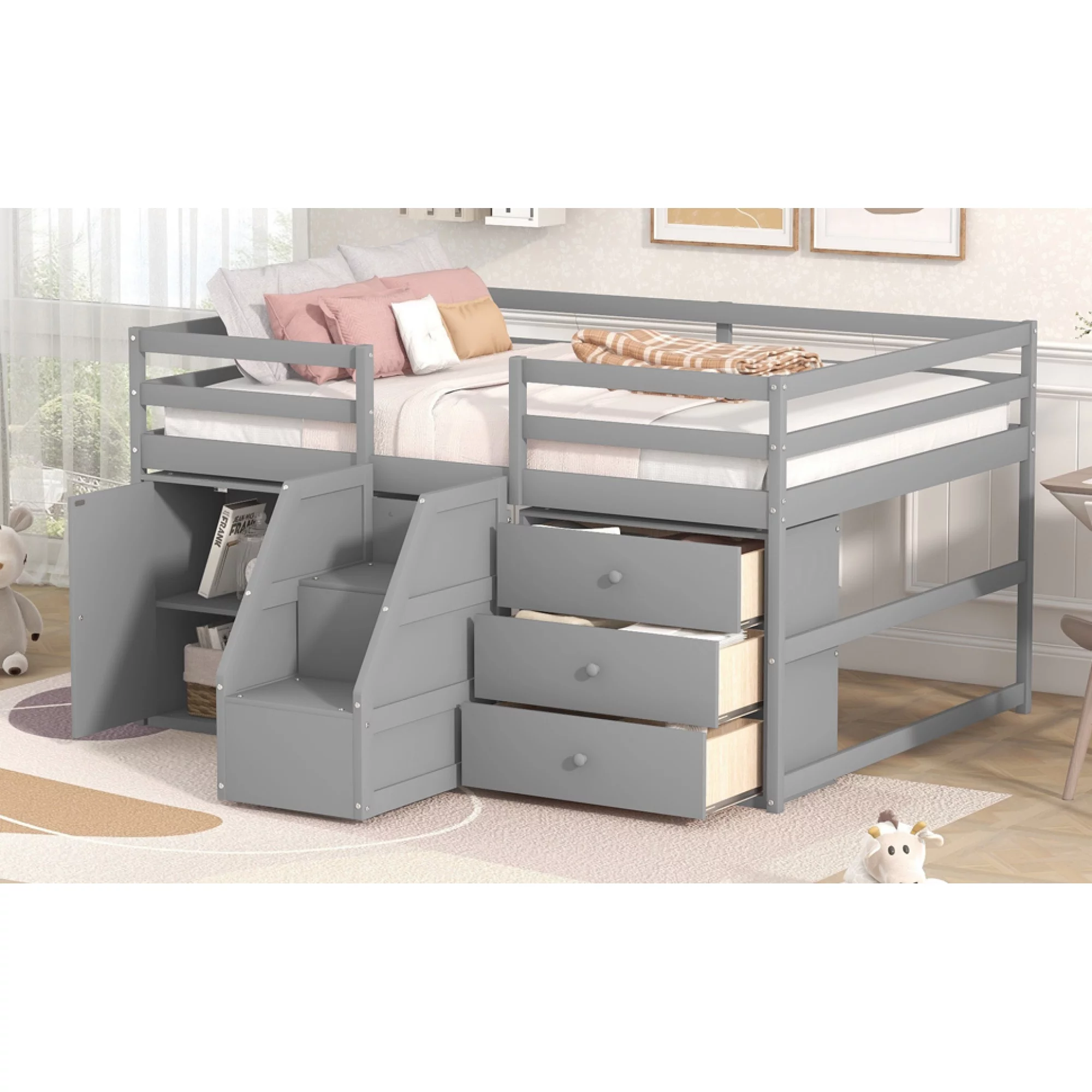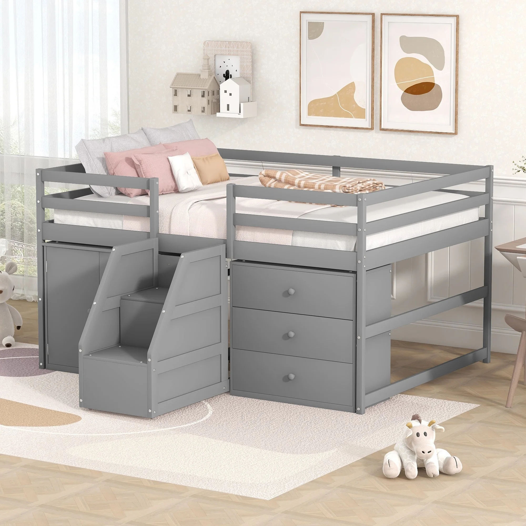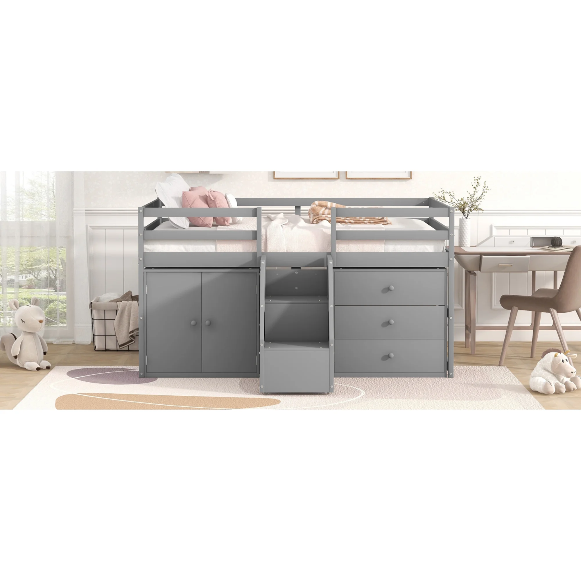 Dawn Whisper Full Size Functional Loft Bed with Cabinets and Drawers, Hanging Clothes at the back of the Staircase, Gray