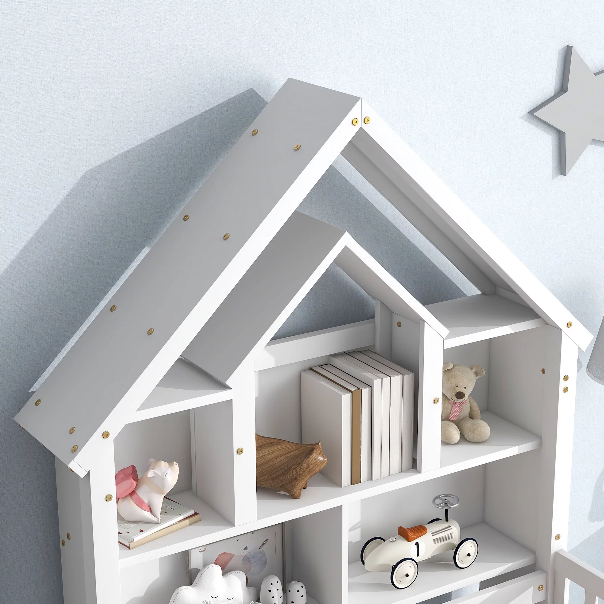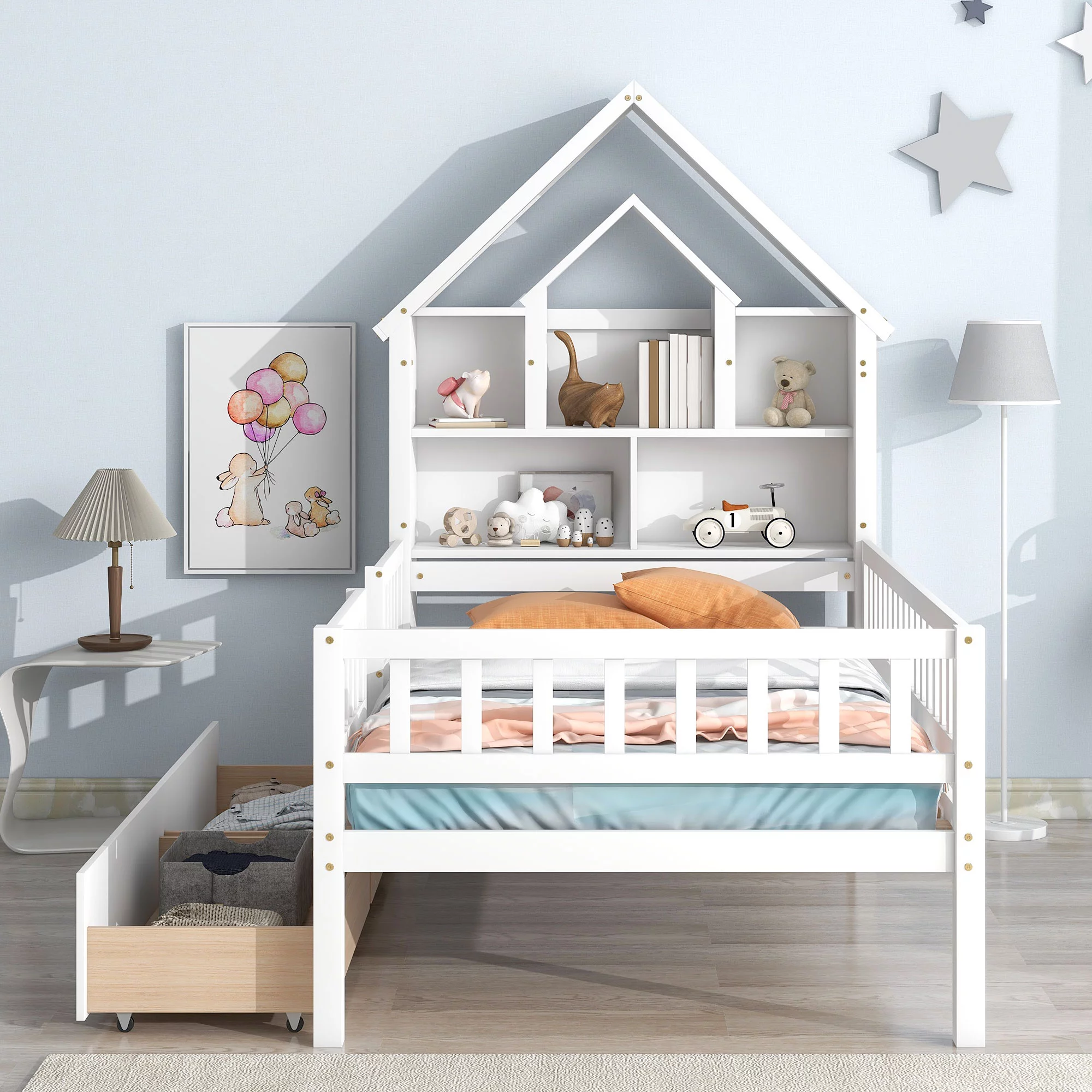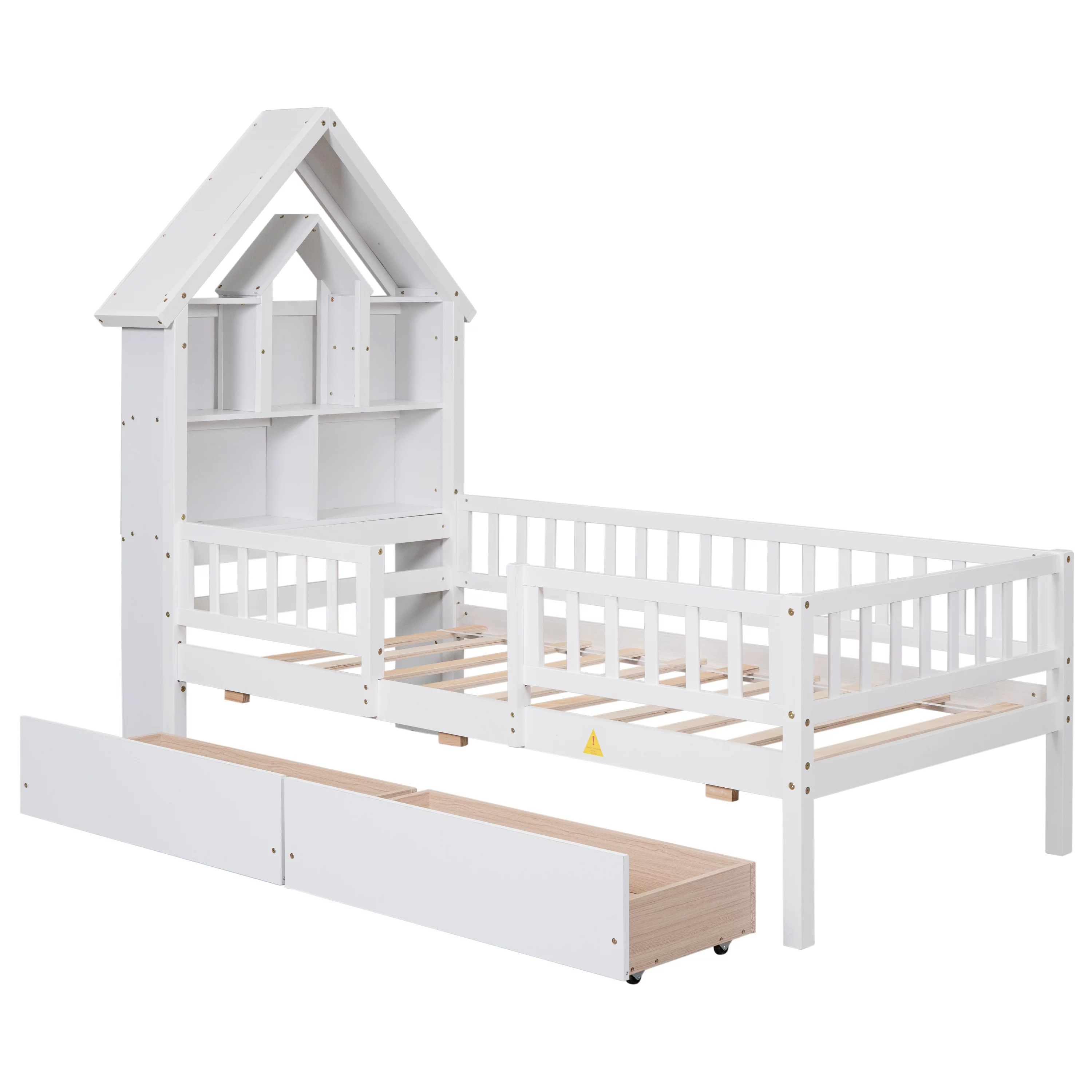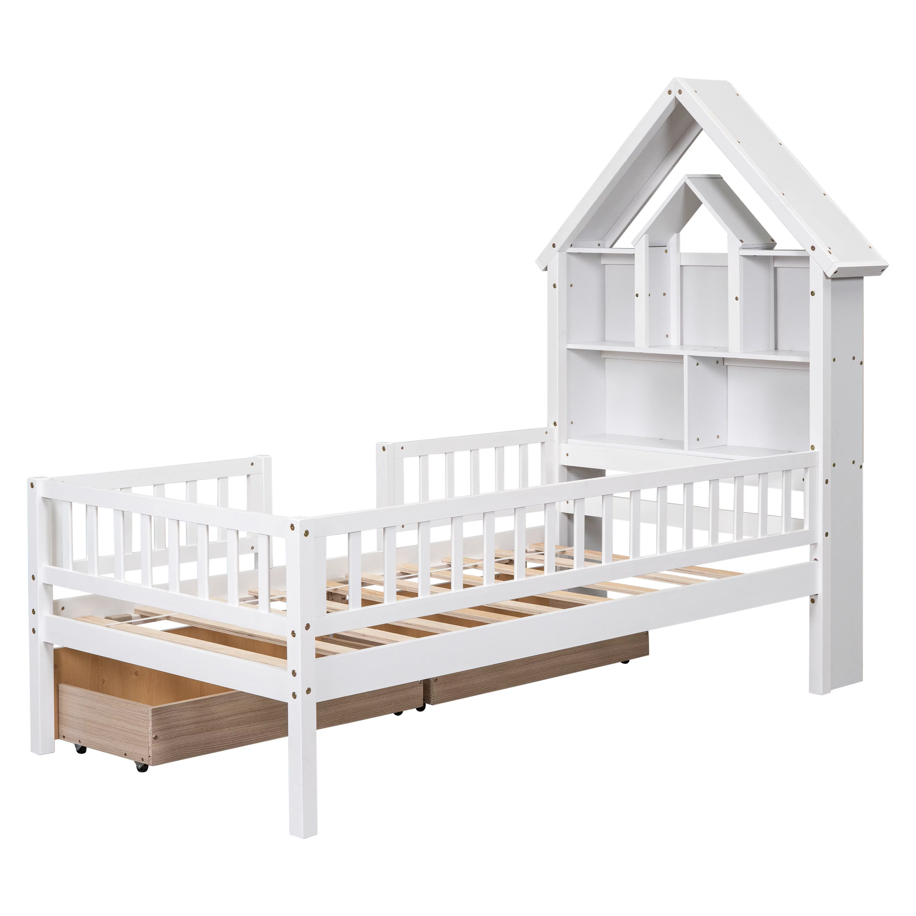 LYPER Twin Size House-Shaped Headboard Bed with Fence Guardrails and Drawers ,White