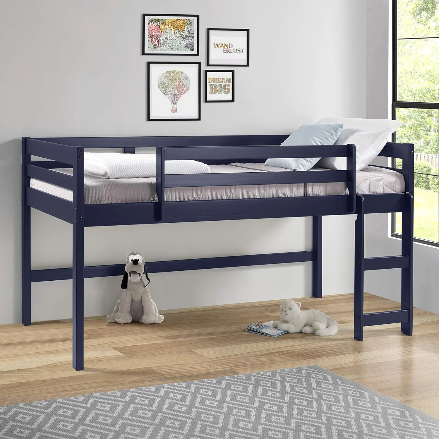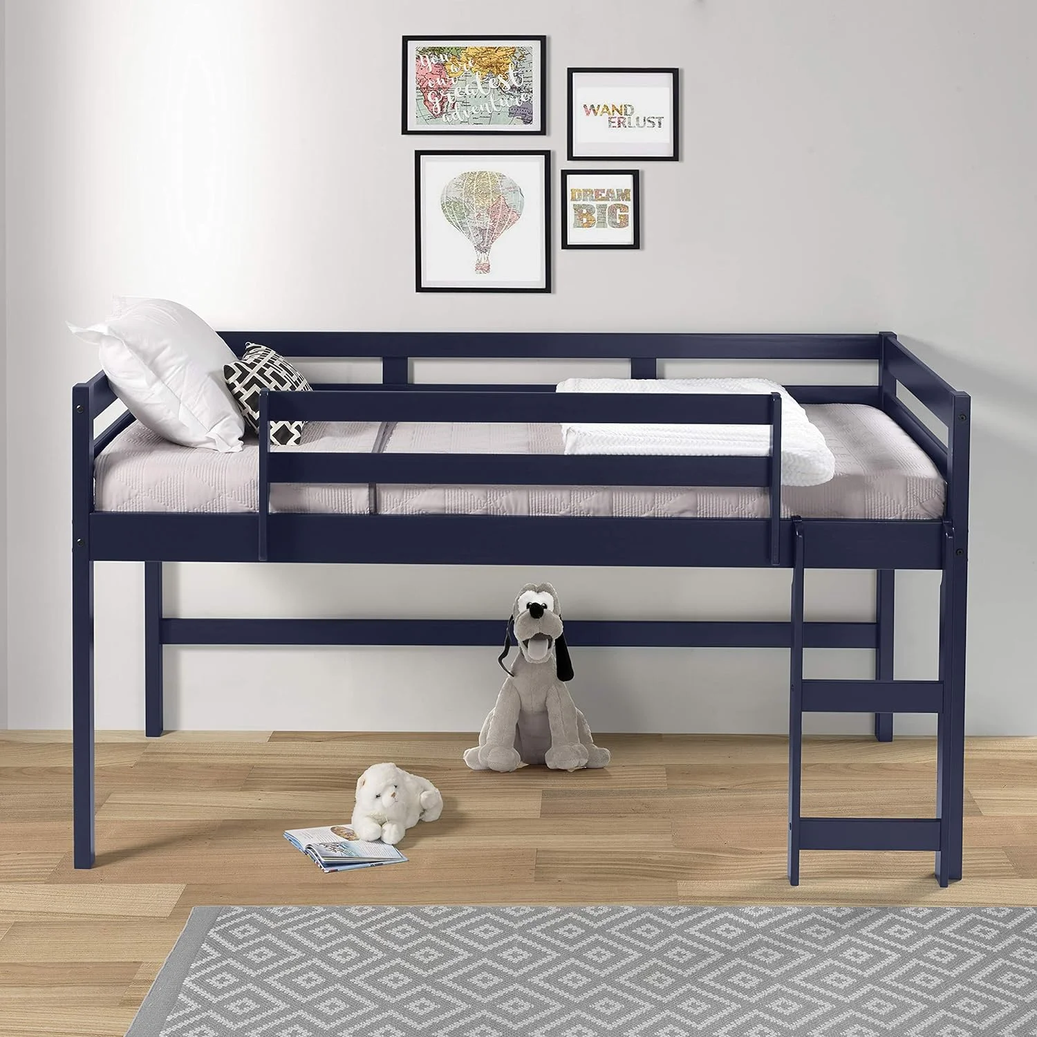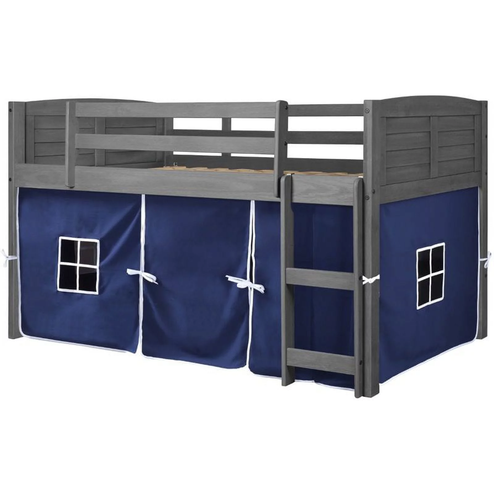 Rosebery Kids Twin Solid Wood Low Loft Bed with Blue Tent in Antique Gray