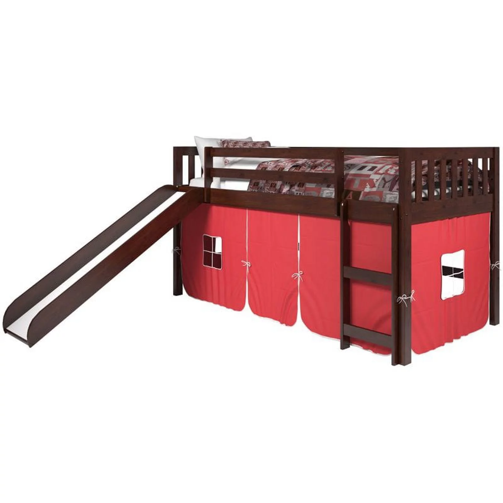 Rosebery Kids Twin Solid Wood Mission Low Loft Bed with Red Tent in Cappuccino