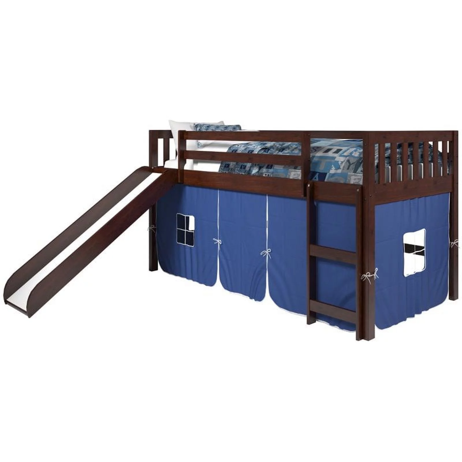 Rosebery Kids Twin Solid Wood Mission Low Loft Bed with Blue Tent in Cappuccino