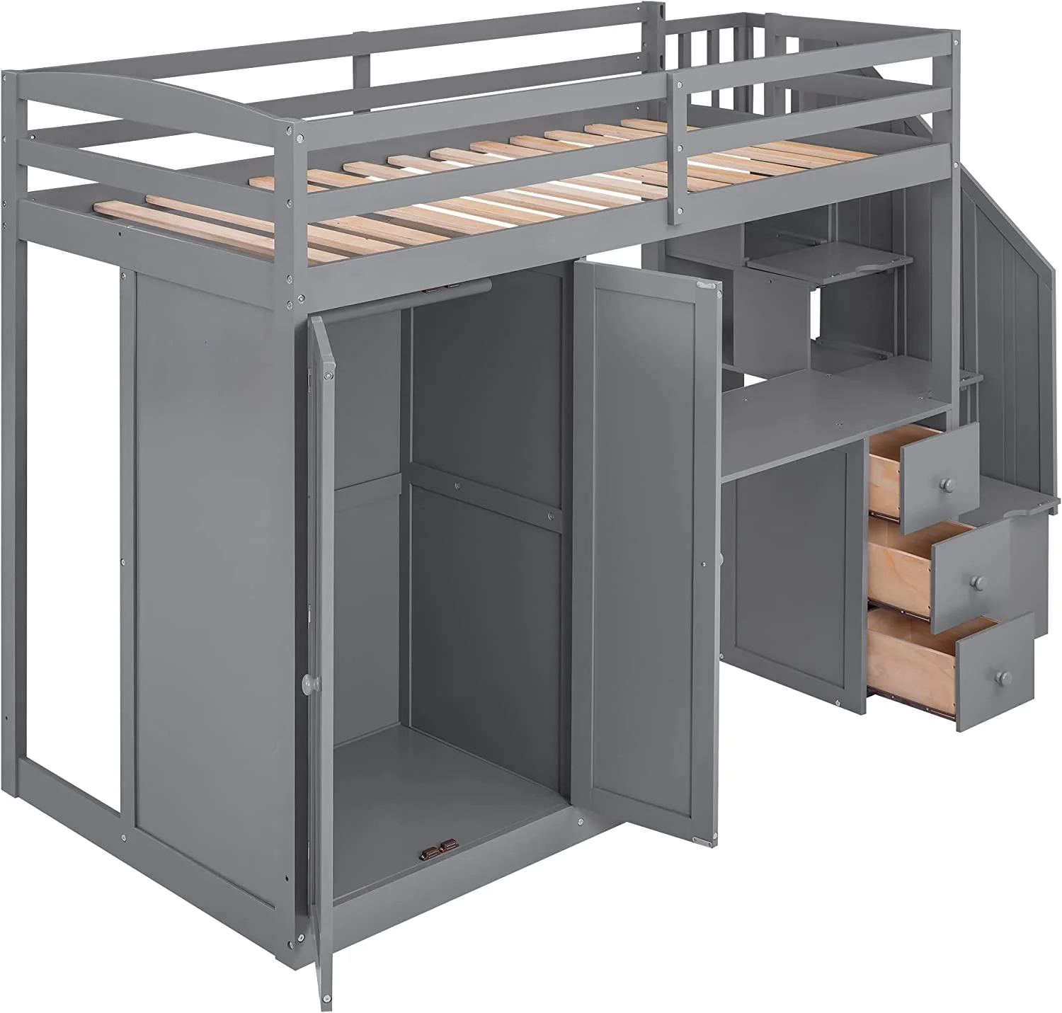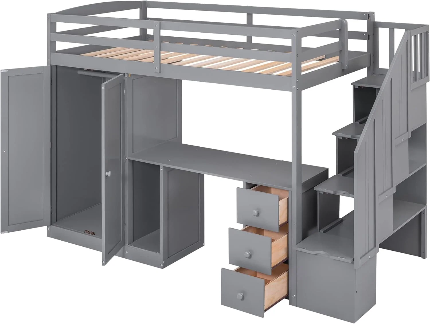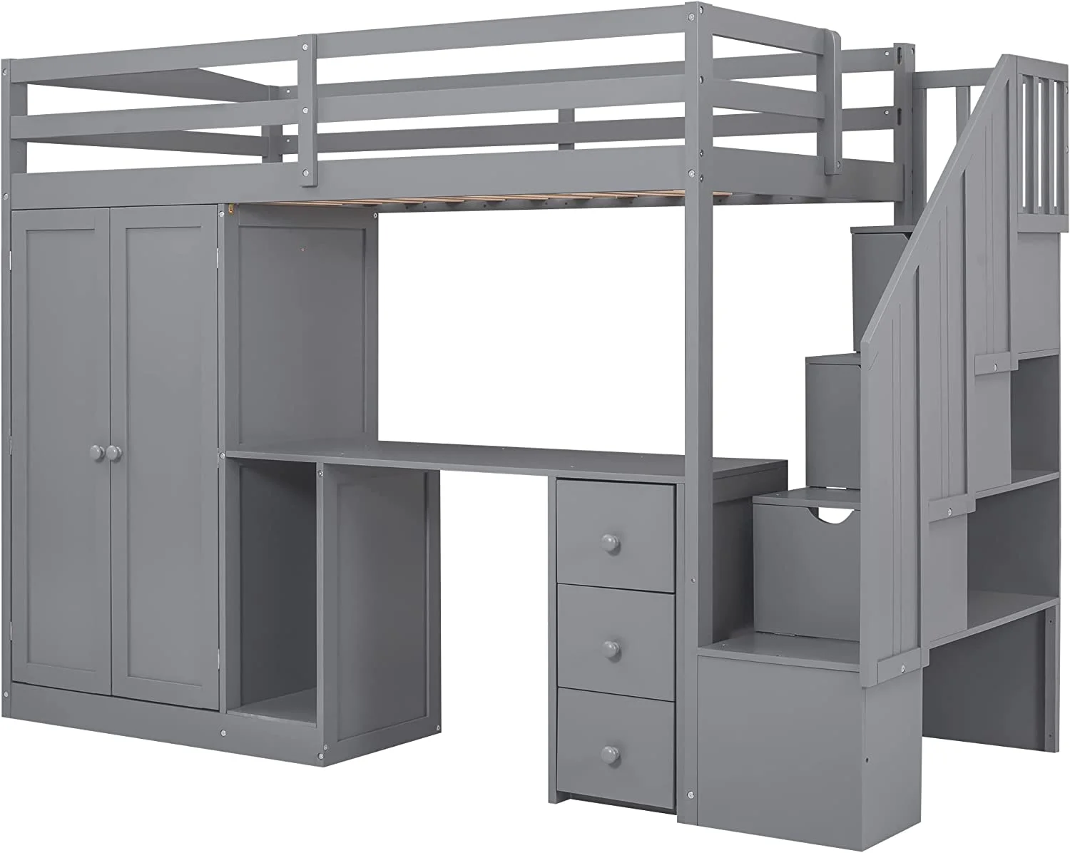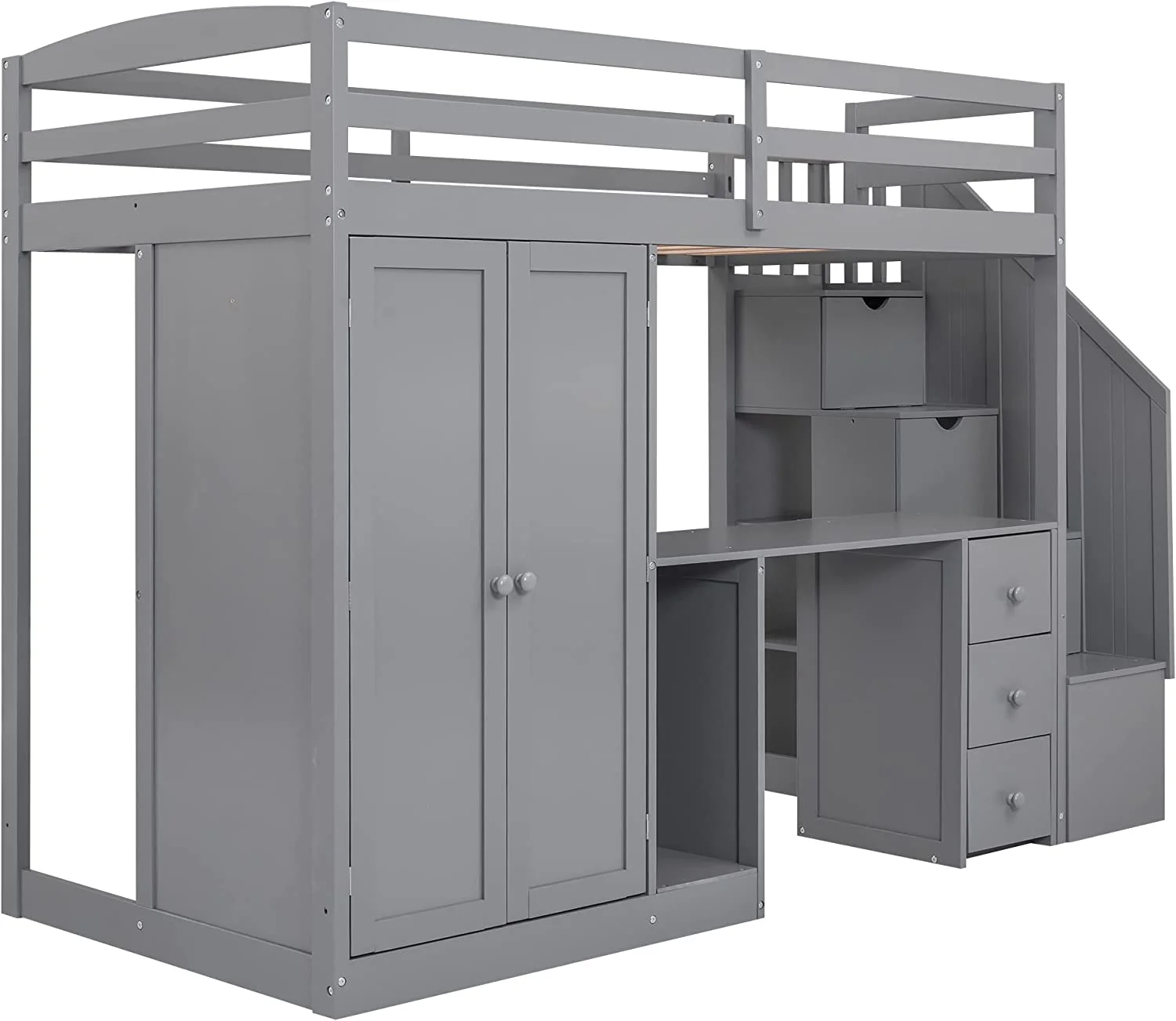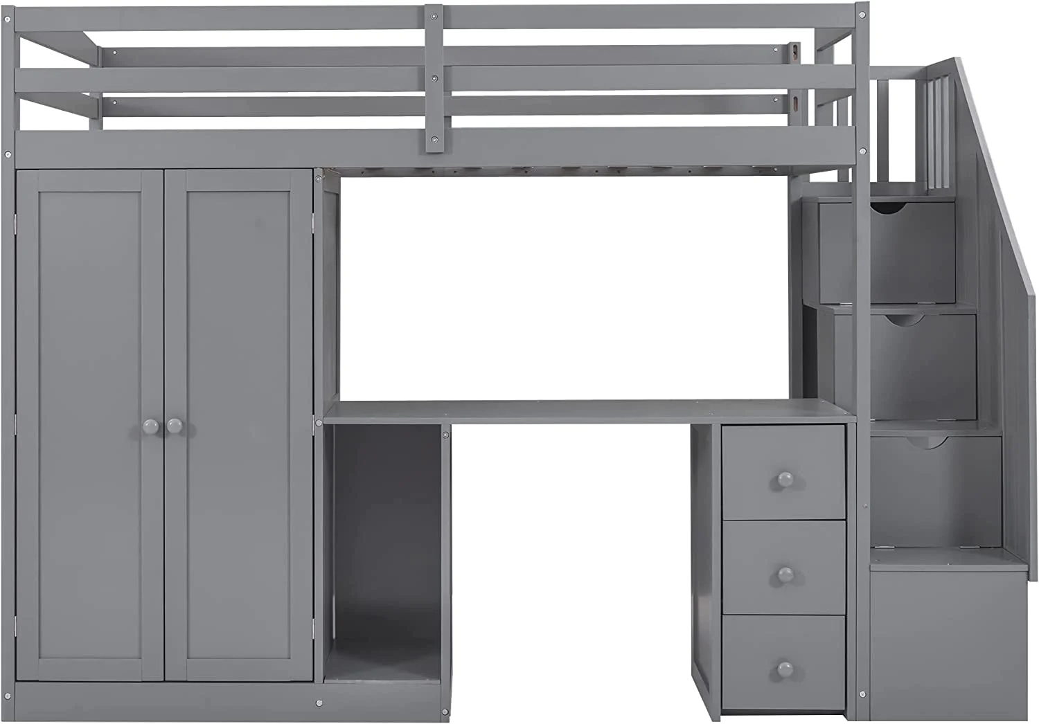 Gray Size Lof Bed Wih Sairs Ad Desk, Woode Wardrobe Sorage Drawers, High Frame For Kids, ees, Aduls Boys Girls,