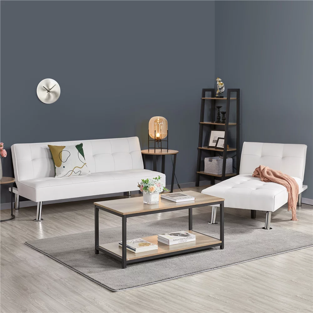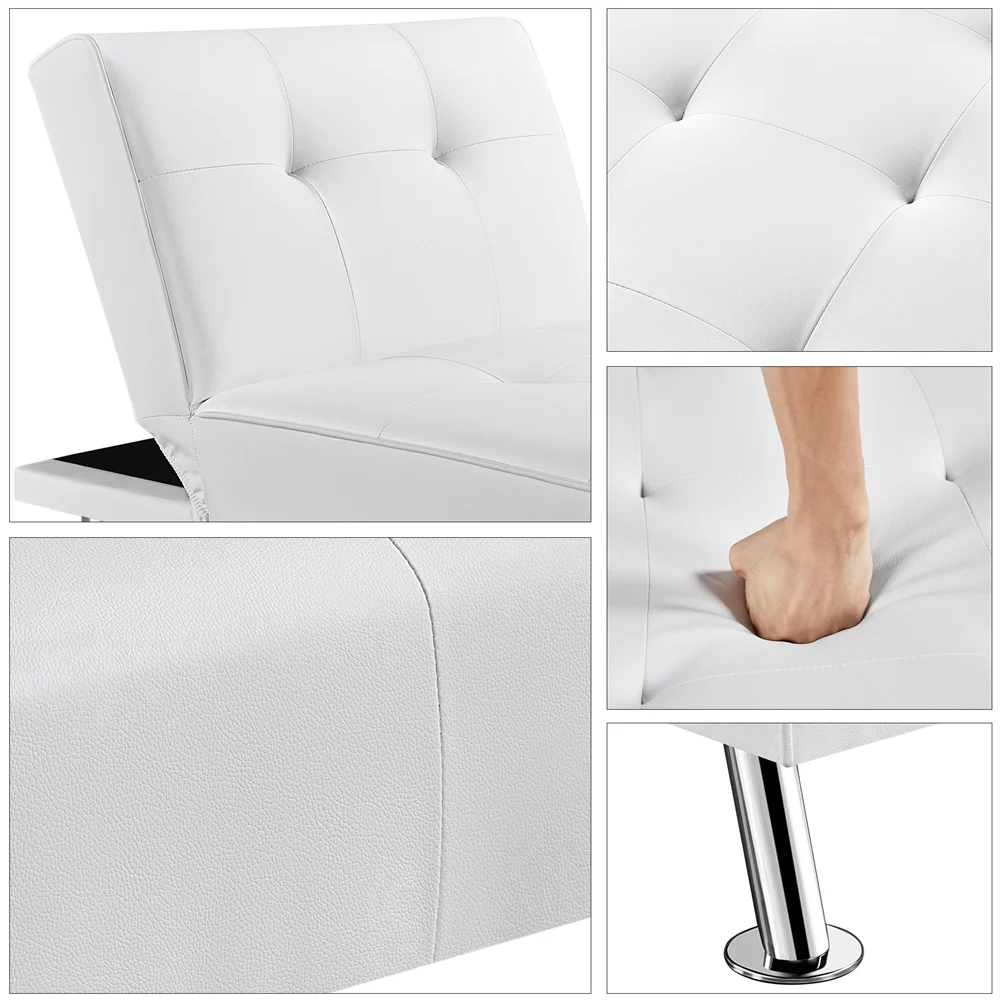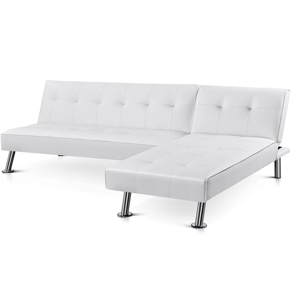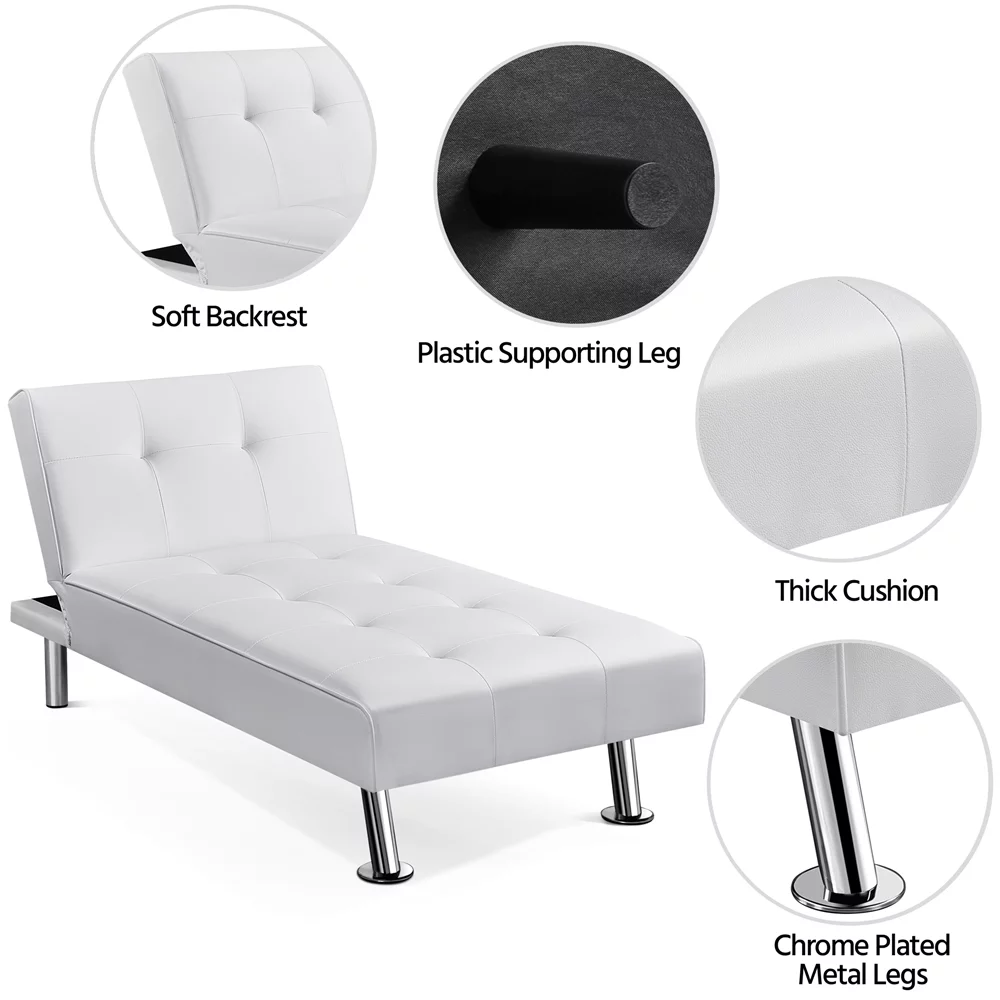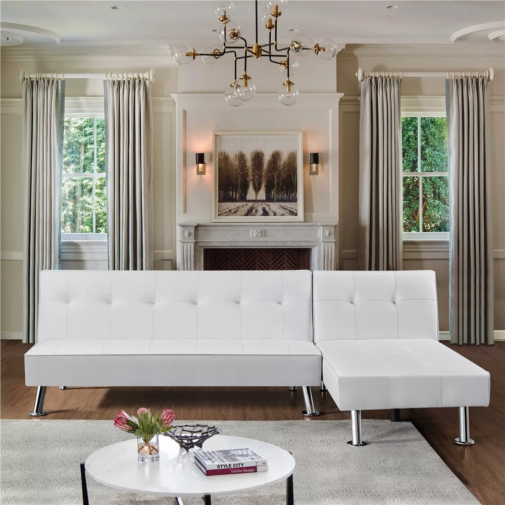 Topeakmart Faux Leather Chaise Lounge+Convertible Futon Sofa Bed with Chrome Metal Legs, White