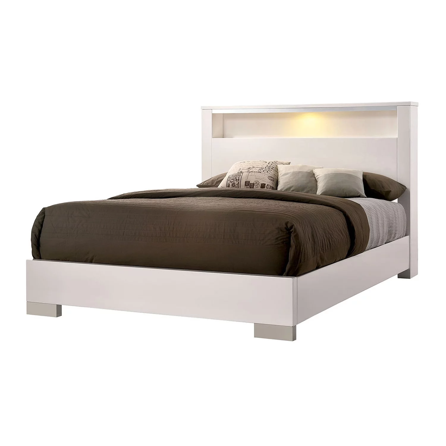Benjara Modern Eastern King Size Bed with Shelved Headboard and LED Light, White
