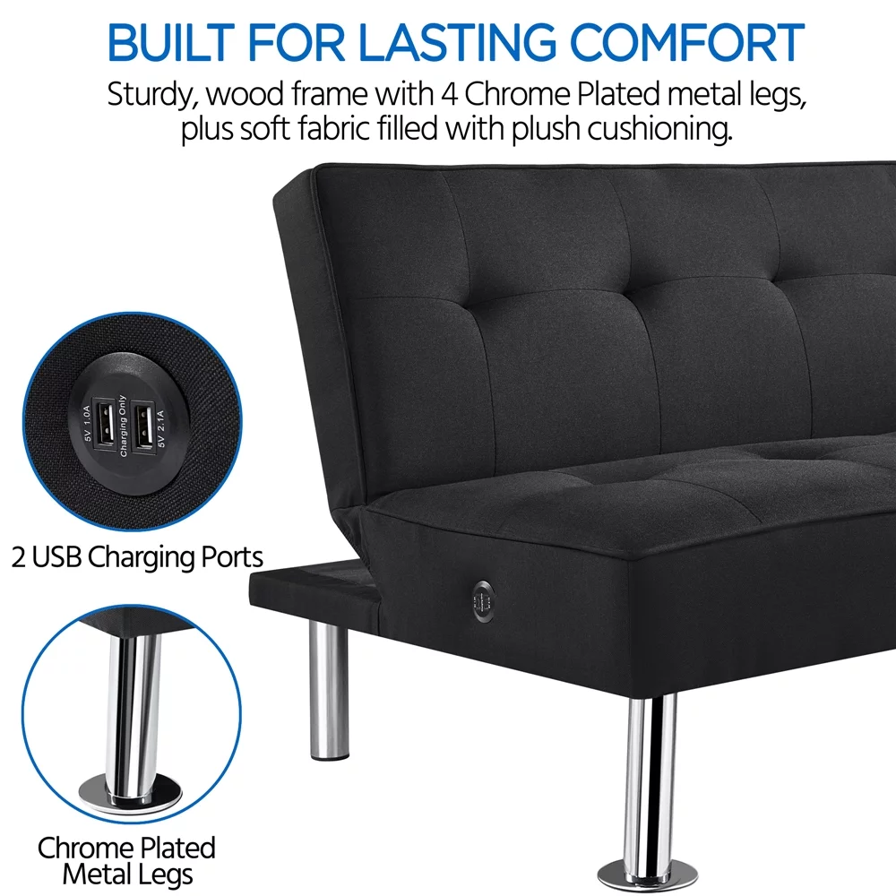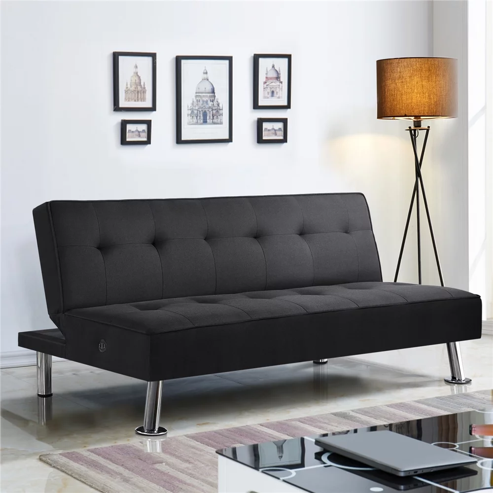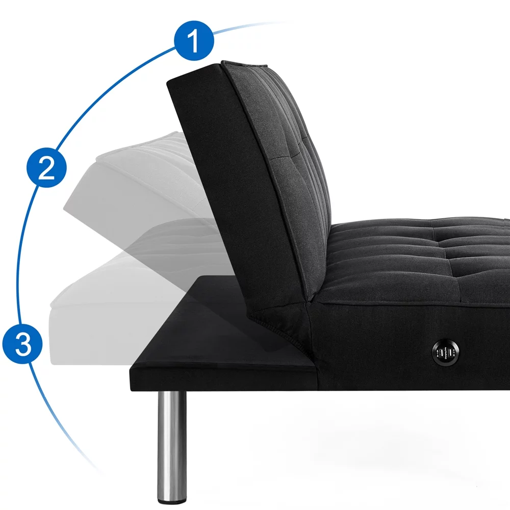 Yaheetech Convertible Futon Sofa Bed w/ USB Ports, 772lb Weight Limit, Black