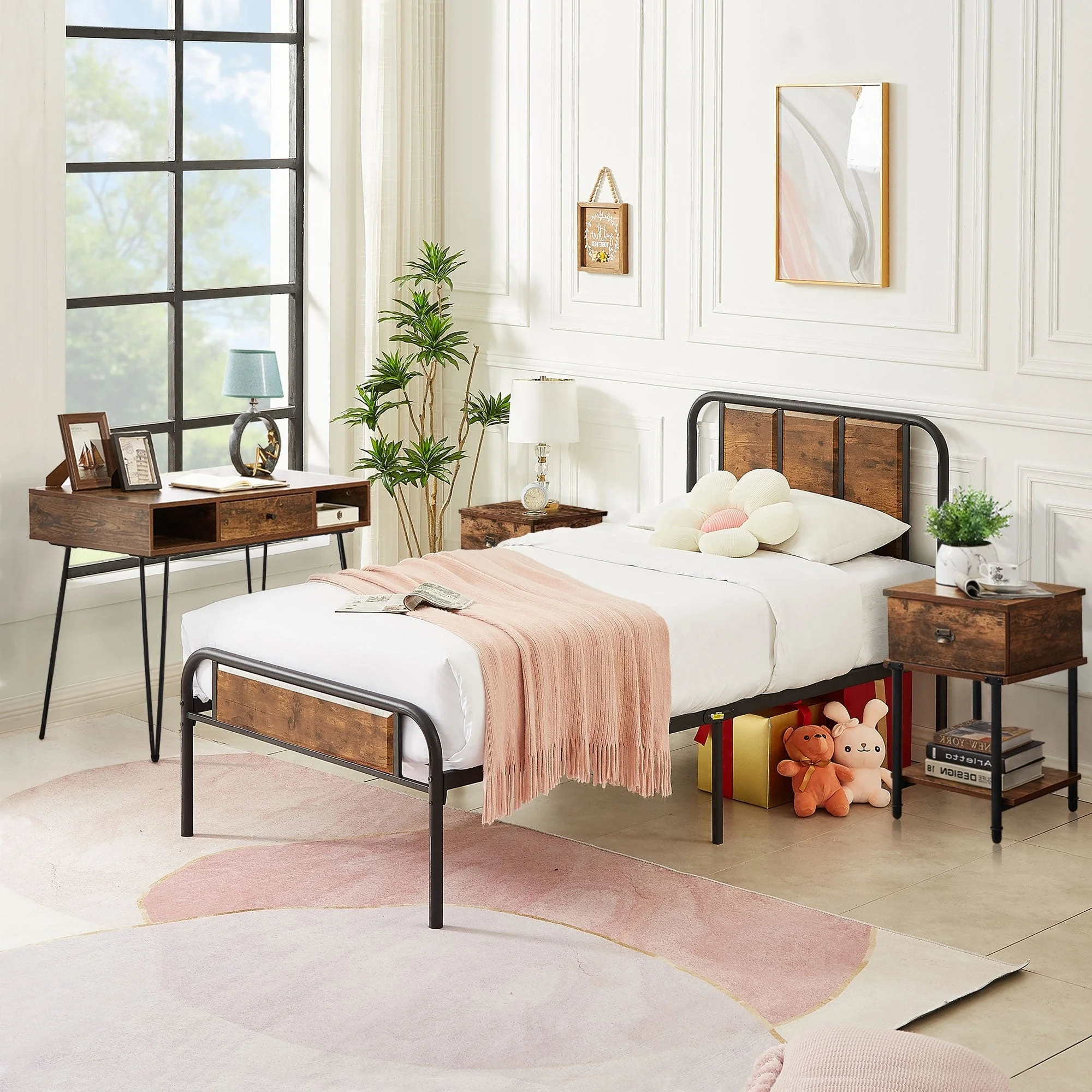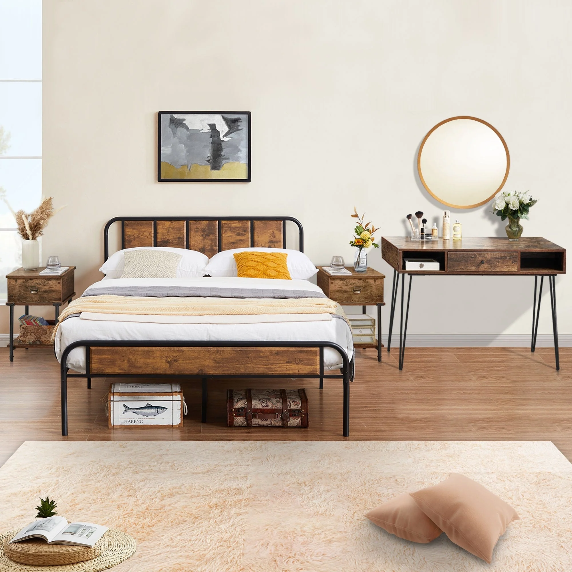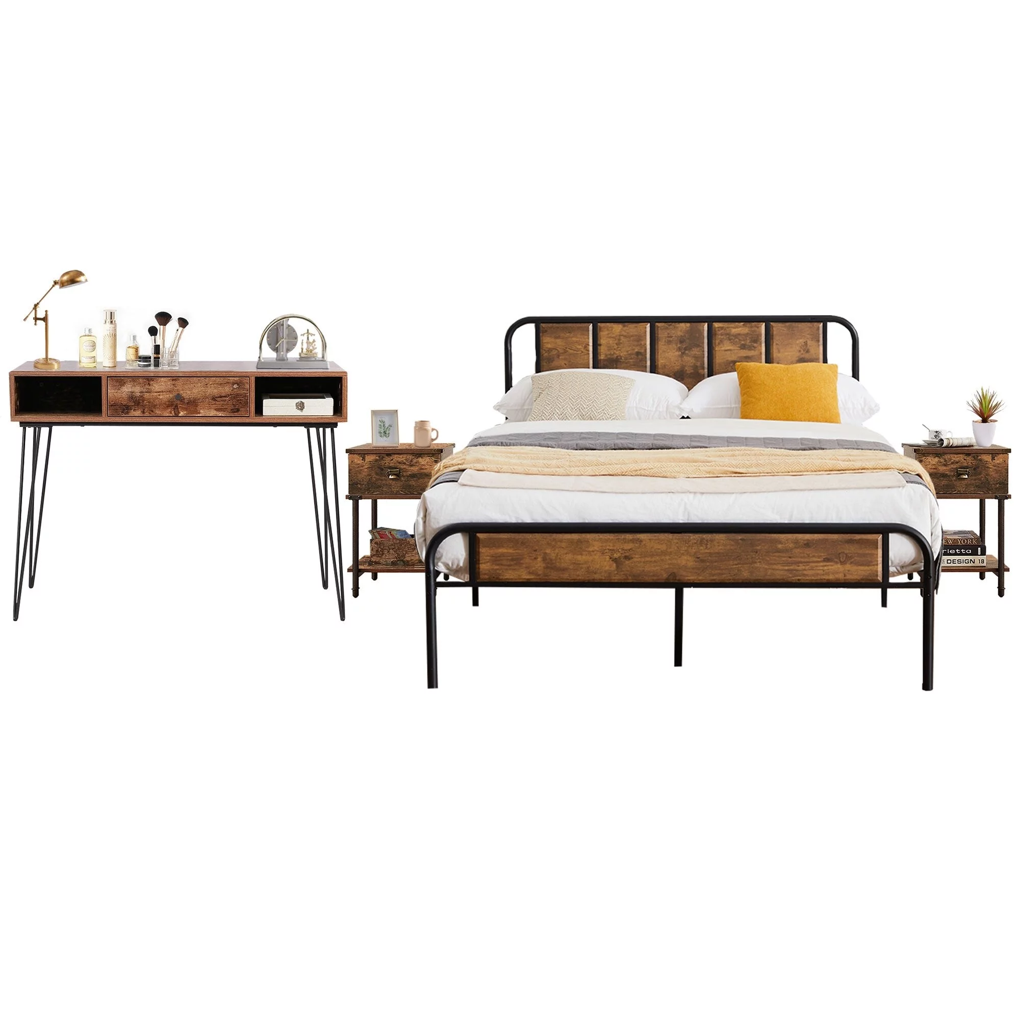 Industrial 4-pieces Bedroom Set Bed Frame Modern Nightstands Set of 2 and Makeup Desk Twin