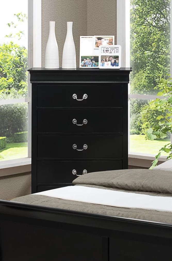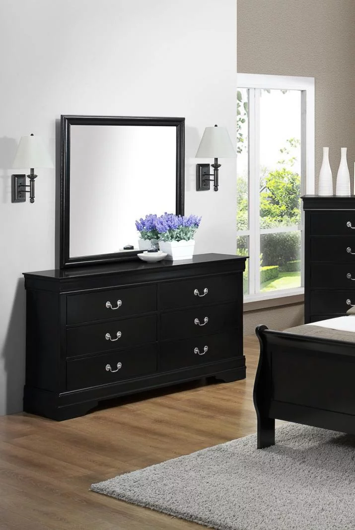 6pc Contemporary Louis Philip Queen Panel Bed Set Dresser Mirror Nightstand Chest Wooden Bedroom Furniture Black Finish