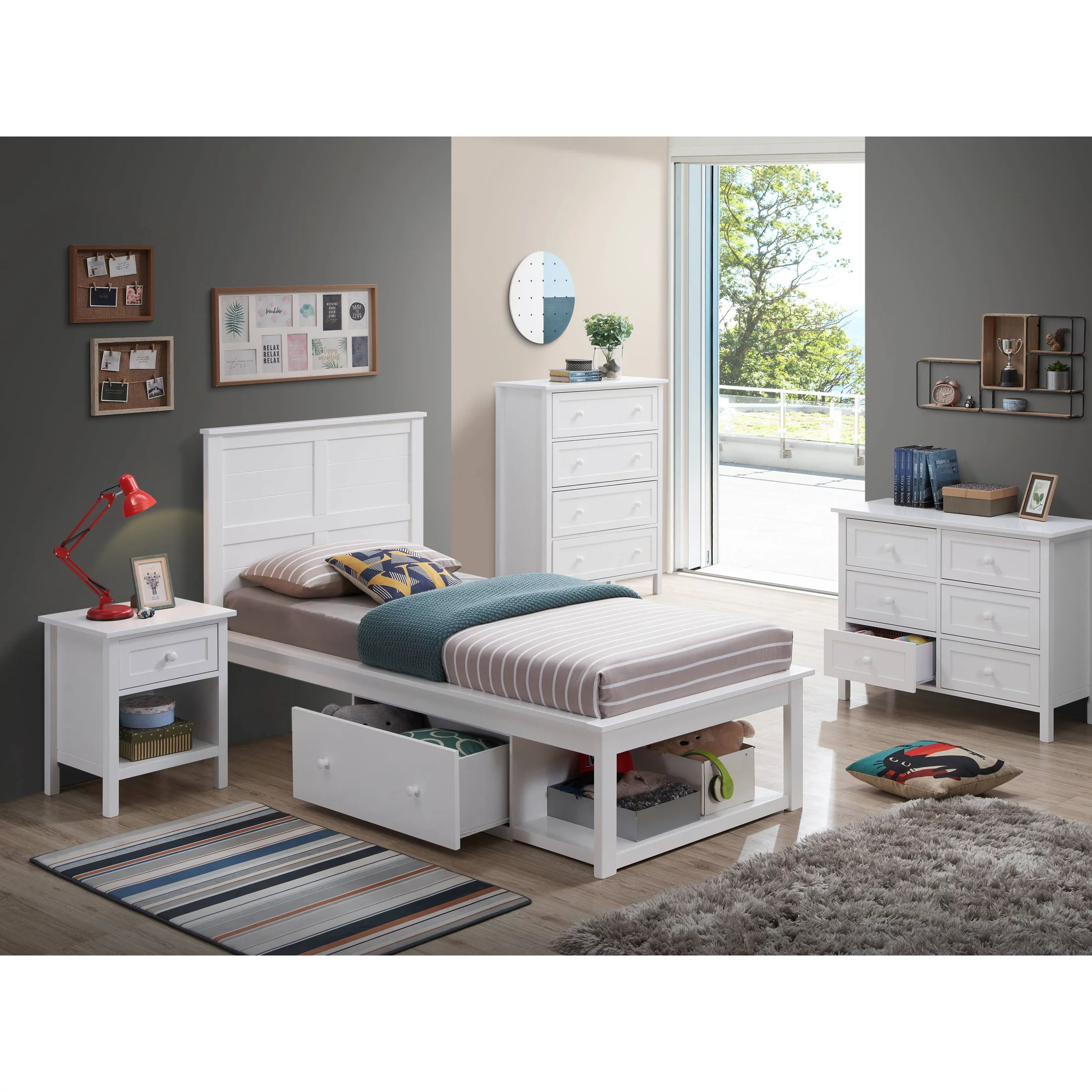 4pc Beautiful White Finish Twin Size Youth Panel Bed Set Wooden Master Bedroom Furniture
