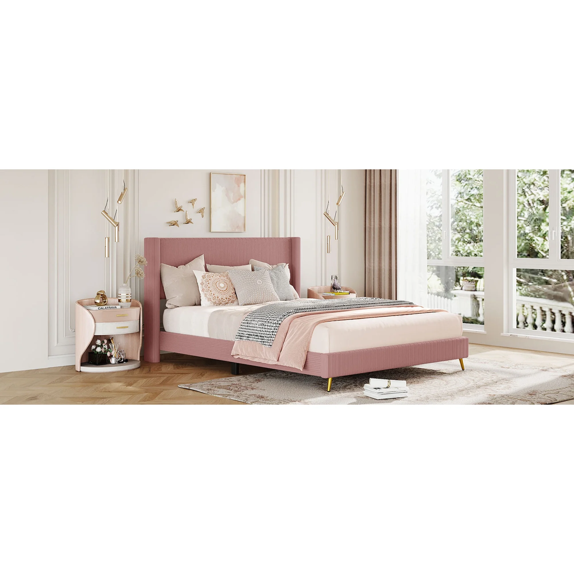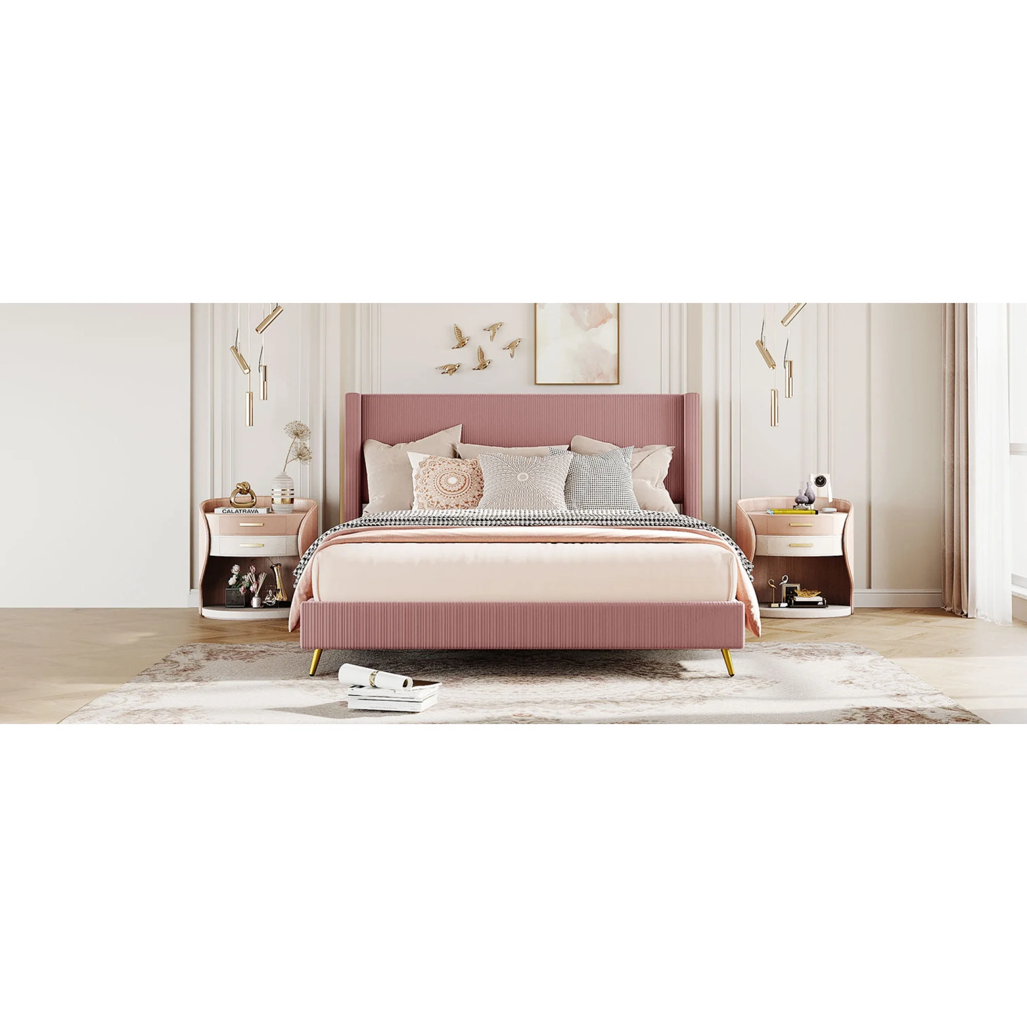 Baxton Studio Abberton Modern and Contemporary Light Pink Velvet and Gold Metal Queen Size Panel Bed