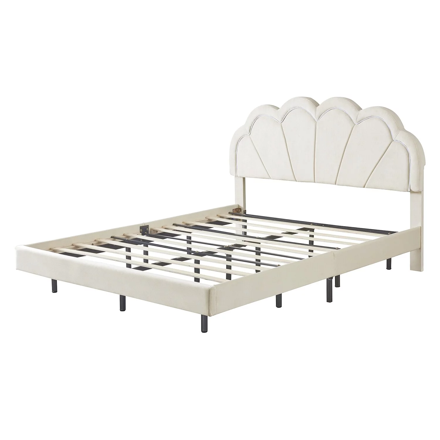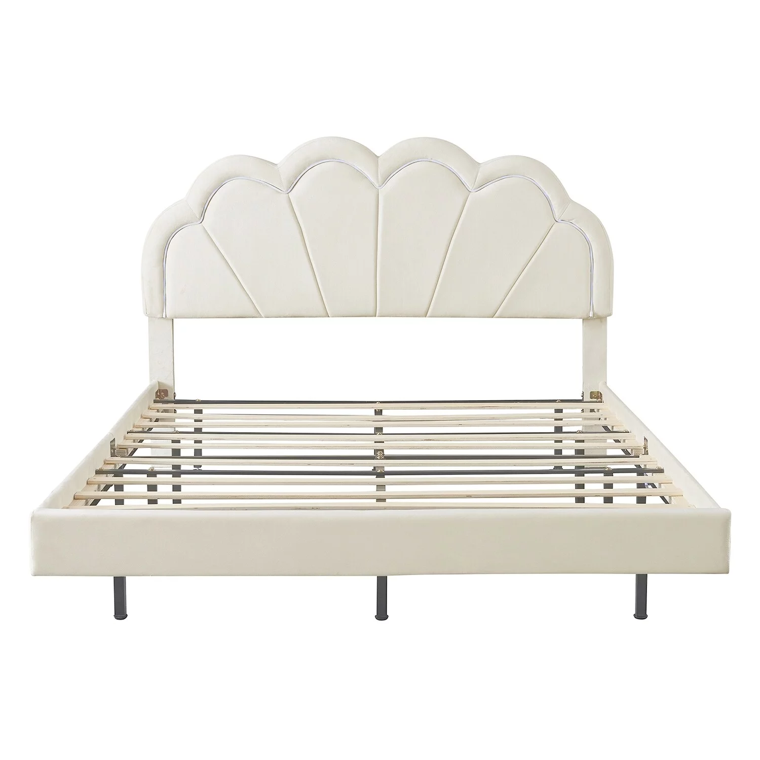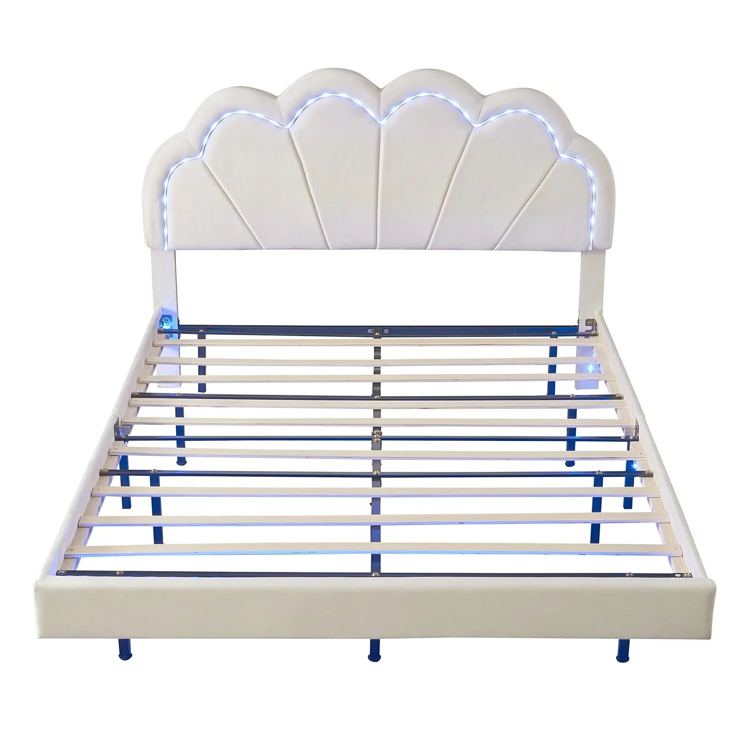 Queen Size Upholstered Smart LED Bed Frame with Flowers Headboard Beige