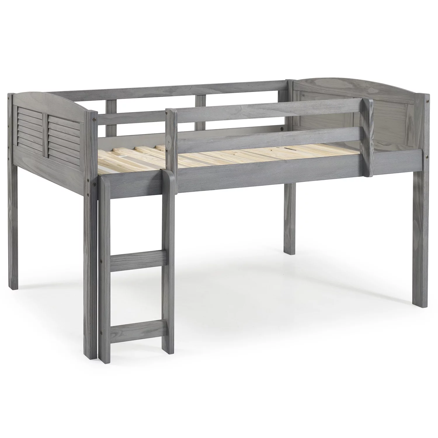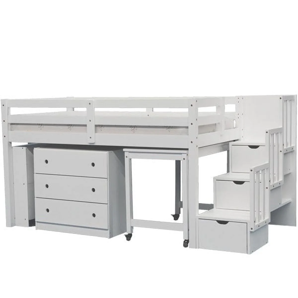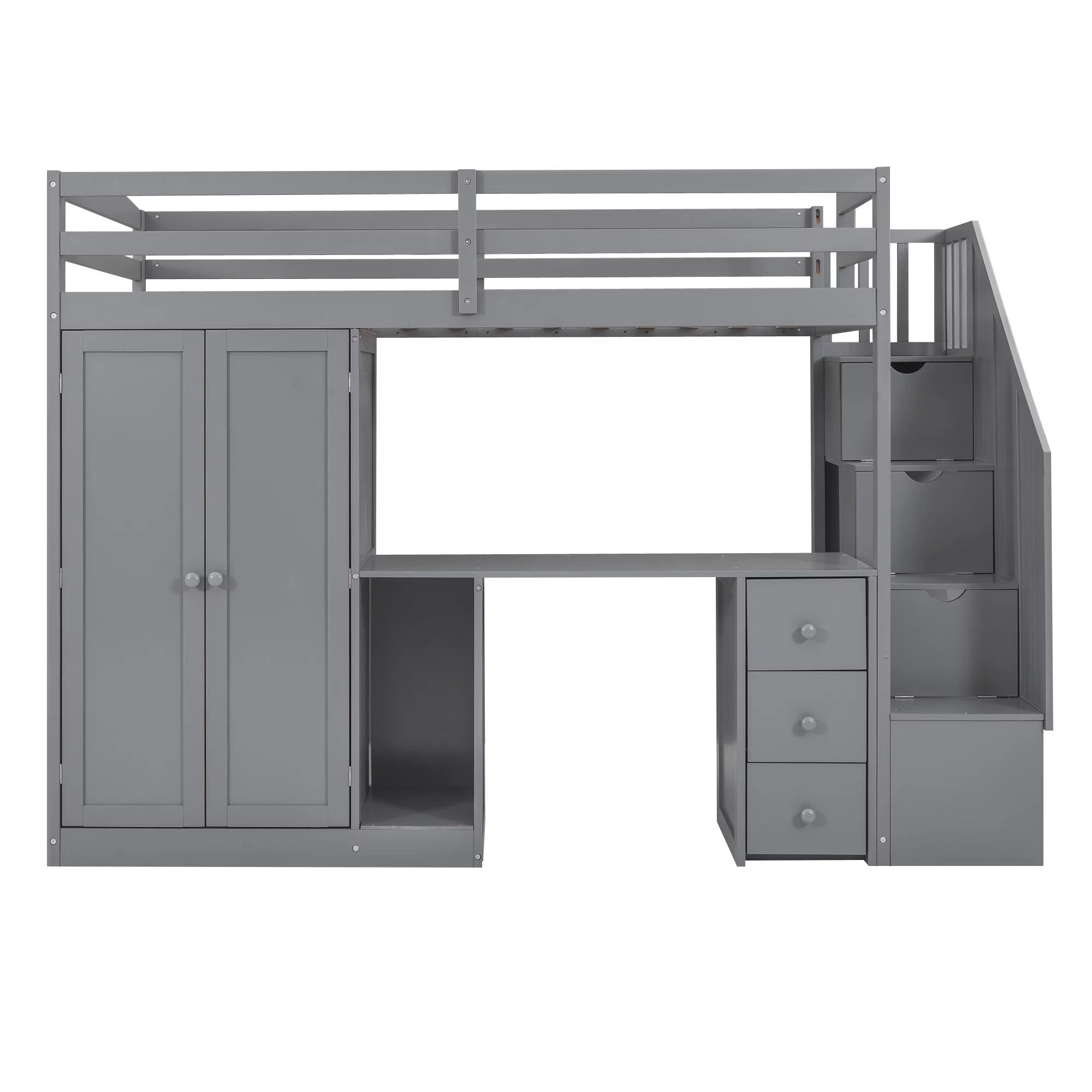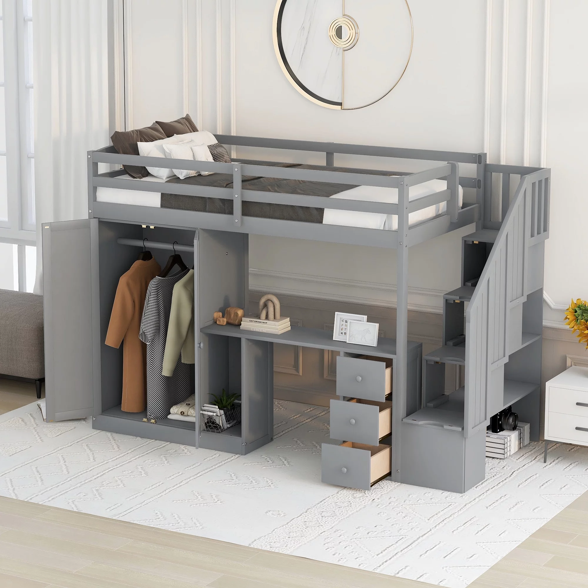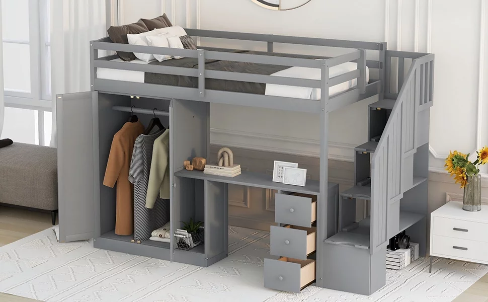 Euroco Twin Size Pine Wood Loft Bed with Desk, Drawers and Wardrobe for Kids Room, Storage Staircase, Sapce-Saving Shelf, Gray