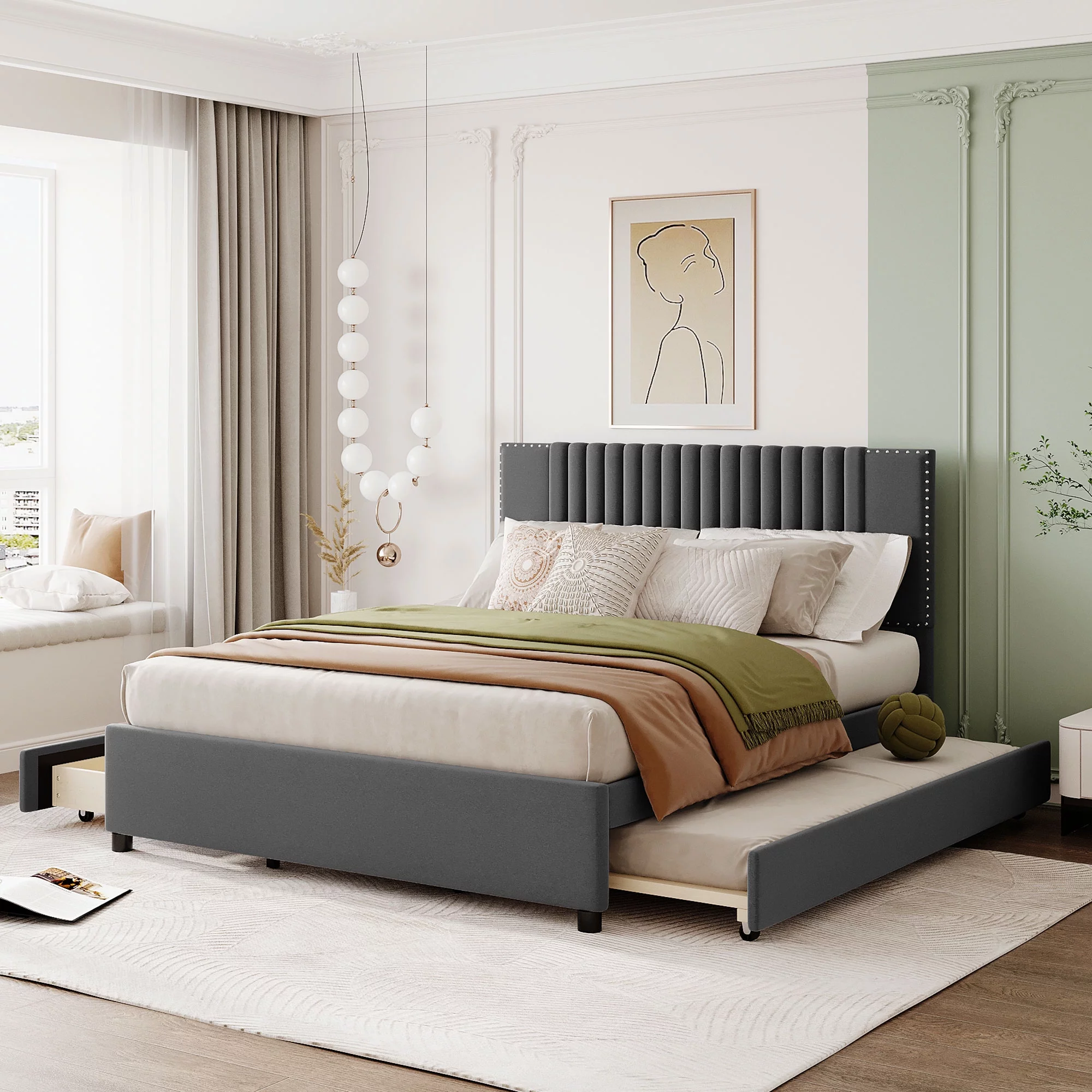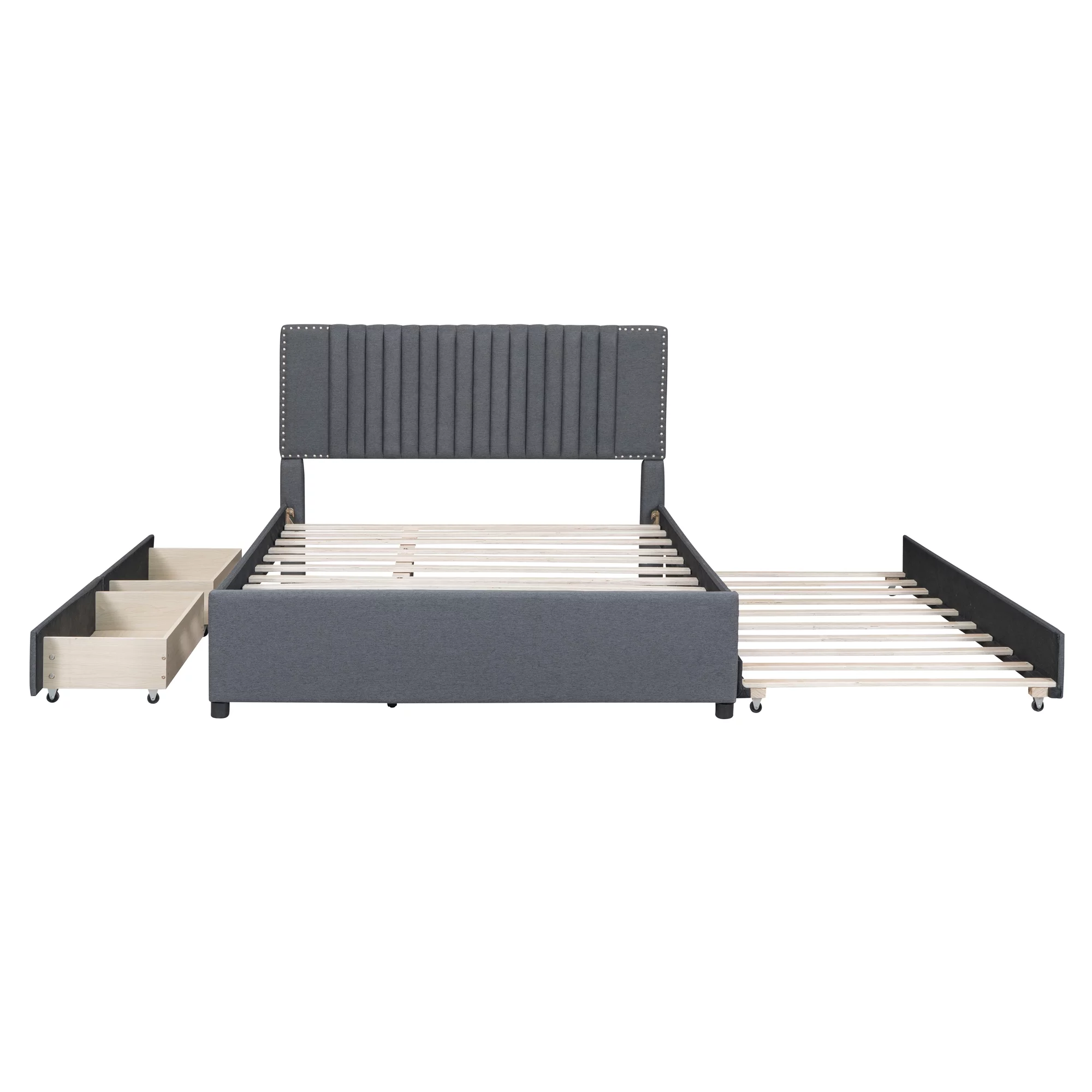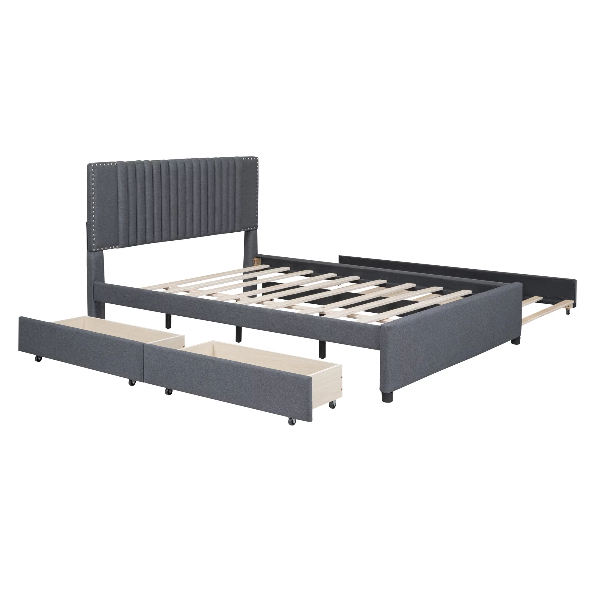 CoSoTower Queen Size Upholstered Platform Bed with 2 Drawers and 1 Twin XL Trundle, Classic Headboard Design, Gray