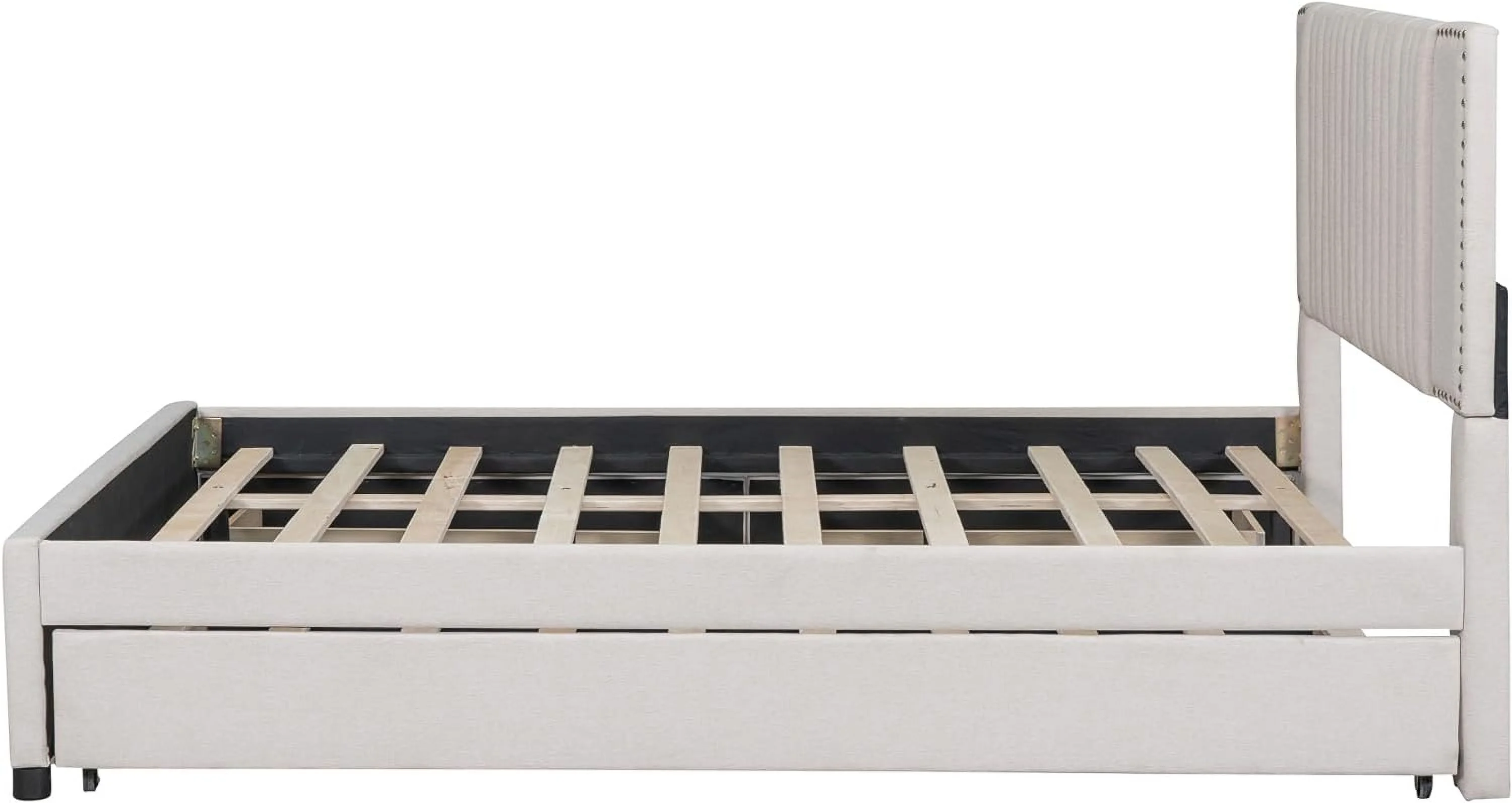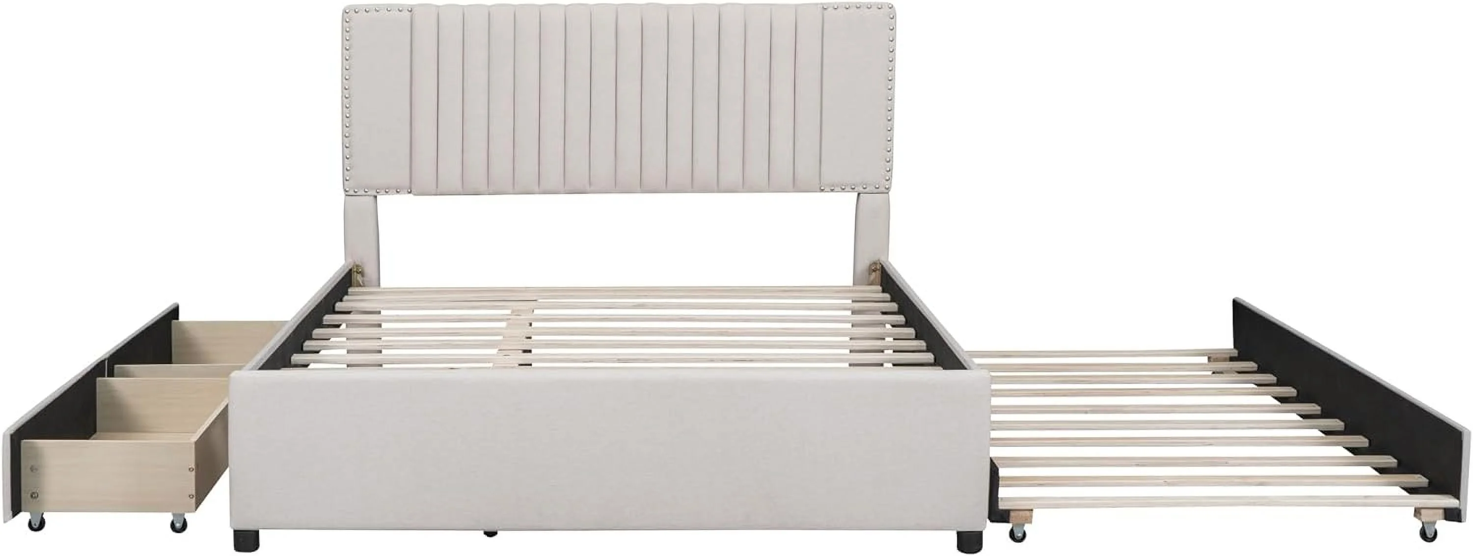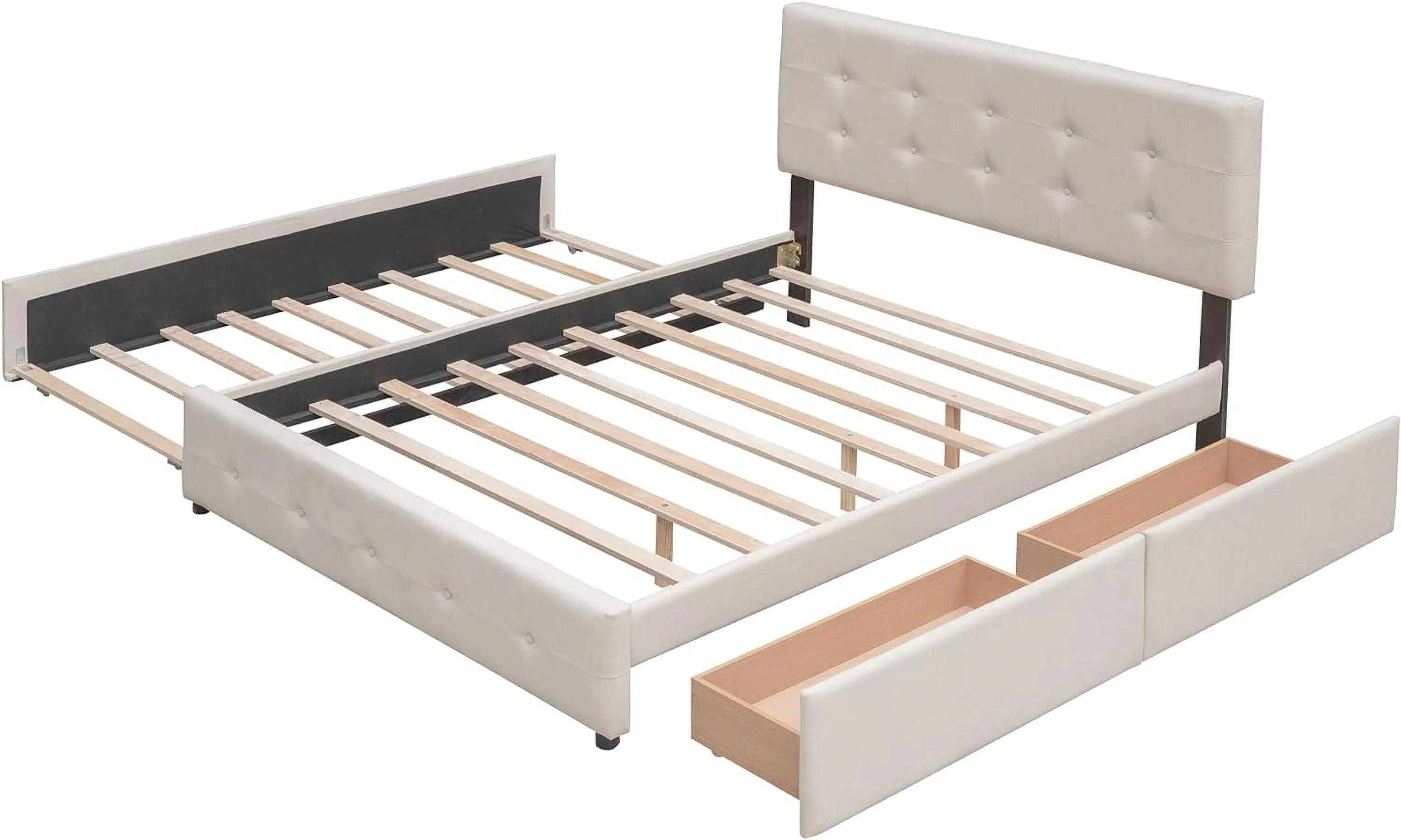Quee Size Platform Bed With XL Trudle Ad Drawers, Lie Upholstered Bed Frame With Tufted Headboard, o Box Sprig eeded, Beige