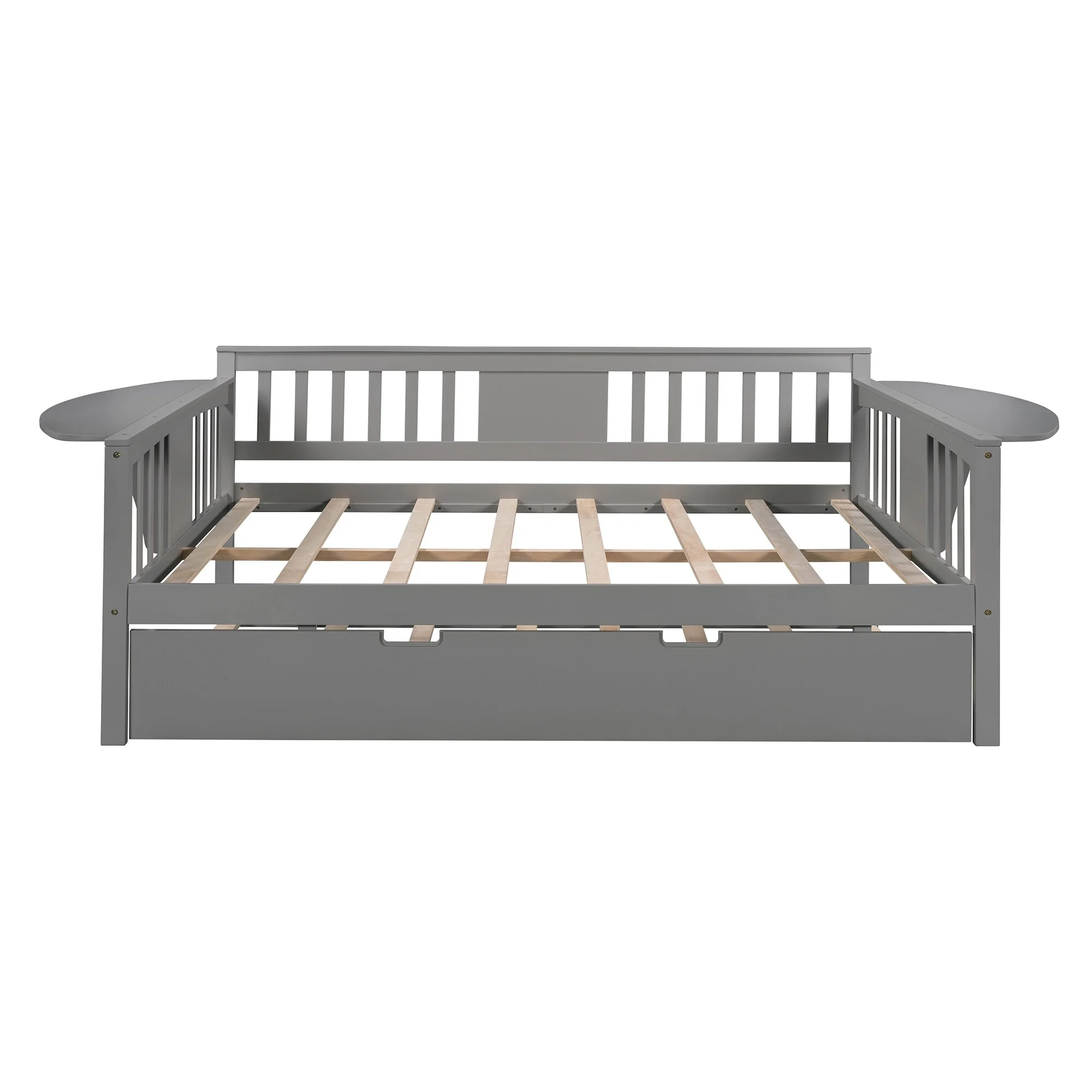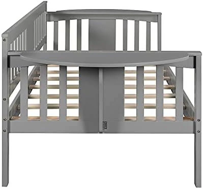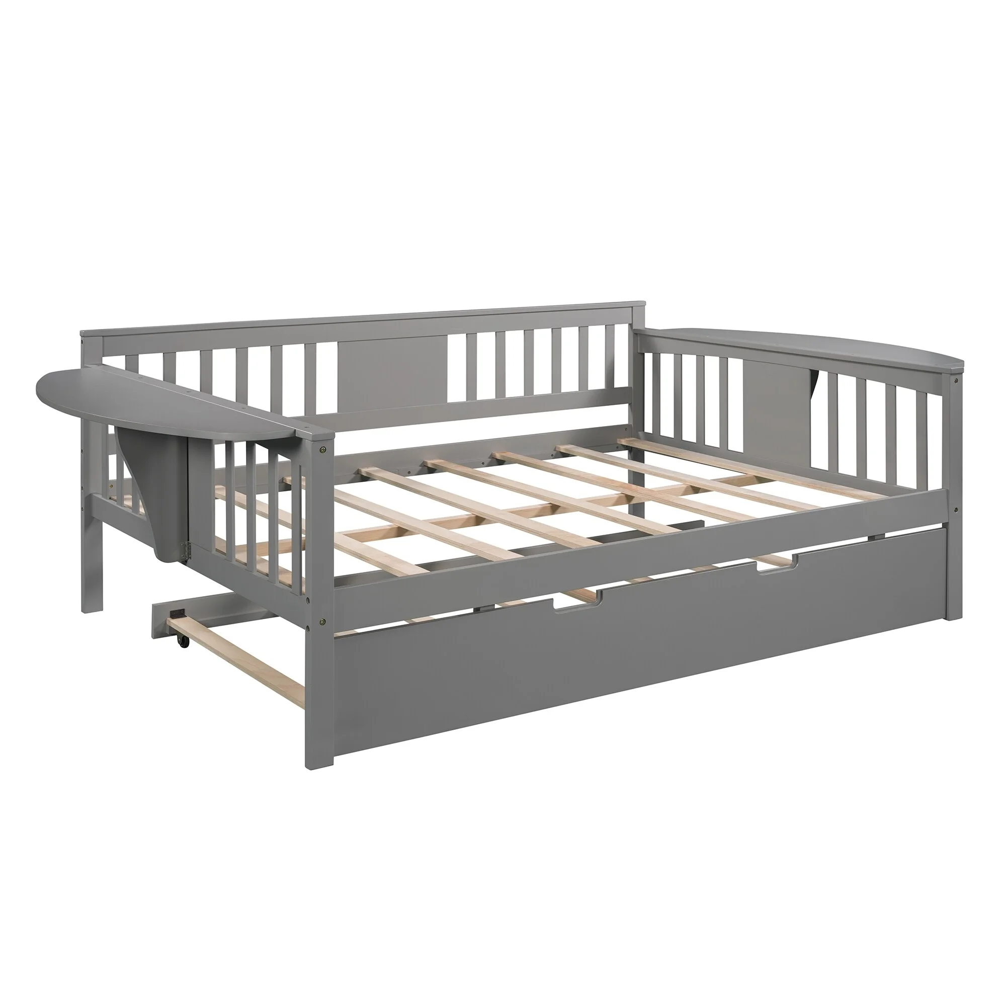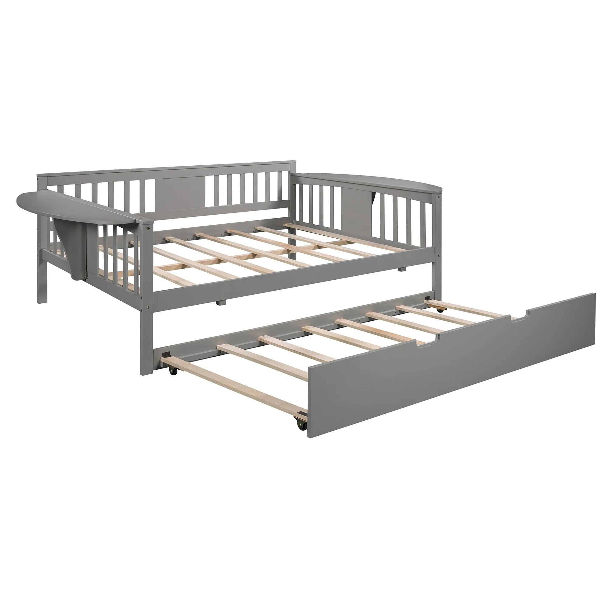 Dual-use Full Sofabed Daybed with 1 Twin Trundle, Rails and 2 Extra Connected Small Coffee Table Shelf, Grey