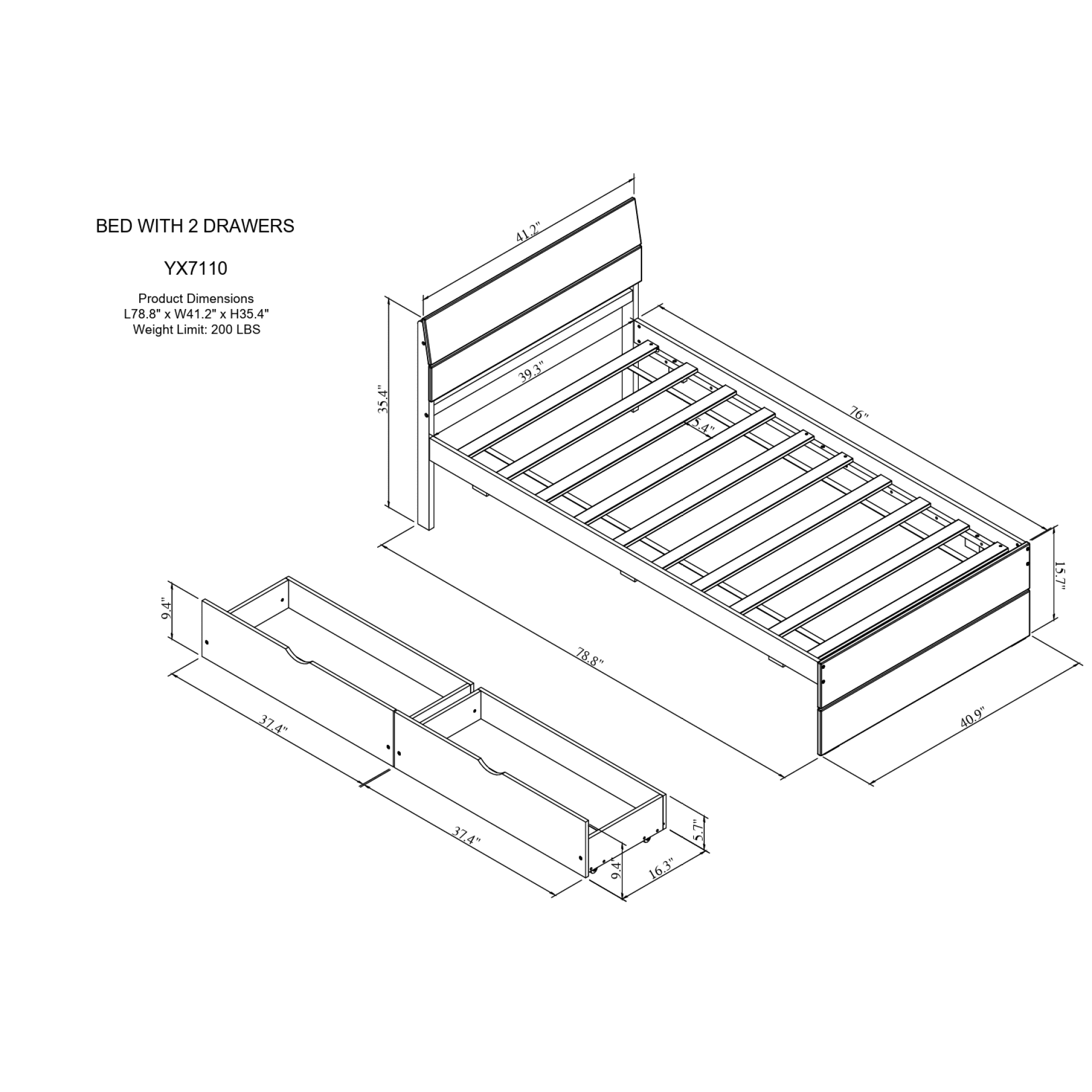 Modern Twin Bed Frame With 2 Drawers in White High Gloss and Light Oak Color