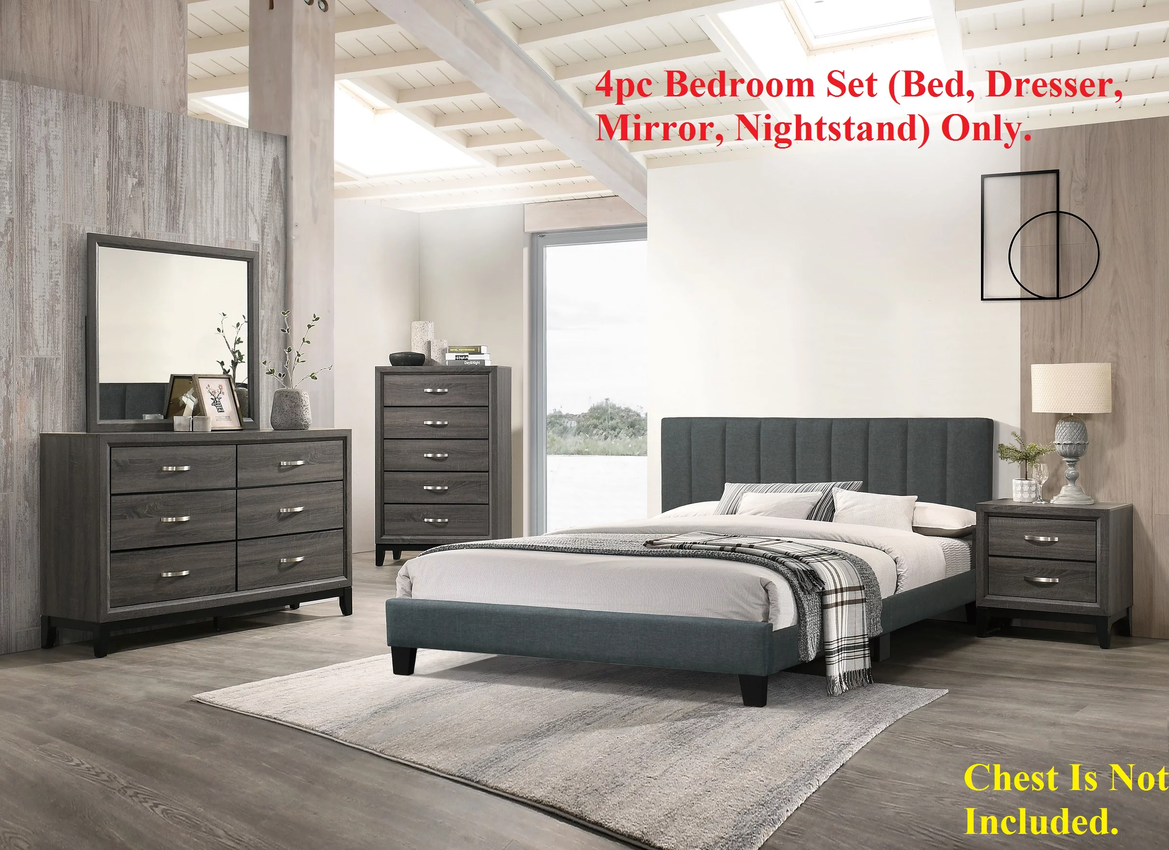 Modern Simple Bedroom Furniture 4pc Set Charcoal Full Size Bed Dresser Mirror Nightstand Plywood Extended Drawers Dresser