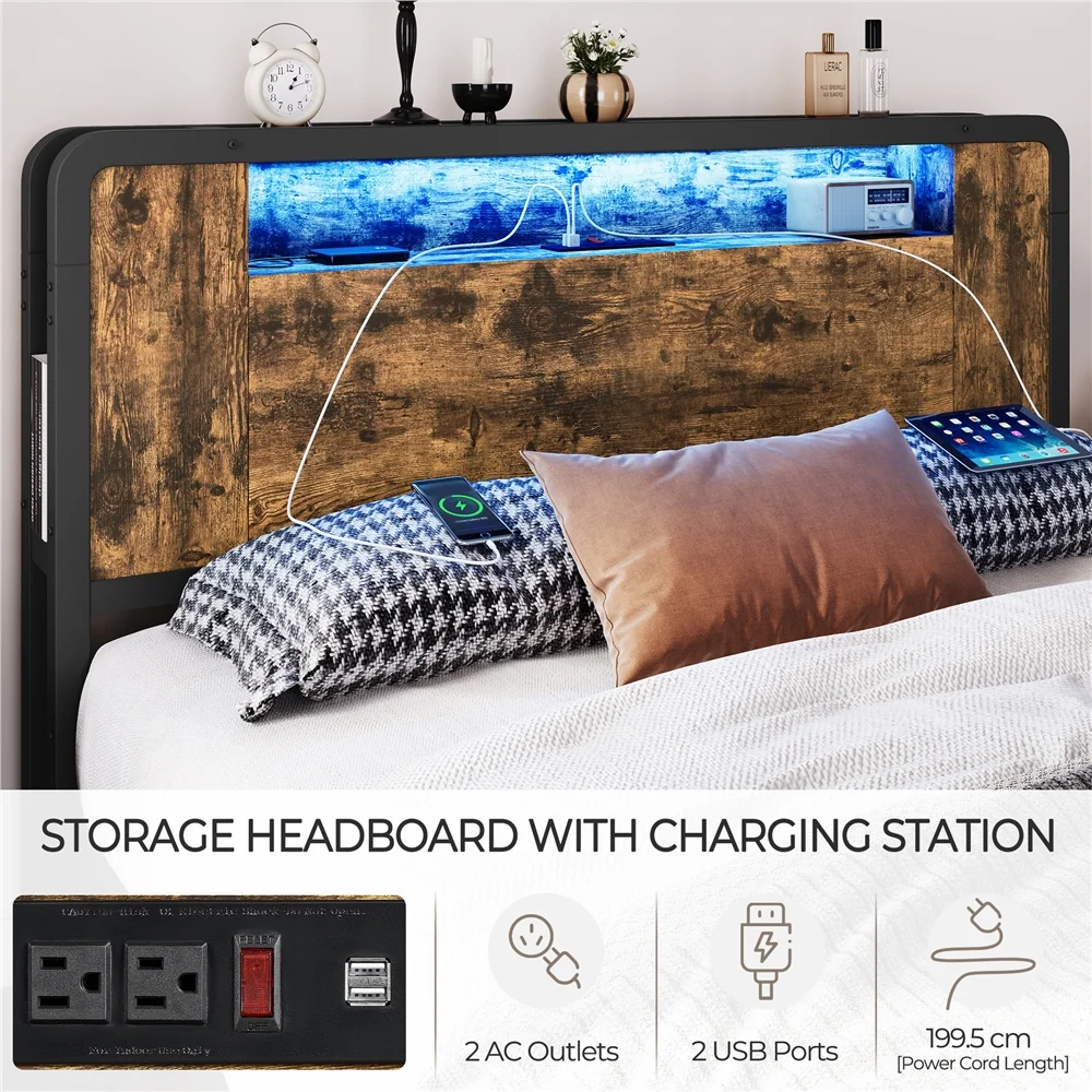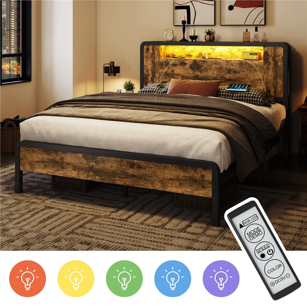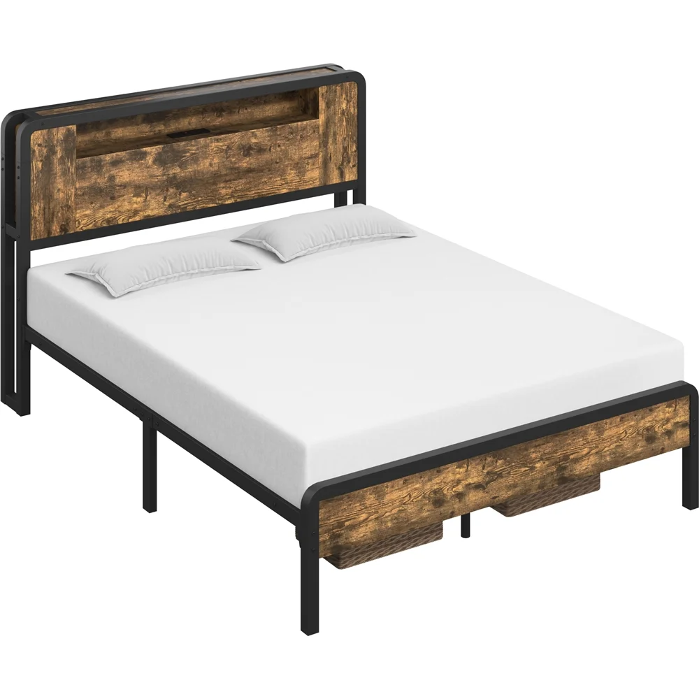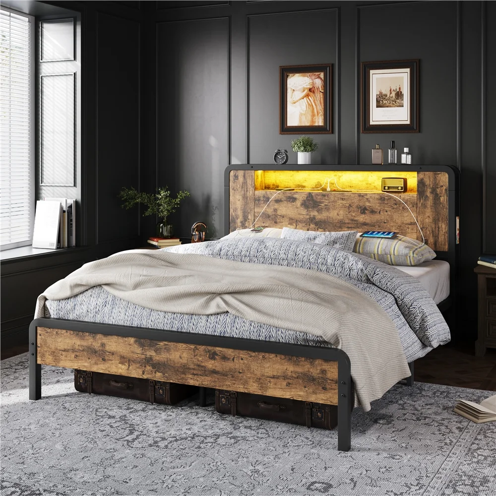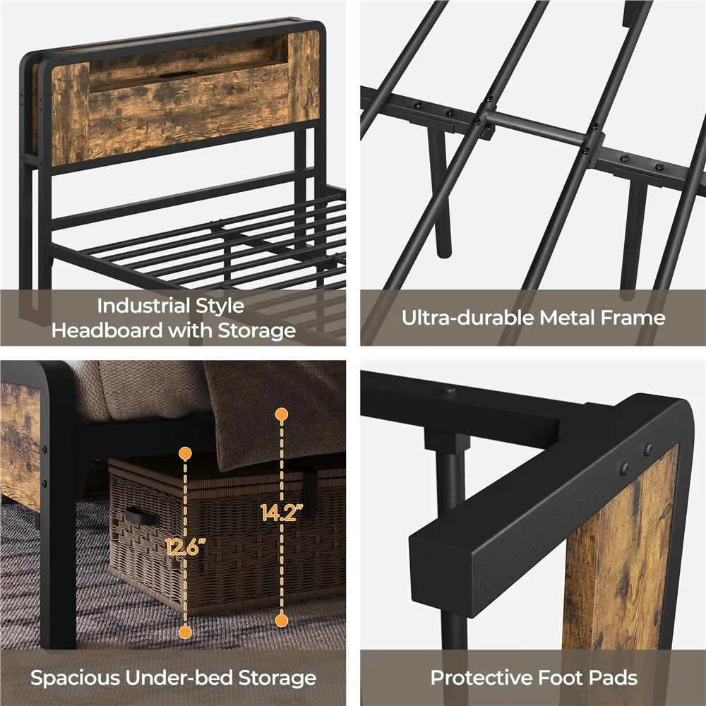 Topeakmart Full Size Metal Platform Bed with Wooden Headboard, Rustic Brown