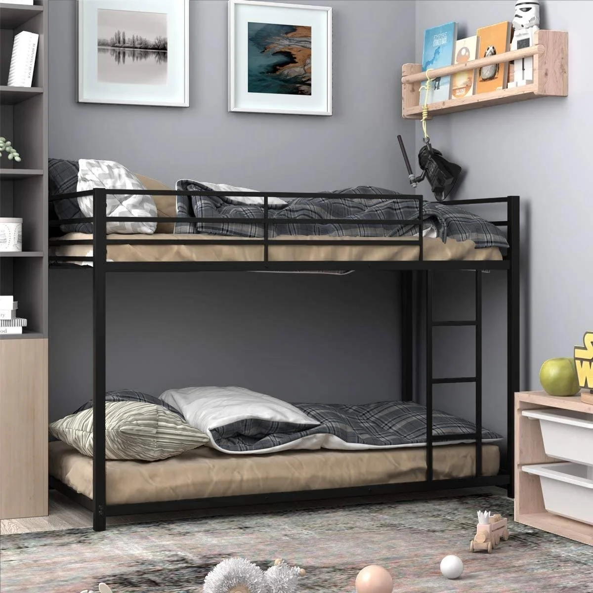 Twin over Twin Low Profile Modern Bunk Bed Frame in Black Metal Finish