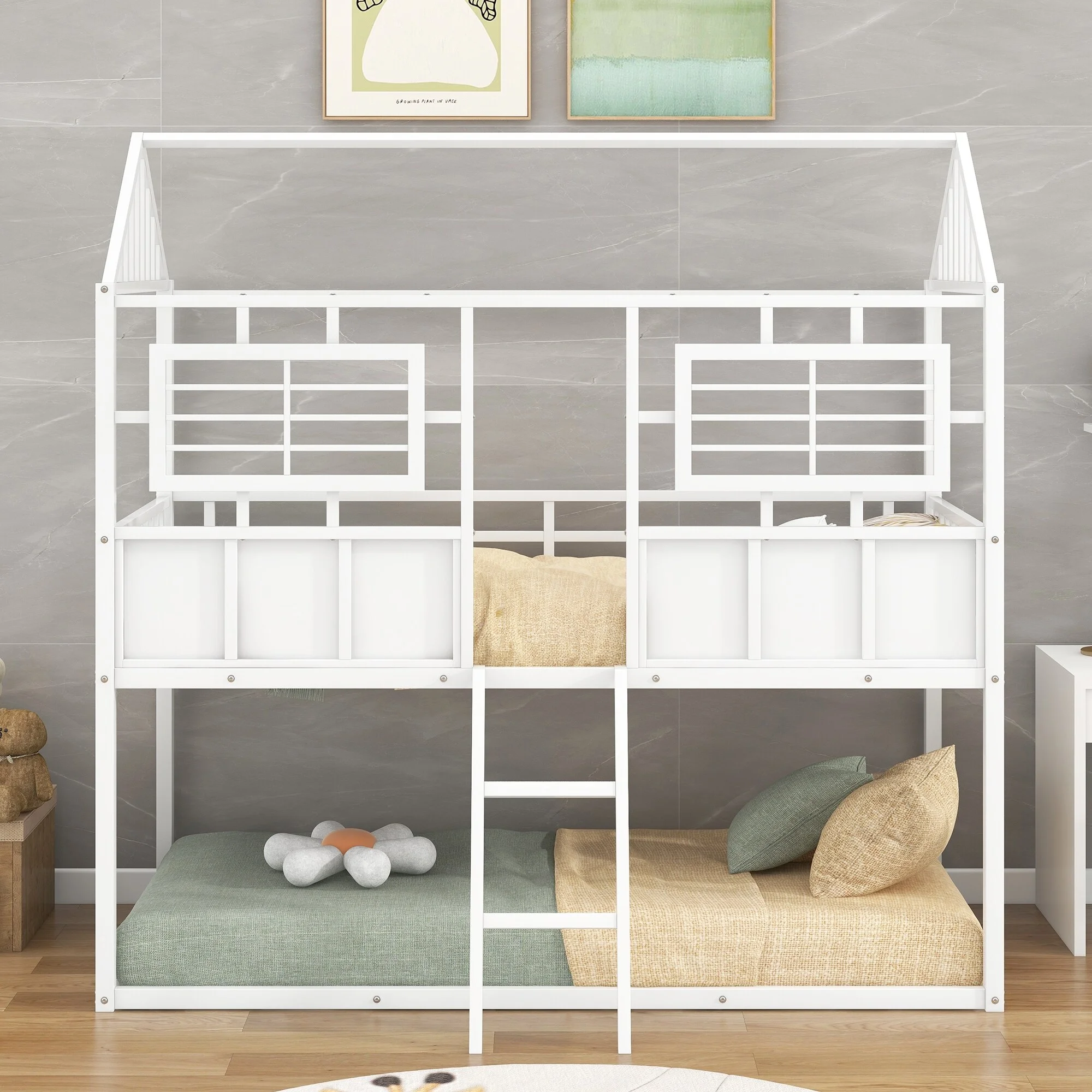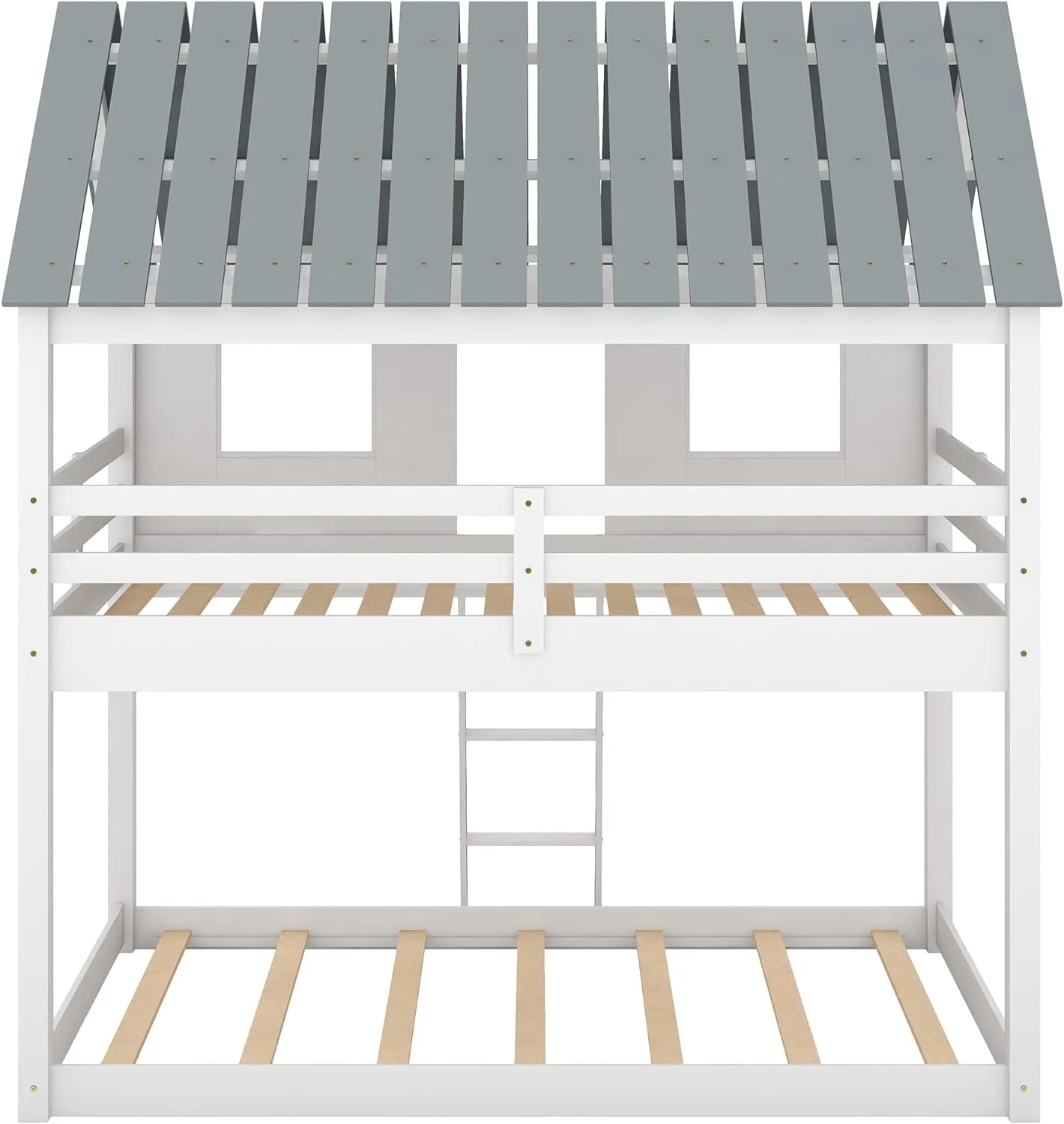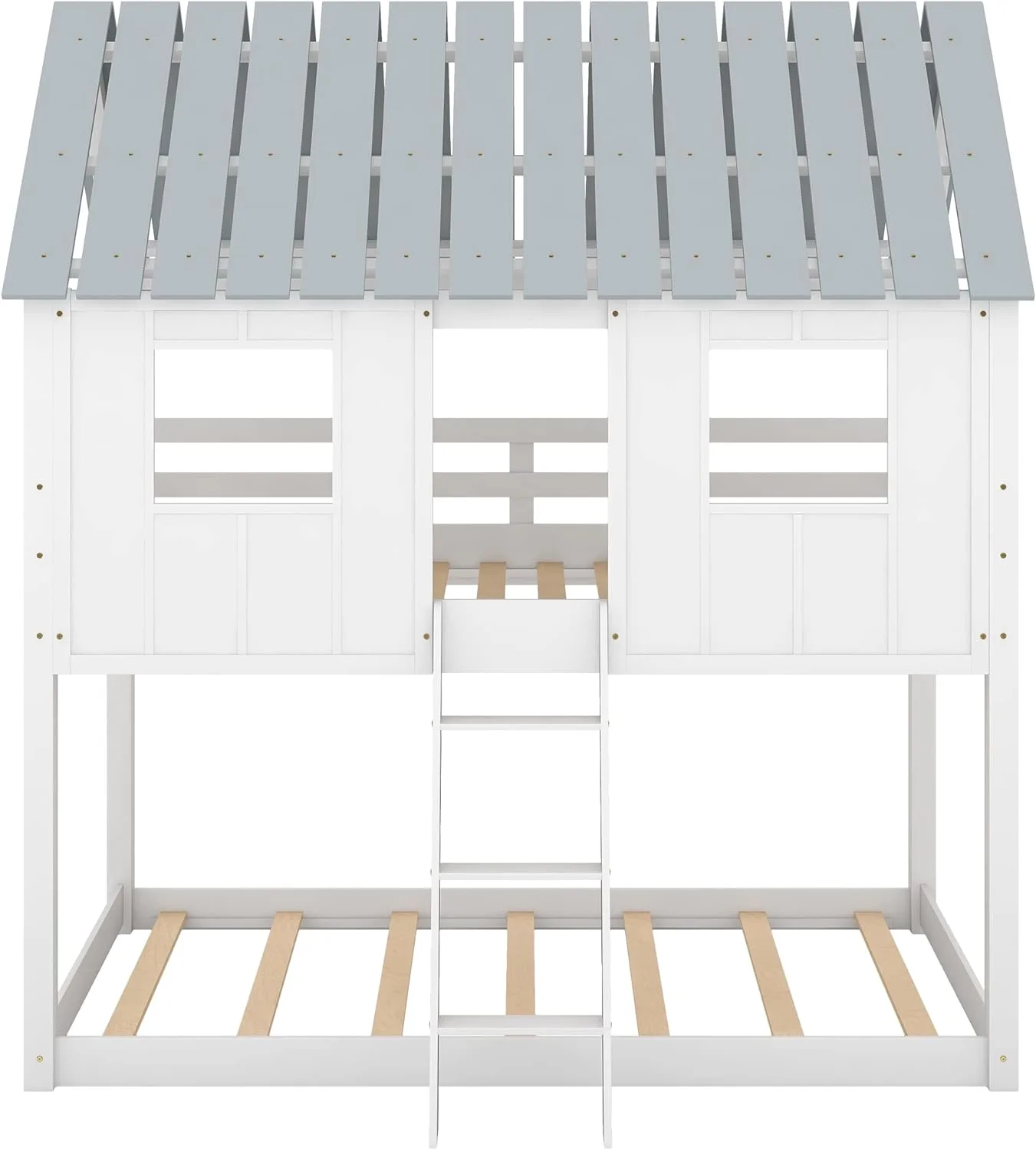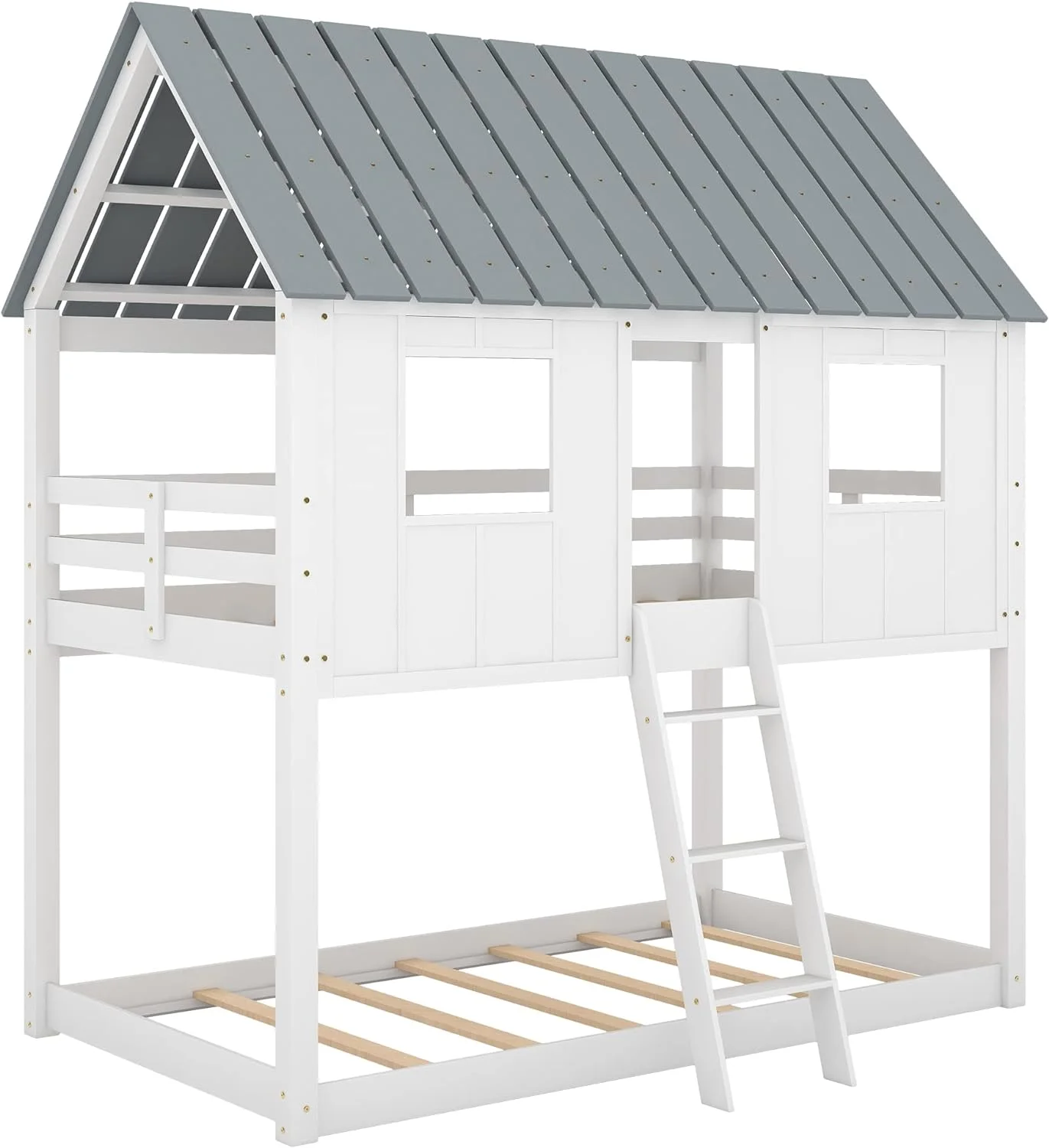 Over Size Bunk Beds, Low House Bed Frame Roof, ndows And Fence-Shaped Guardrail For Kids, Toddlers Bunk Beds (White, Over )