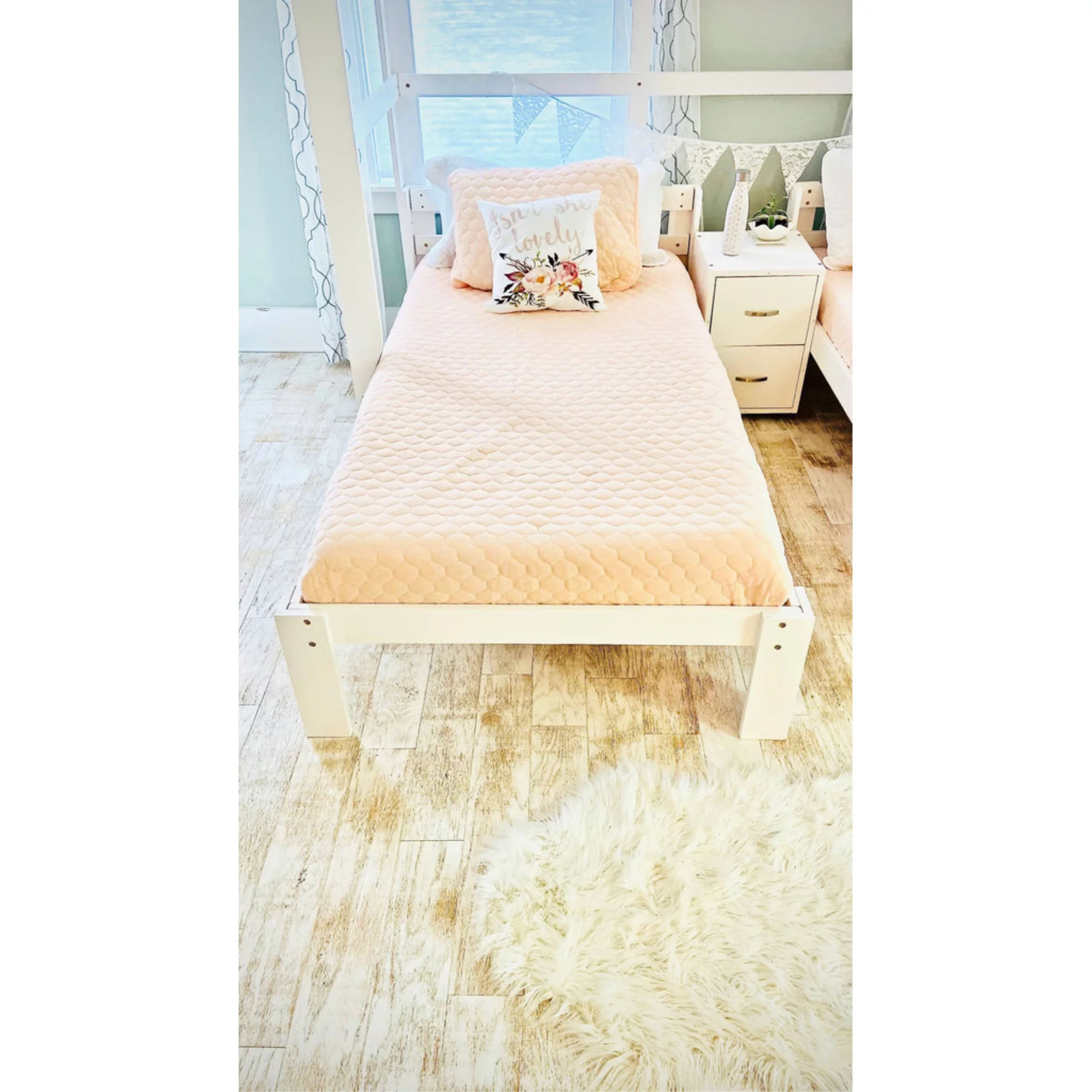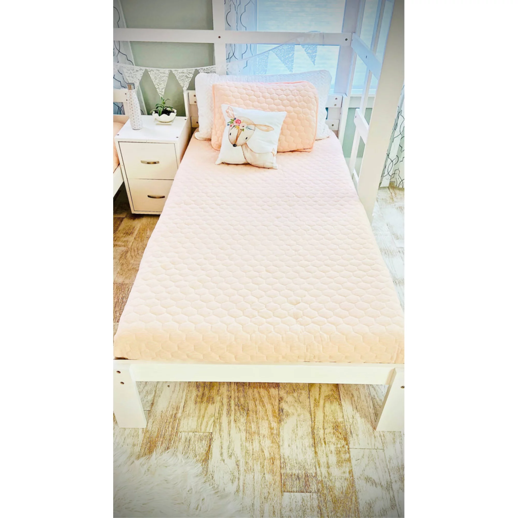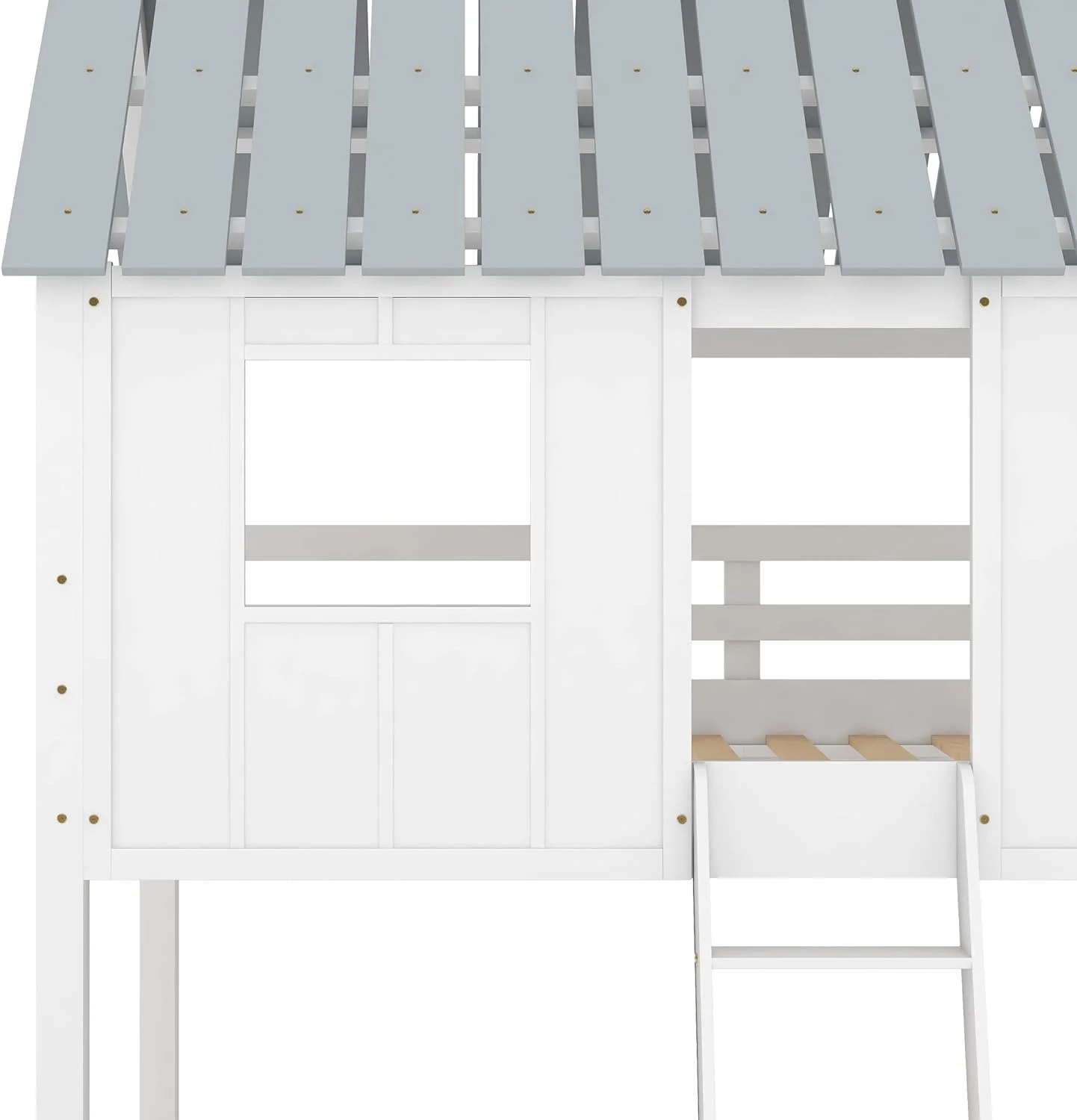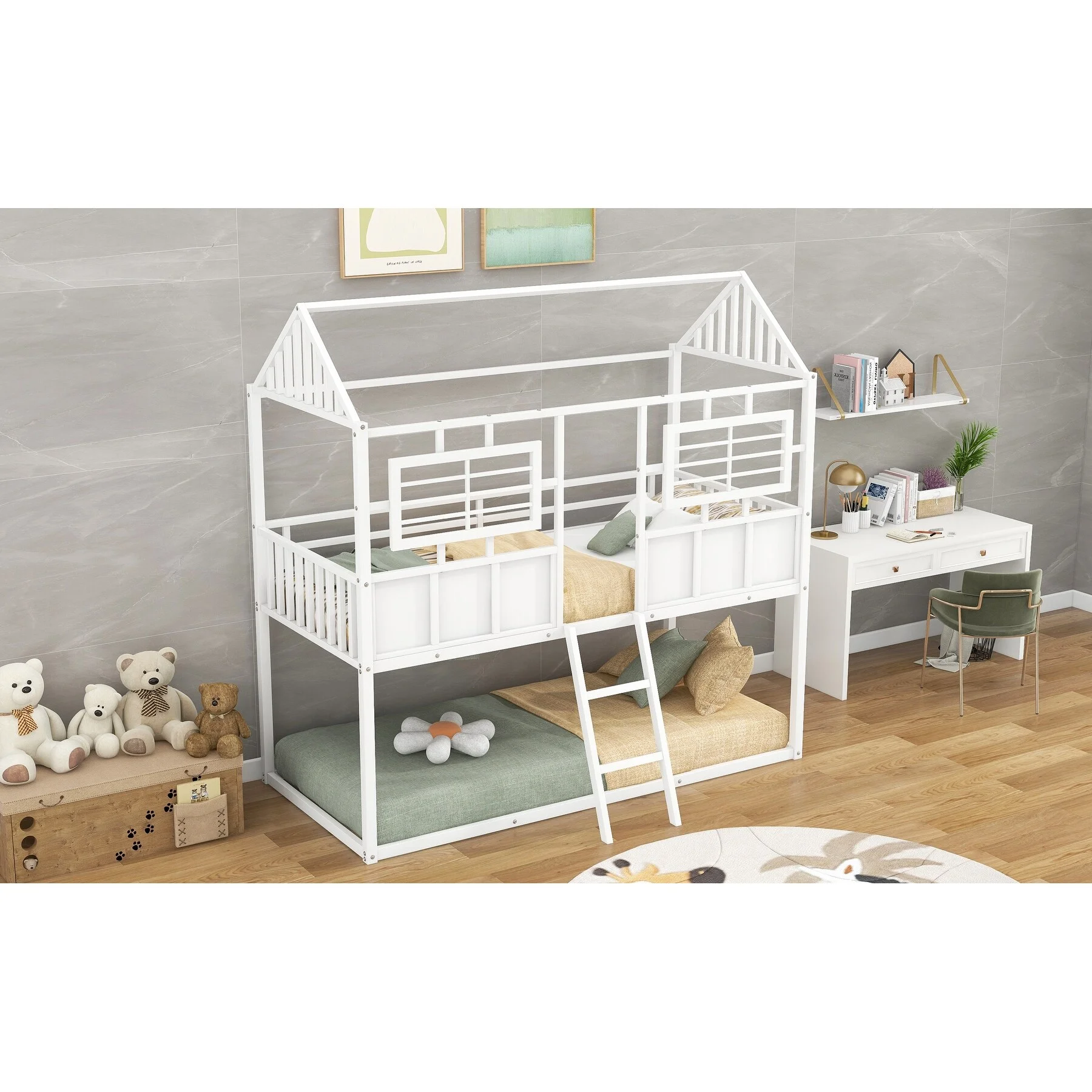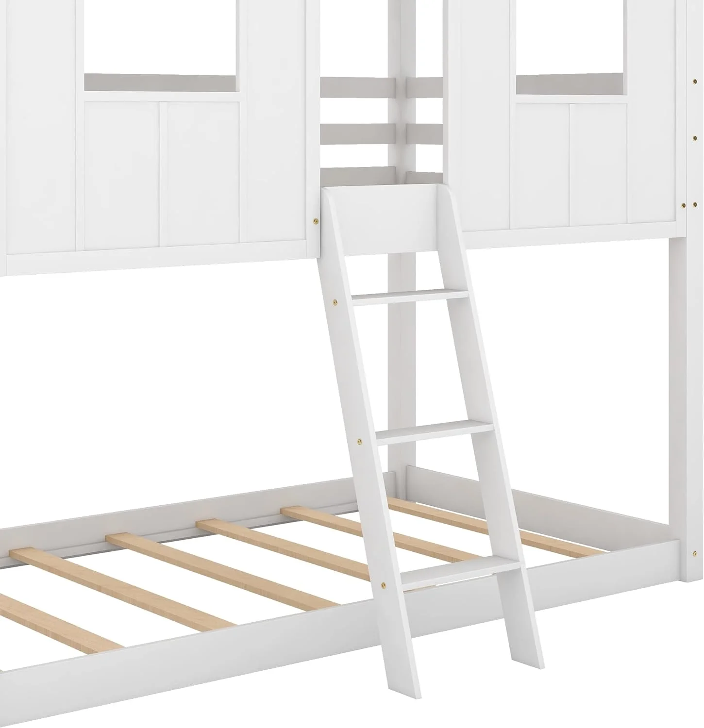 Over Size Bunk Beds, Low House Bed Frame Roof, ndows And Fence-Shaped Guardrail For Kids, Toddlers Bunk Beds (White, Over )
