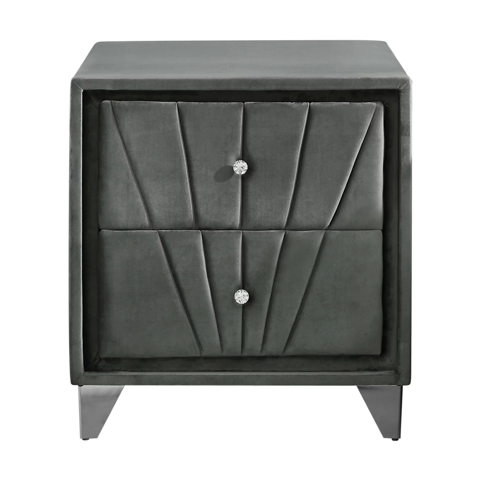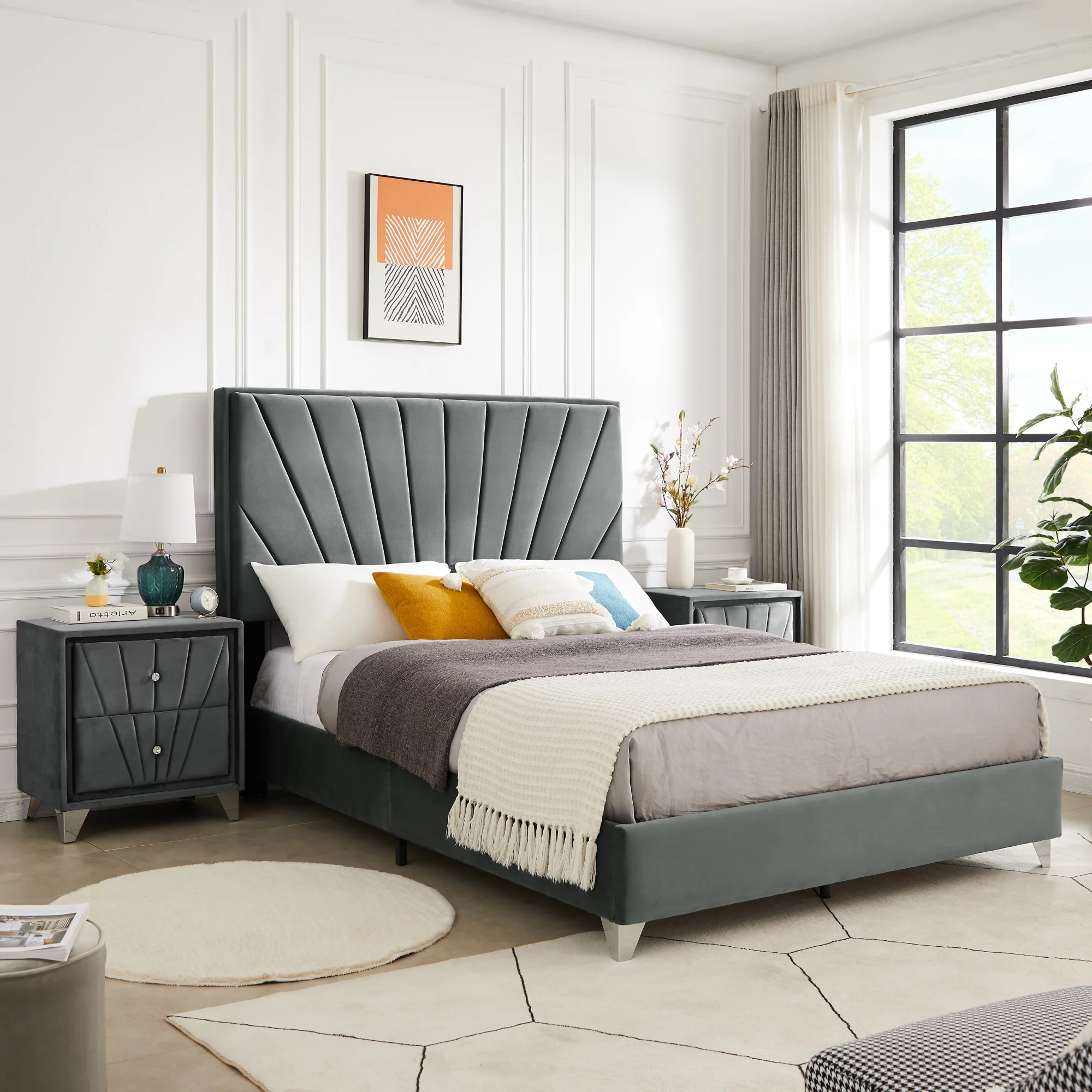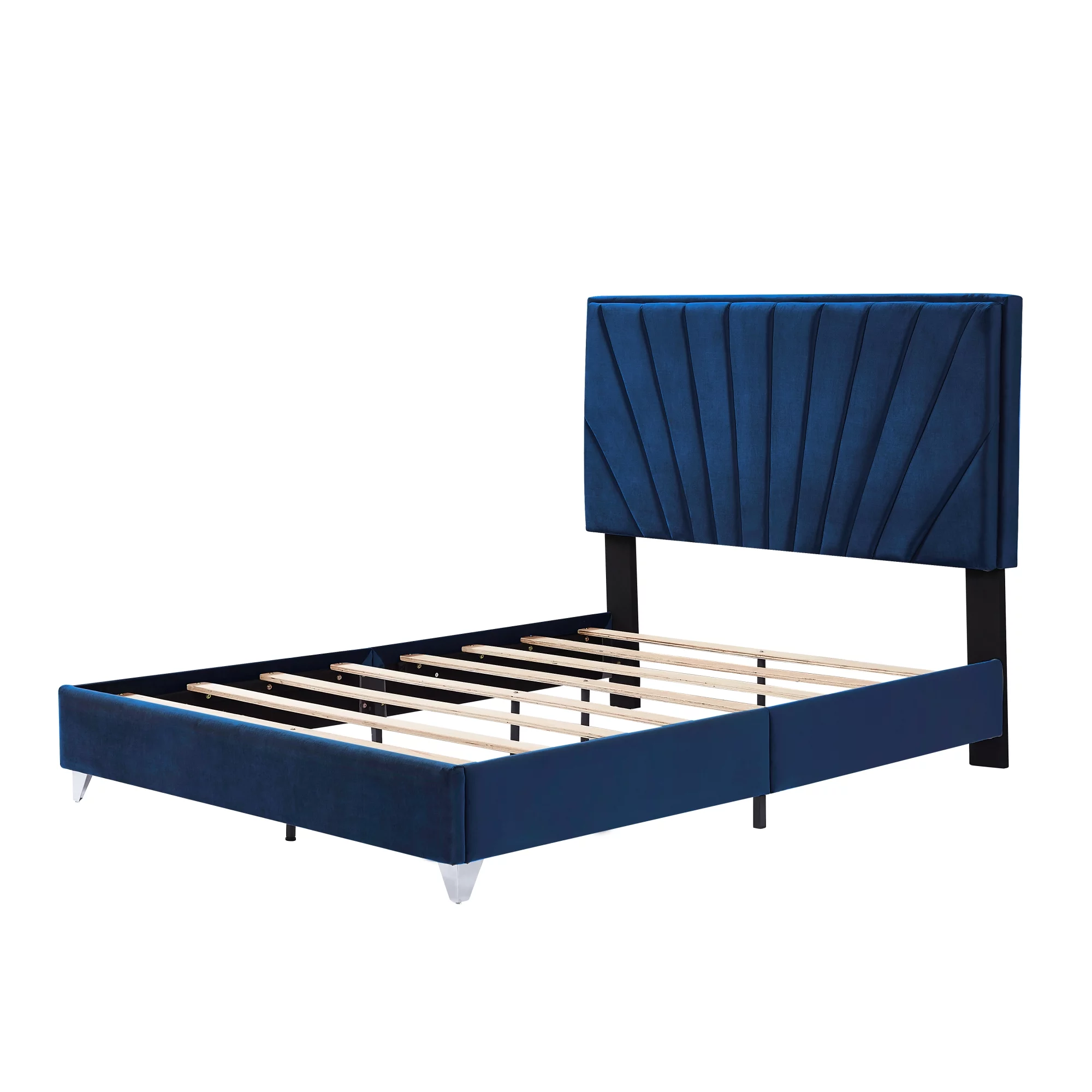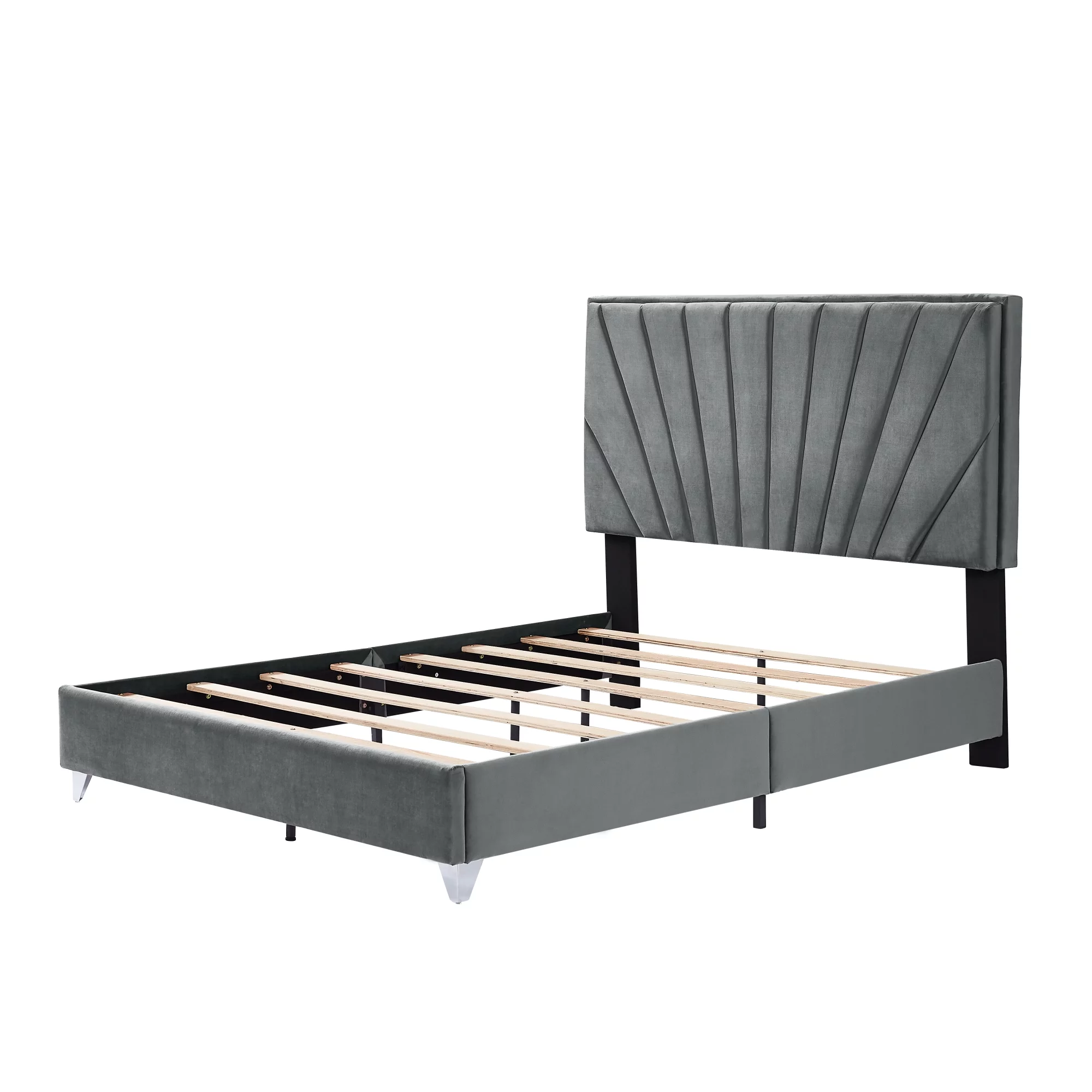 B108 Queen bed with one nightstand, Beautiful line stripe cushion headboard , strong wooden slats + metal legs with Electroplate