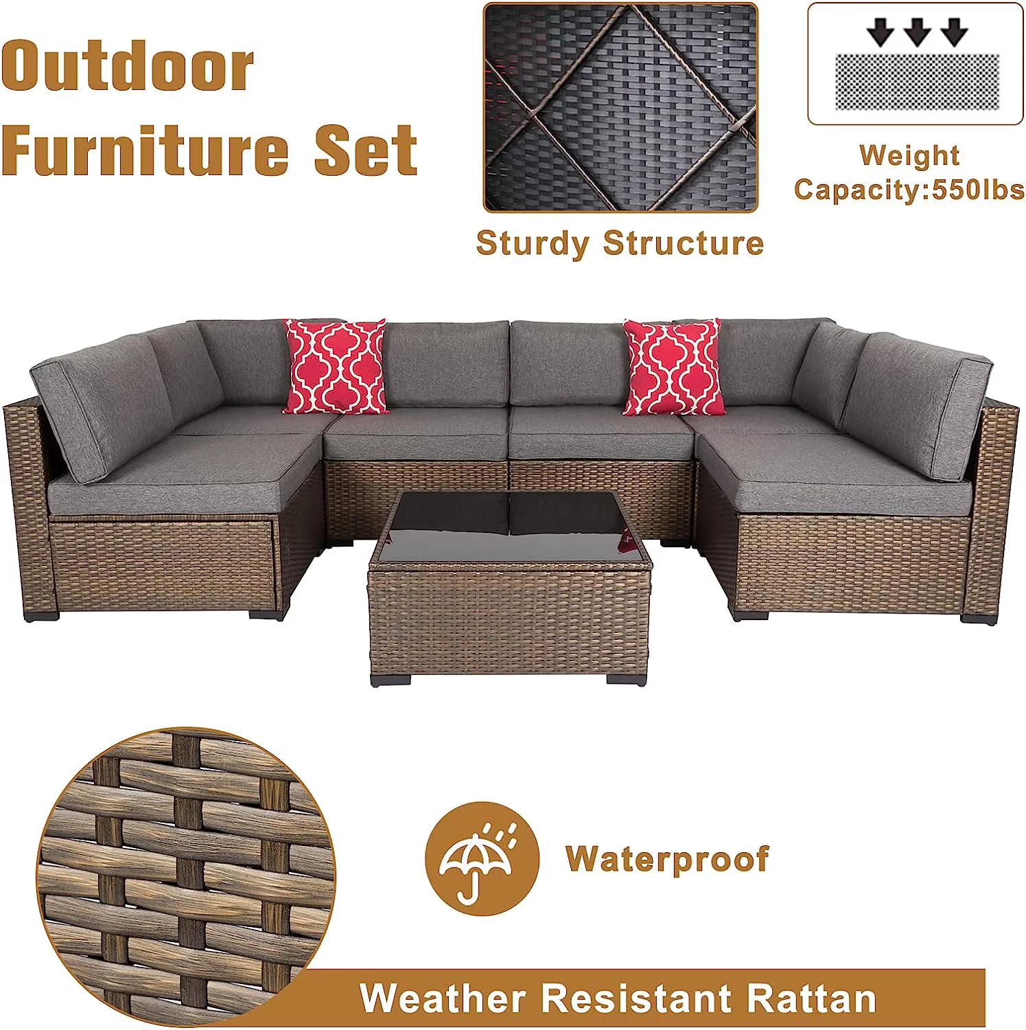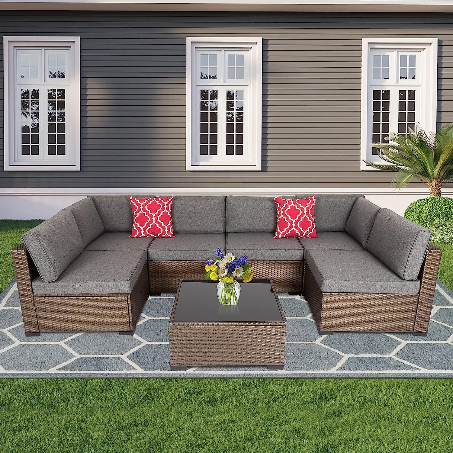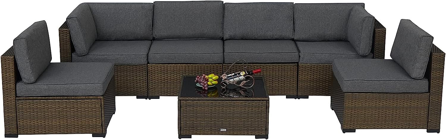 Kinbor 7pcs Patio Rattan Wicker Rattan Outdoor Sectional Sofa Set with Gray Cushions