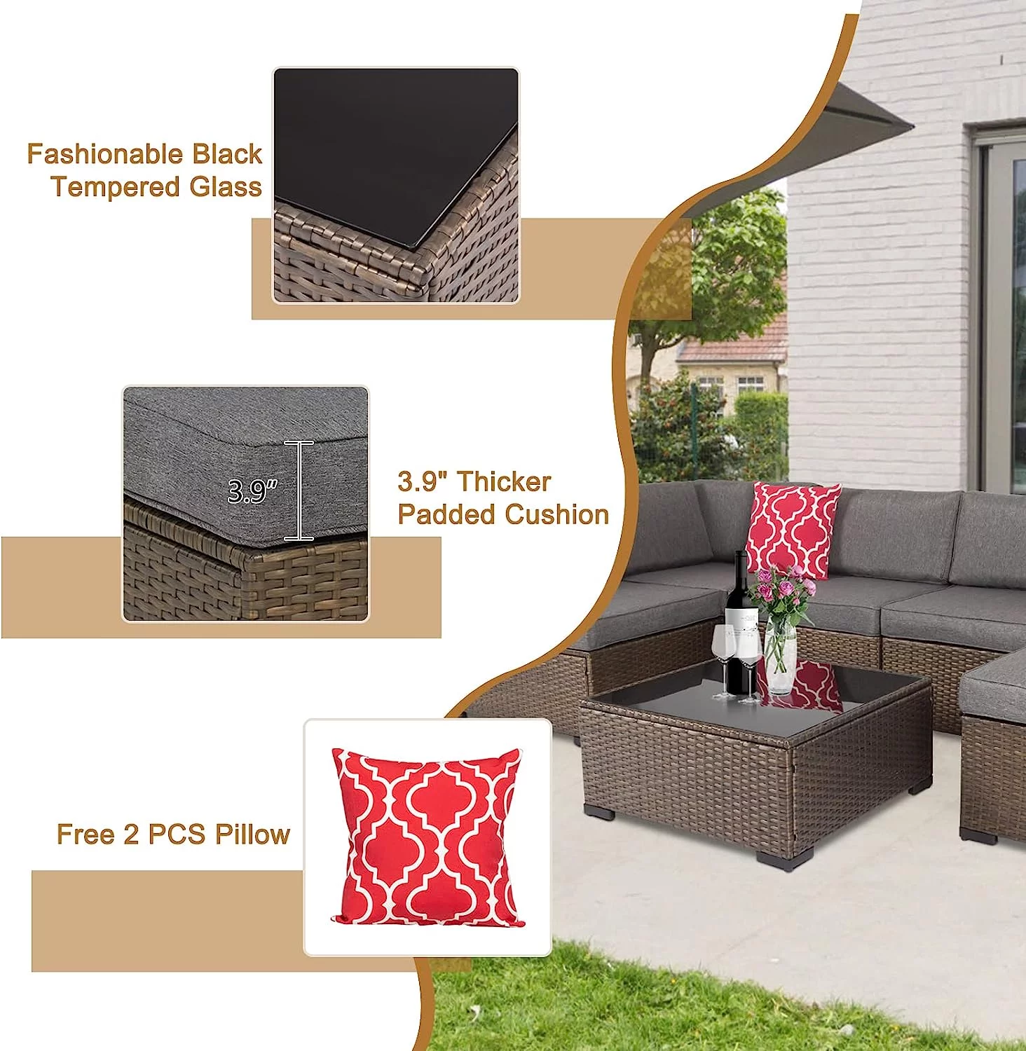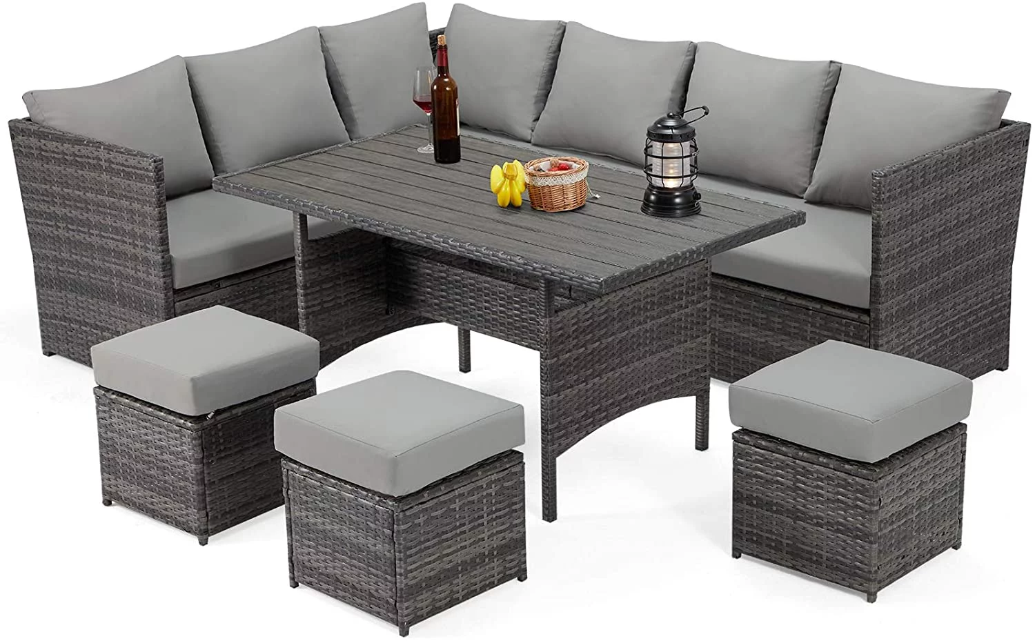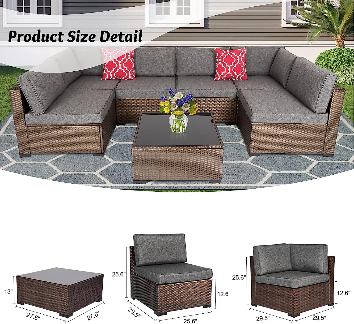 Kinbor 7pcs Patio Rattan Wicker Rattan Outdoor Sectional Sofa Set with Gray Cushions