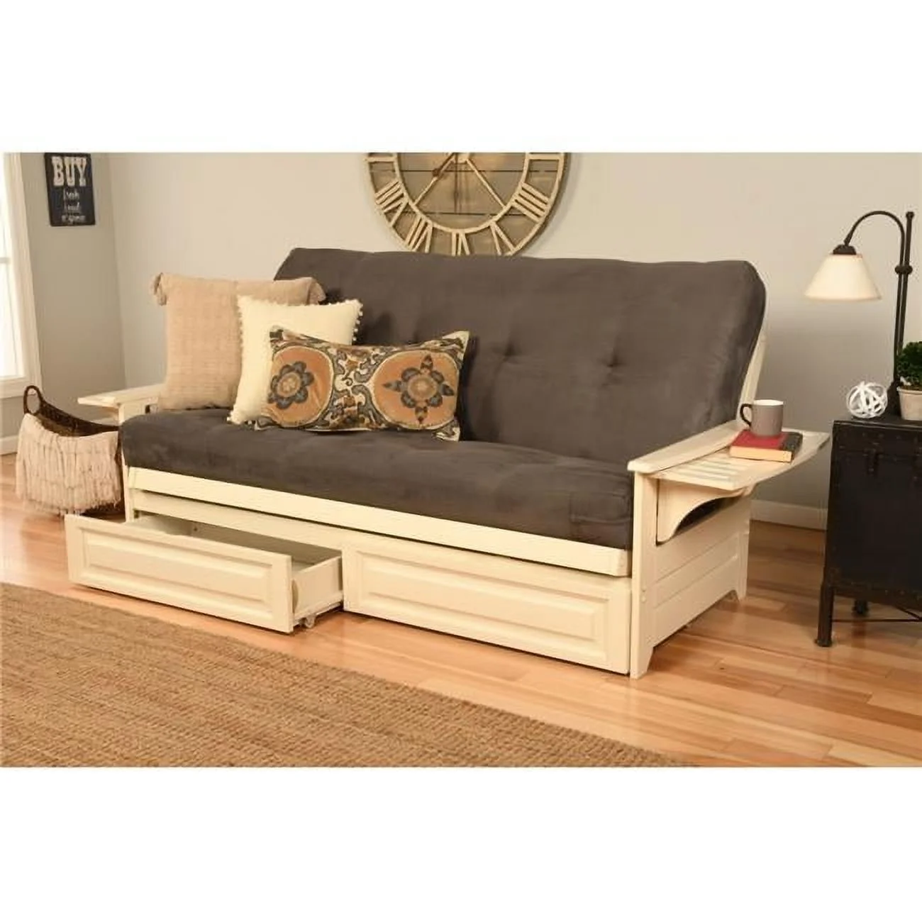 Phoenix Antique White Futon Frame with Suede Gray Mattress & Storage Drawers