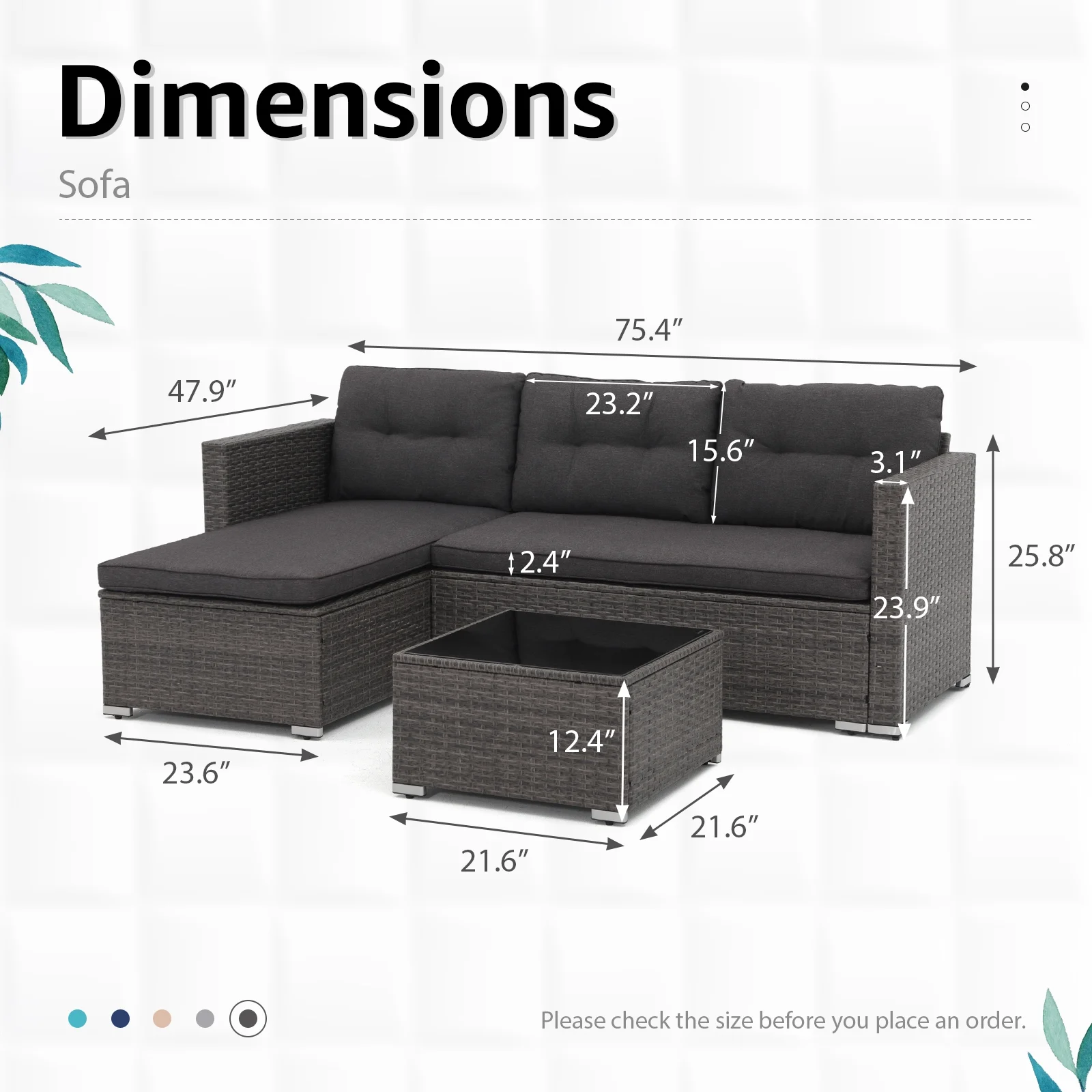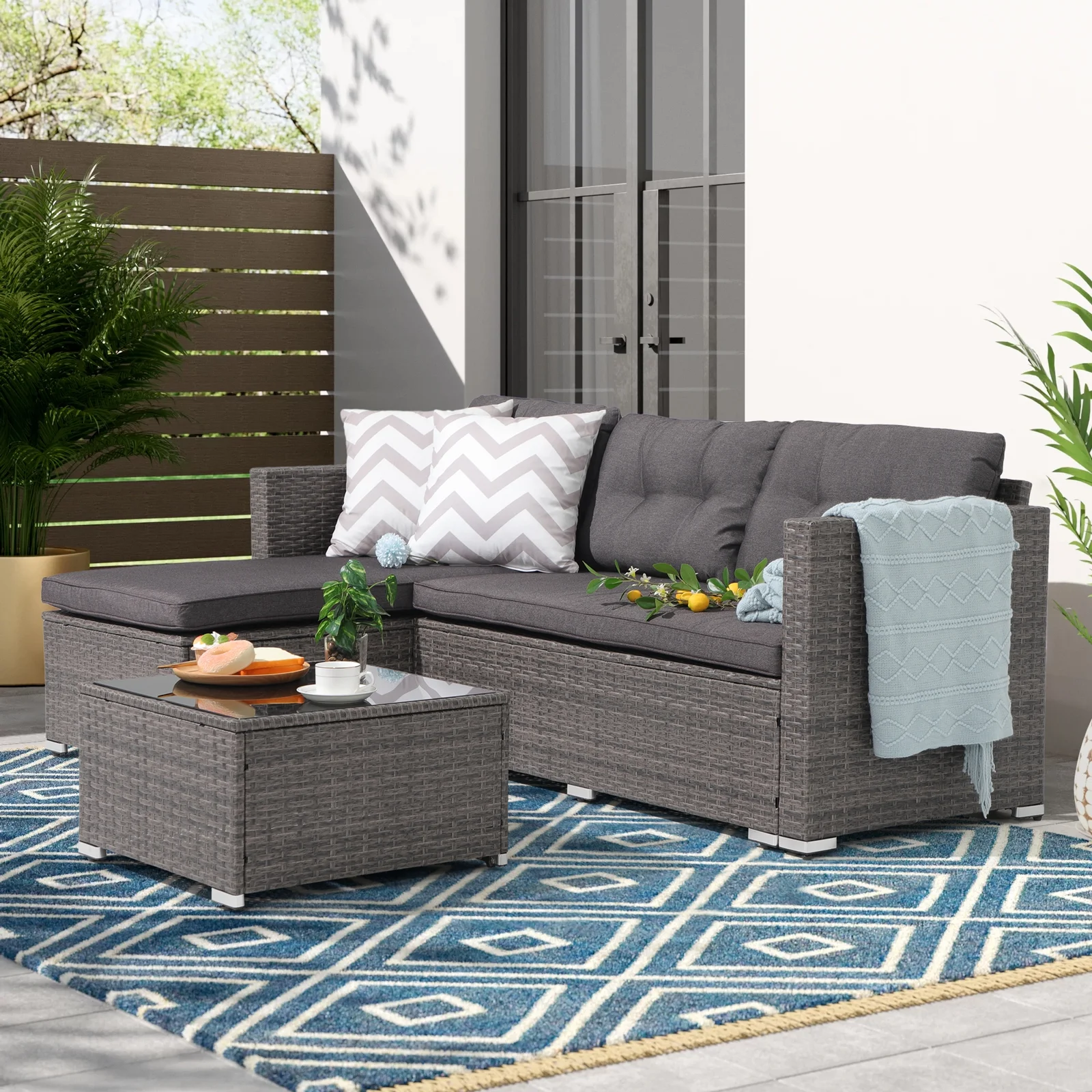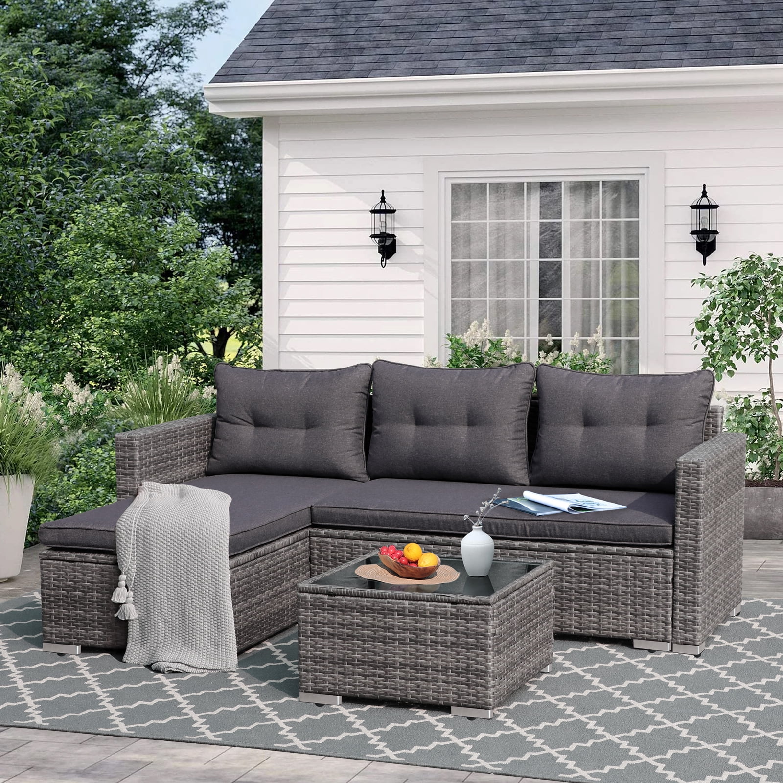 Walsunny 3 Piece Aegean Blue Outdoor Furniture Sectional Sofa Patio Set Silver Gray Rattan Wicker