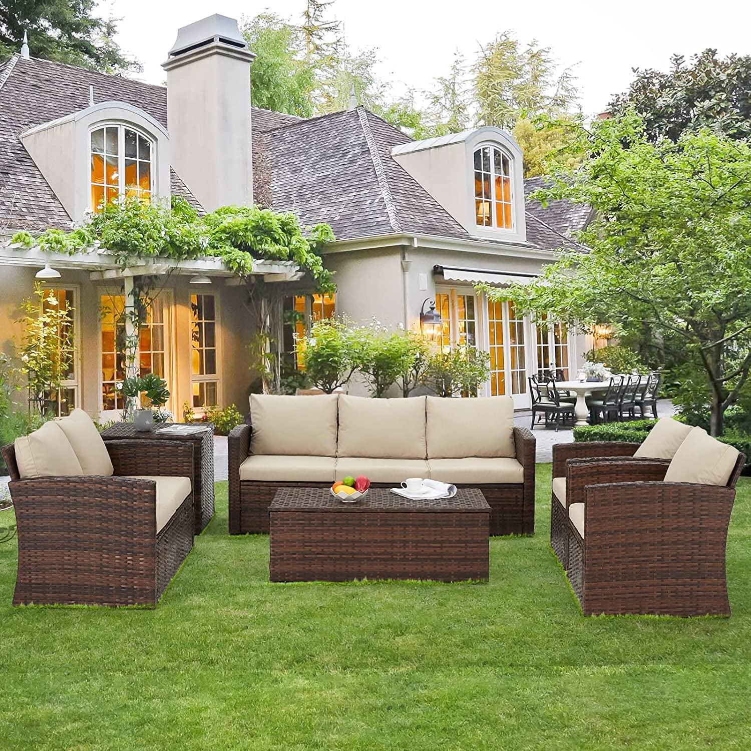 AECOJOY 6 Pieces Outdoor Furniture Set , Patio Rattan Wicker Sectional Sofa Conversation Set, Beige