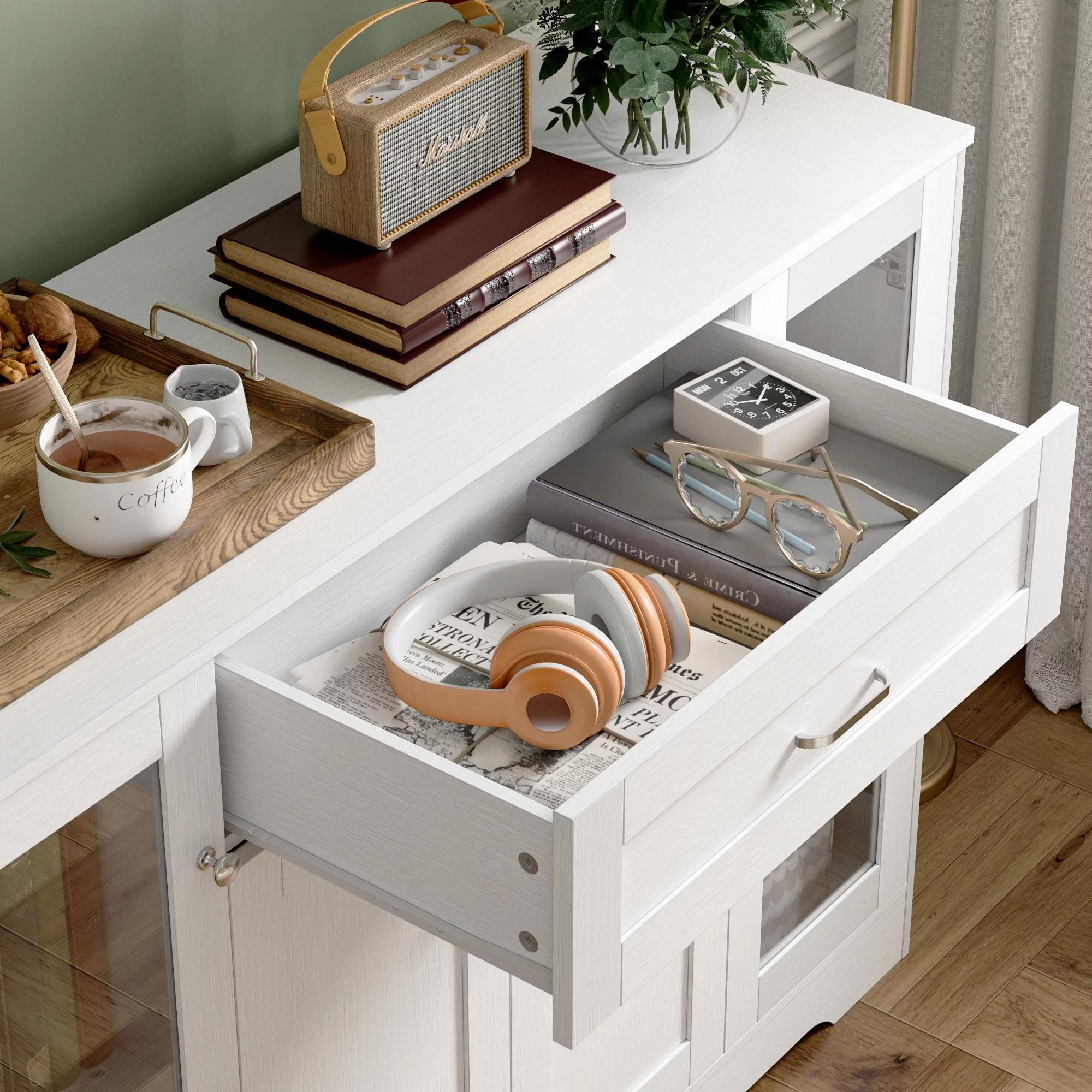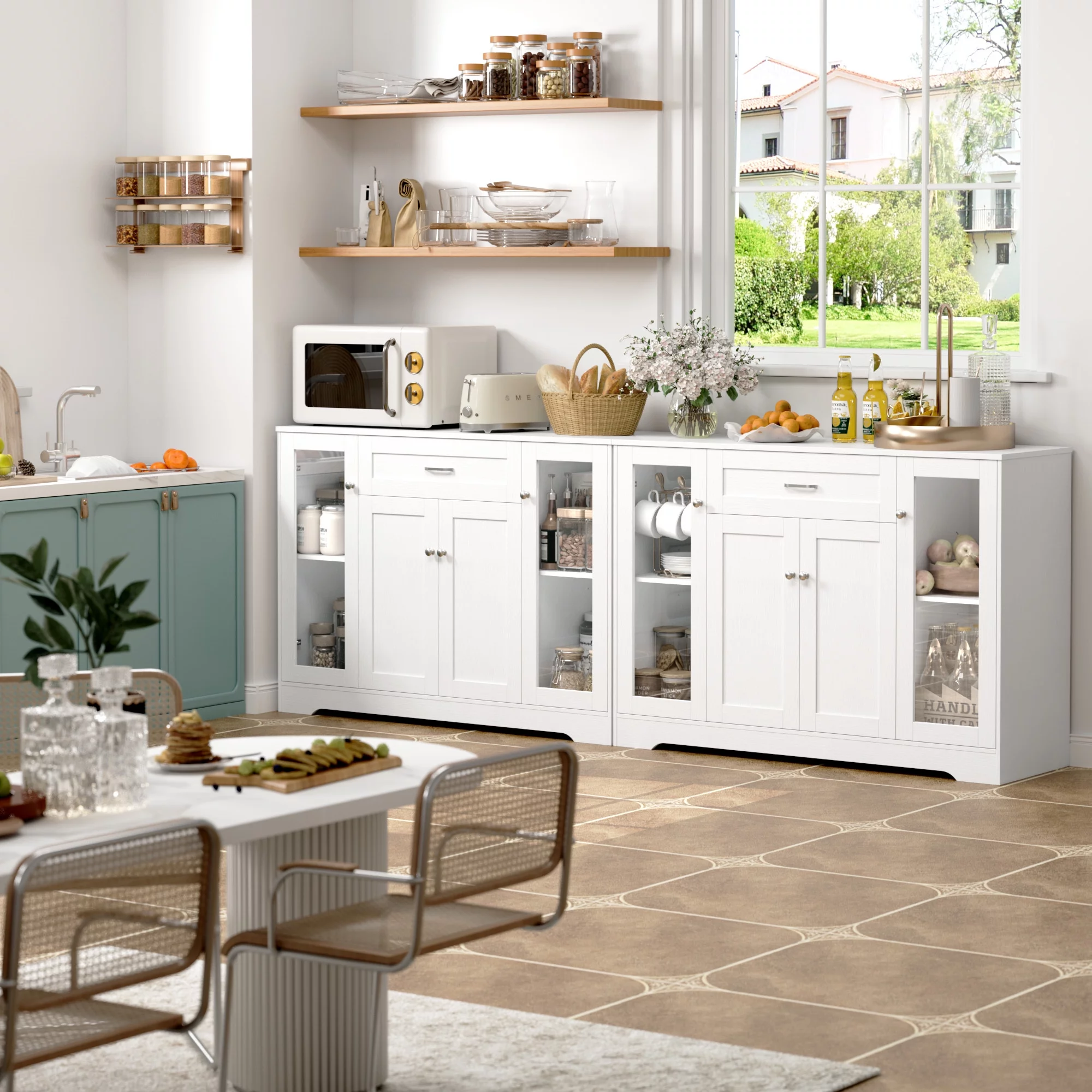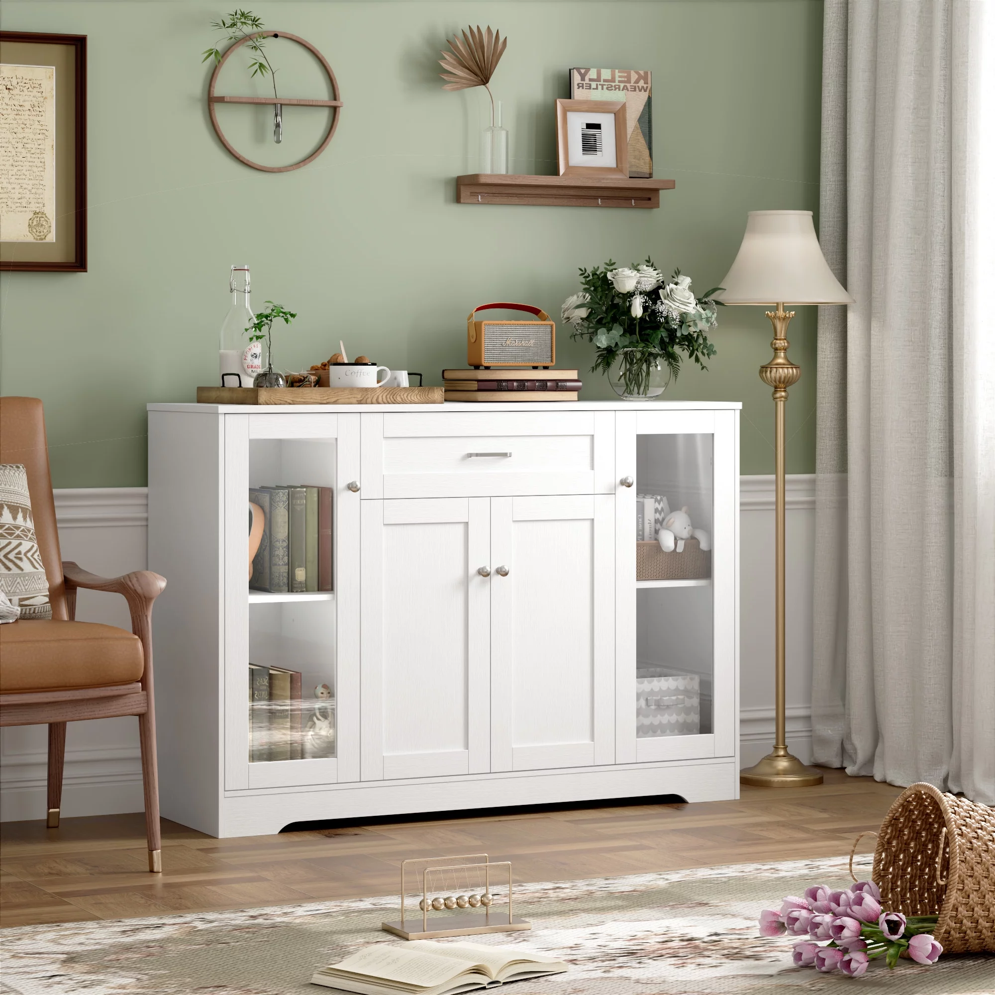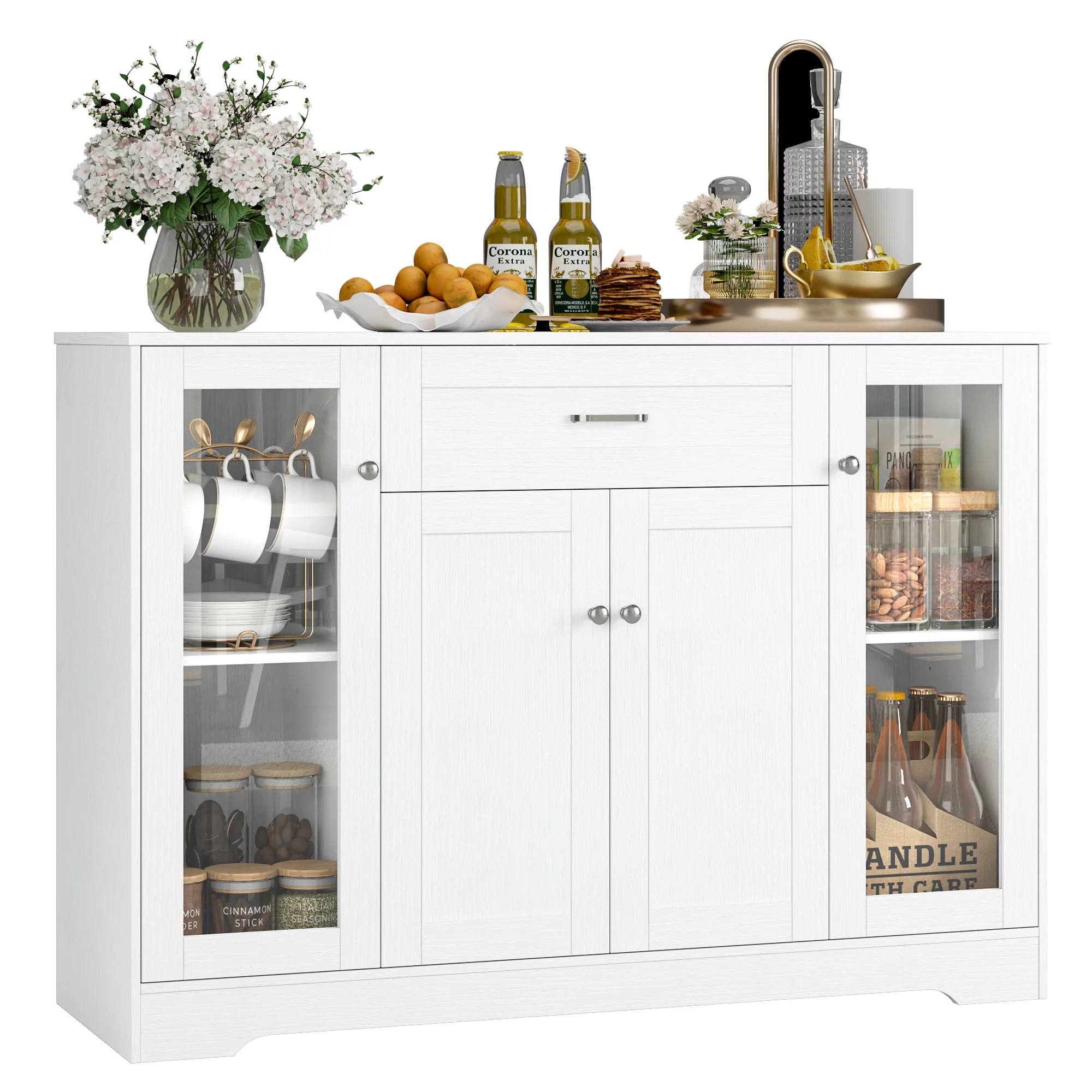 Homfa Storage Cabinet with Glass Door, 47.2"W Wooden Cupboard Kitchen Buffet Sideboard with Drawer, White