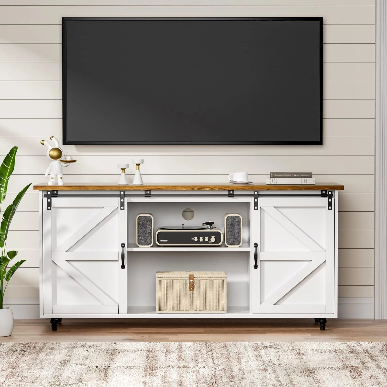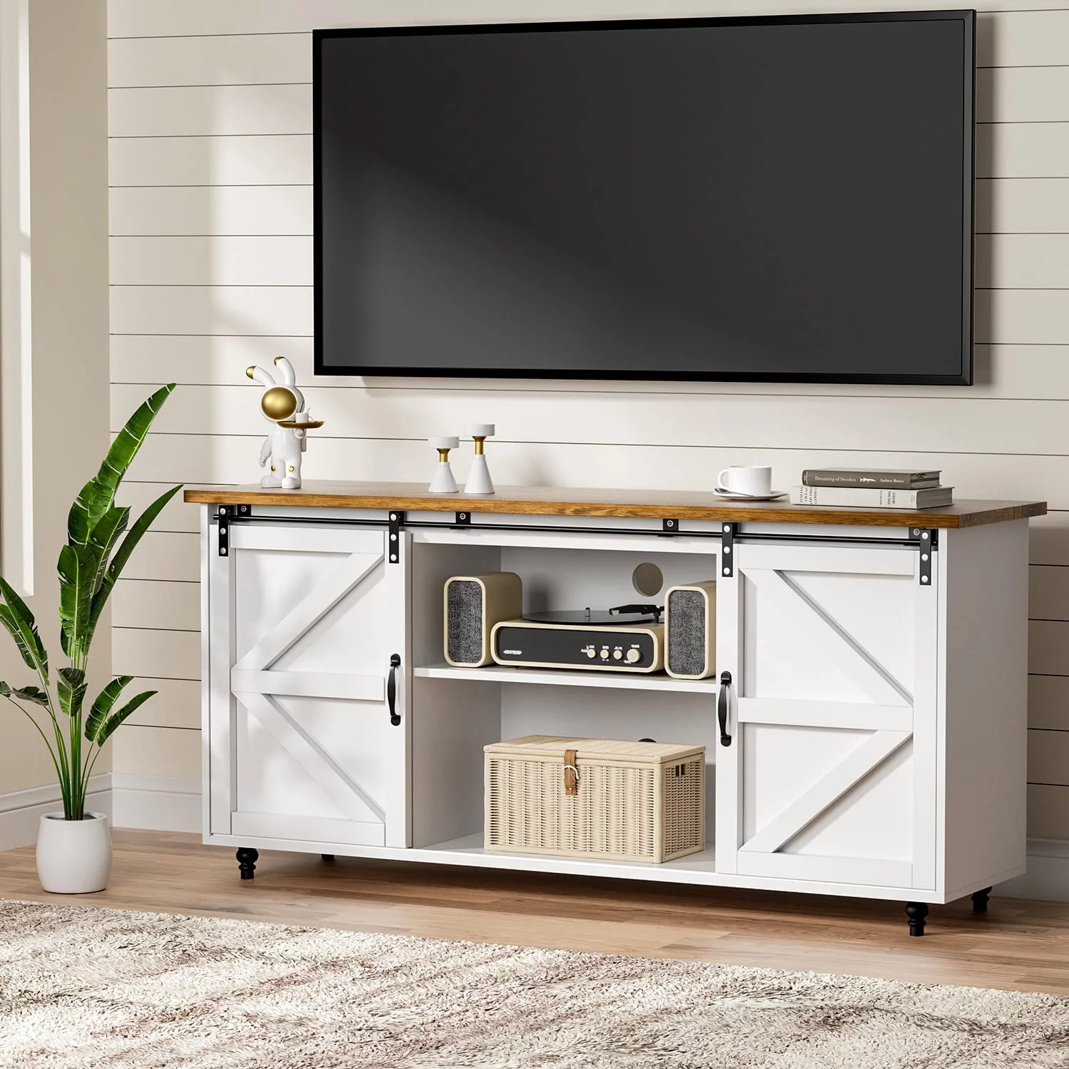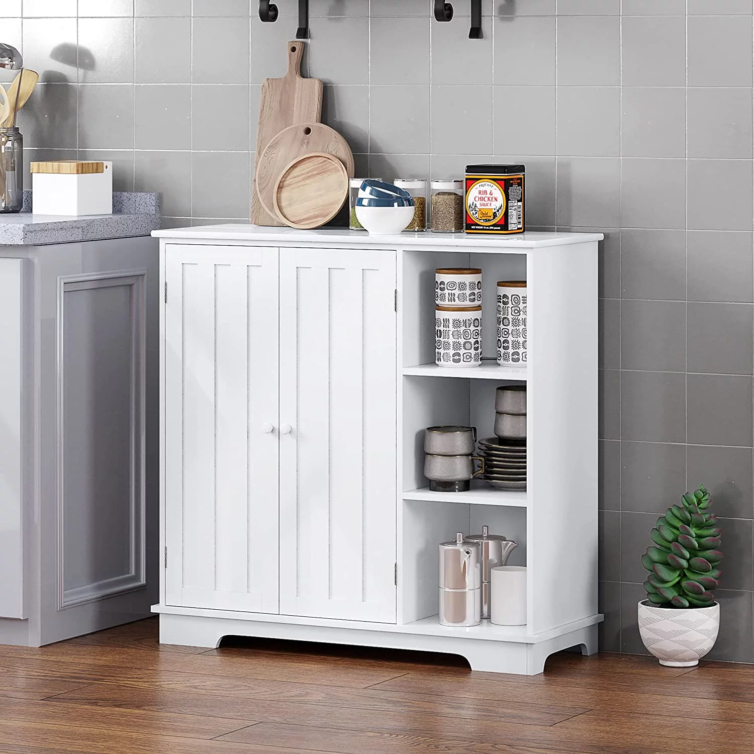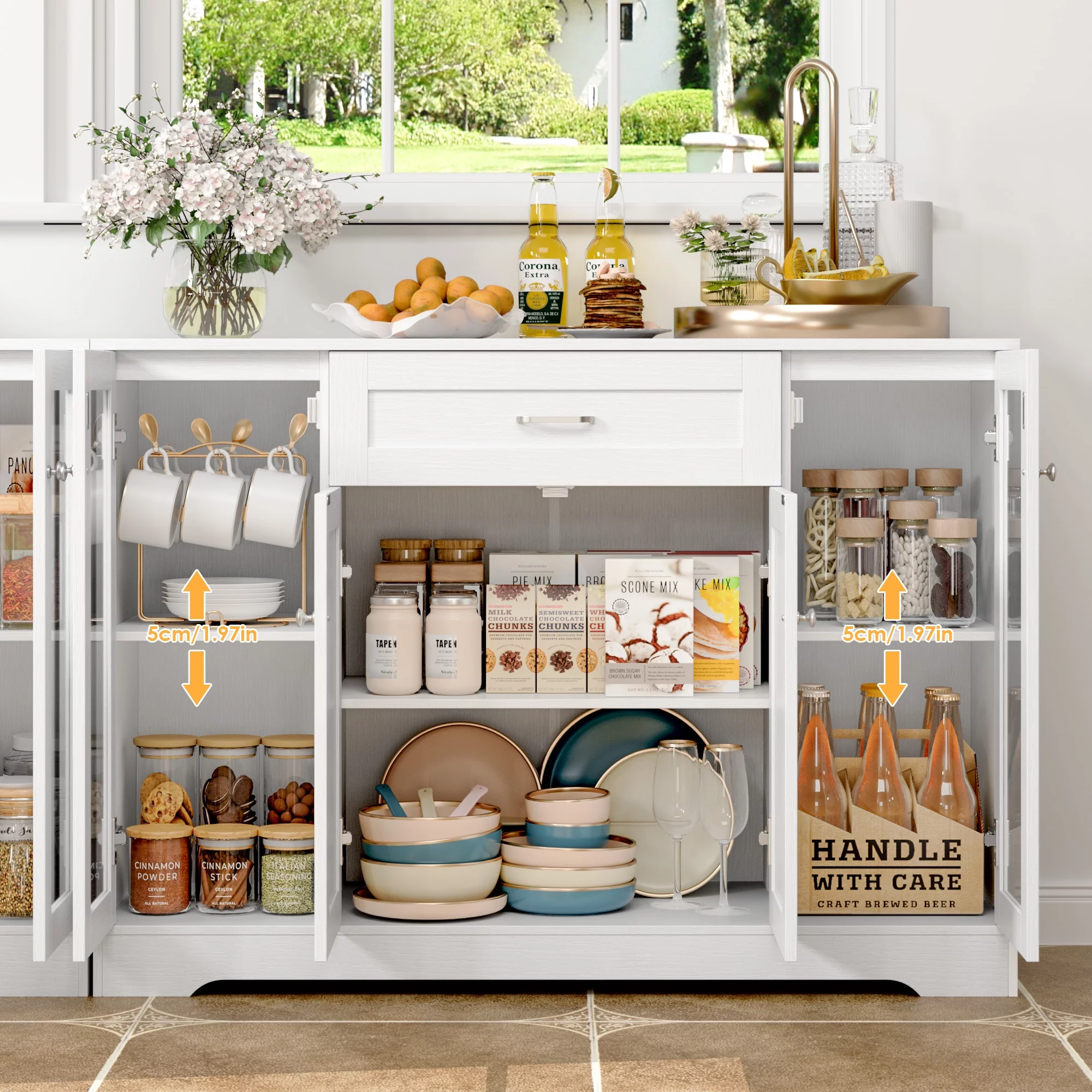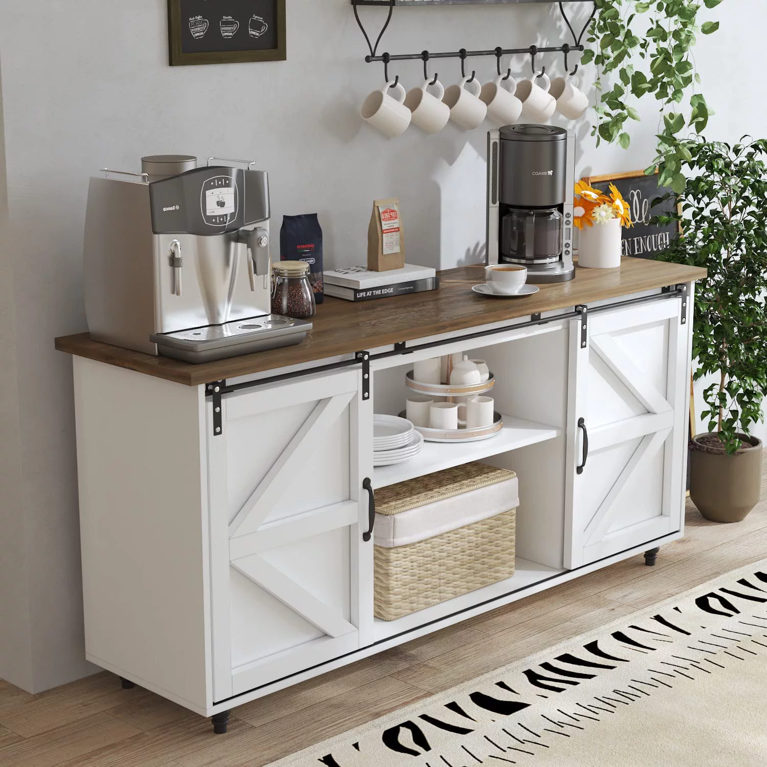 Catrimown Farmhouse Coffee Bar Cabinet, 58'' Kitchen Buffet Sideboard Storage Cabinet with Adjustable Shelves, White