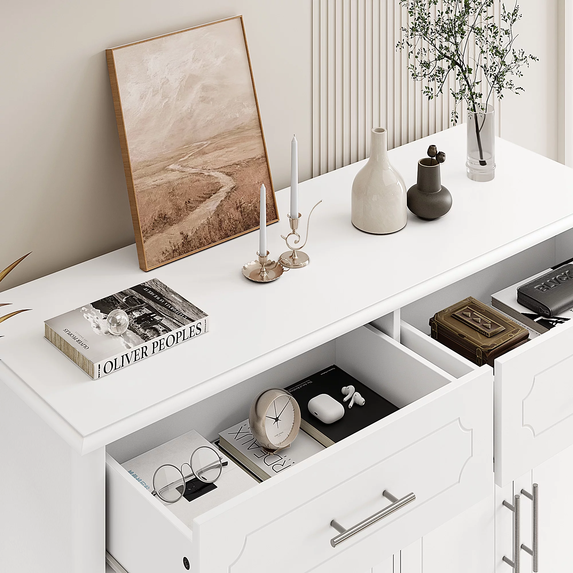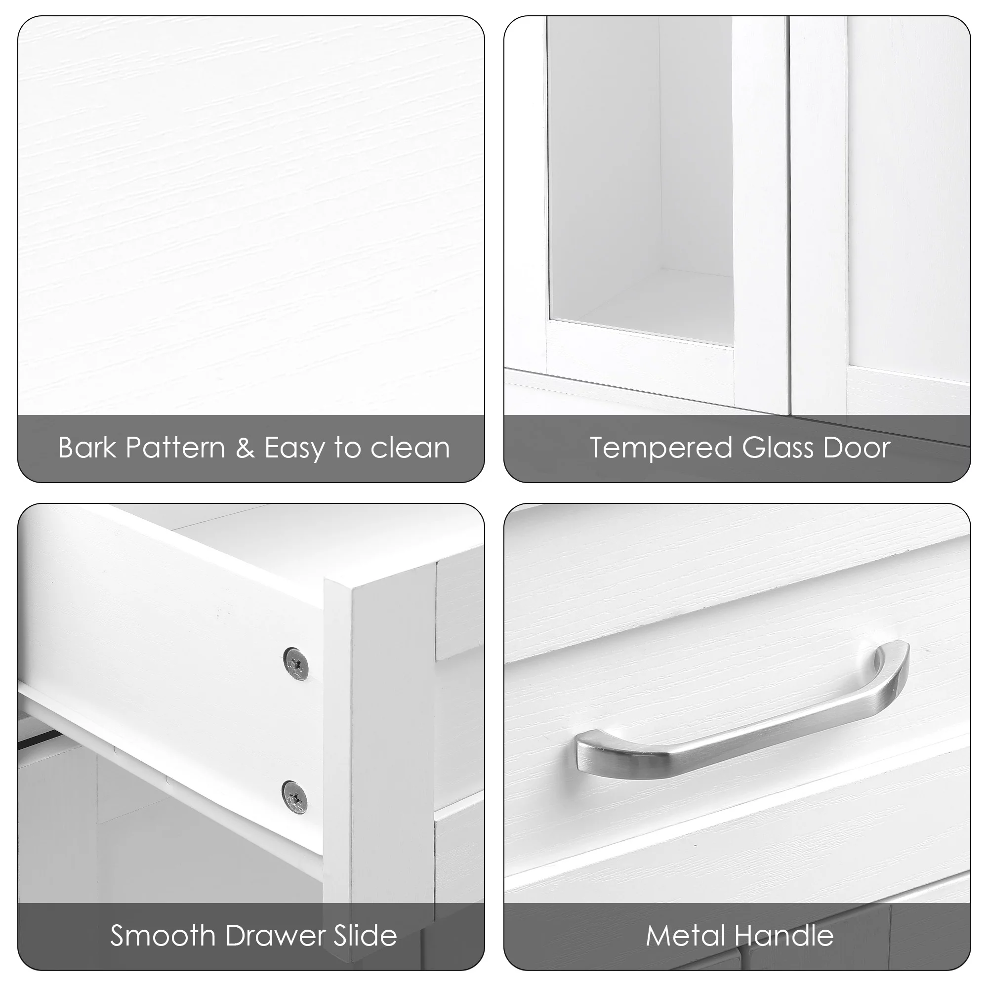 Homfa 4 Drawer Storage Cabinet, Modern Wooden Cupboard with Glass for Living Room, White Finish