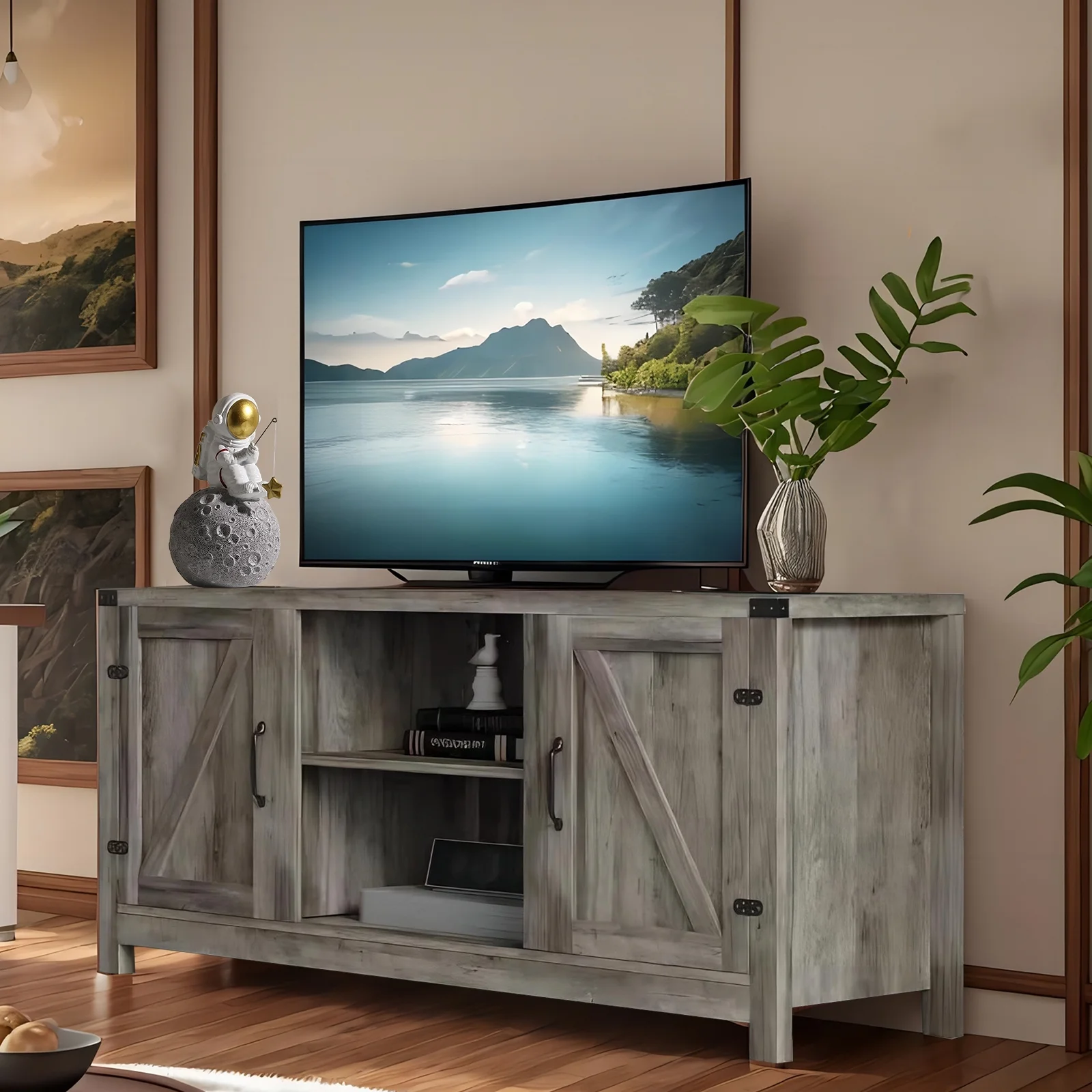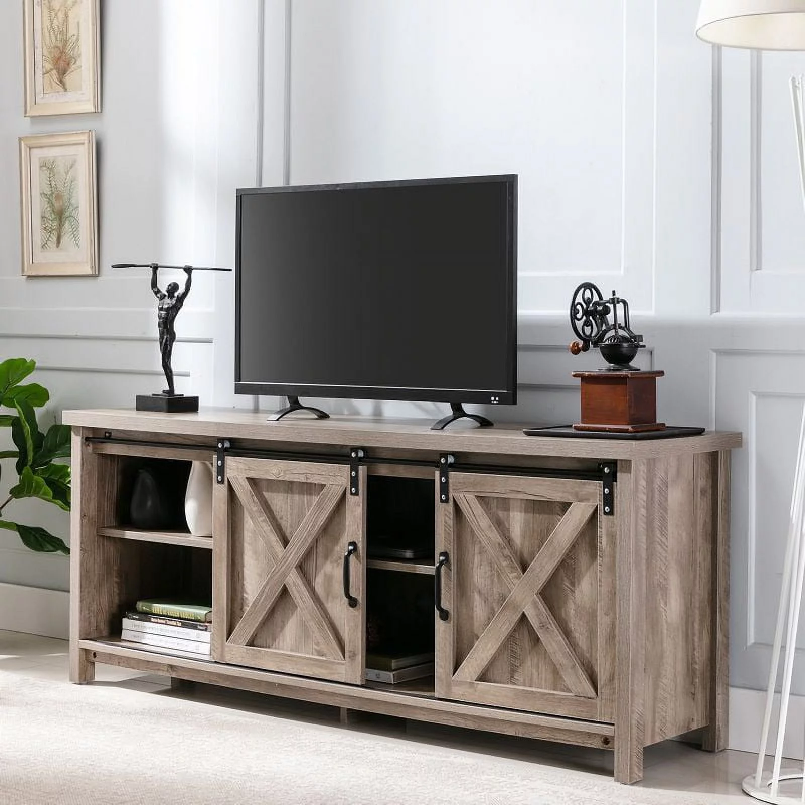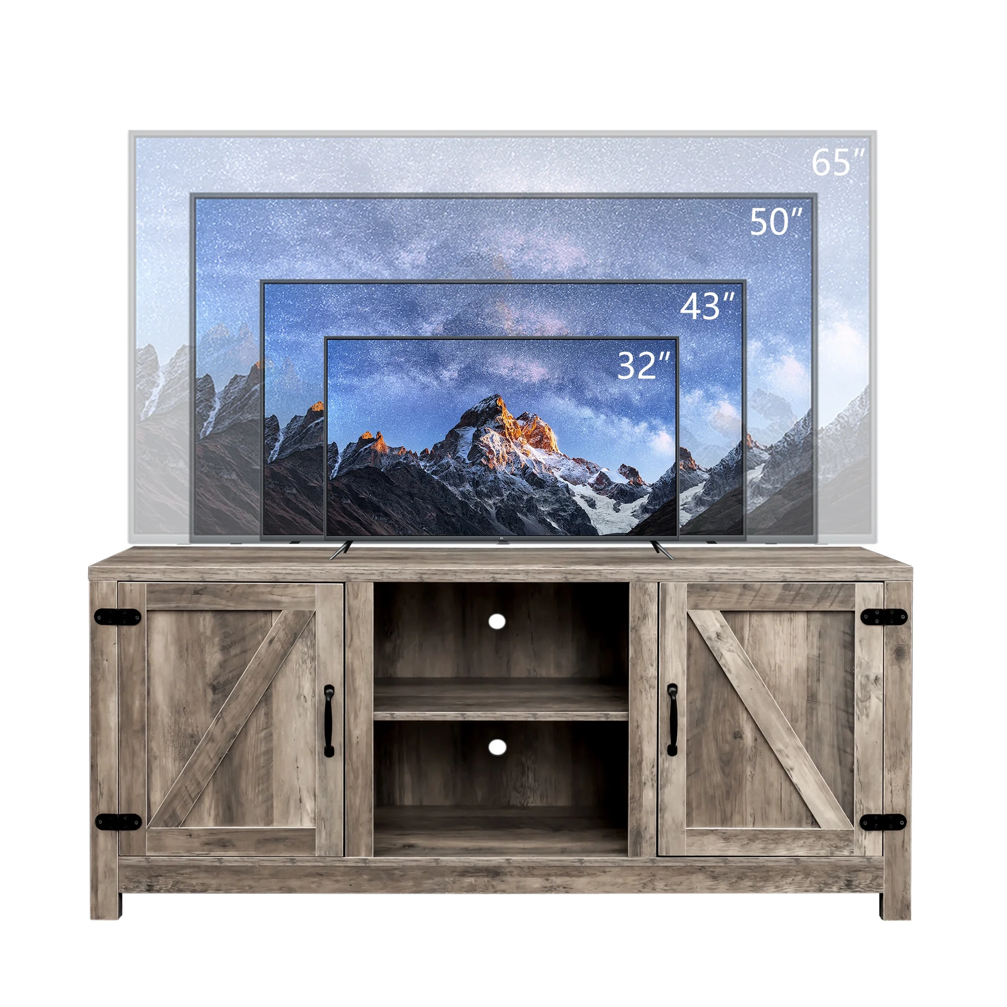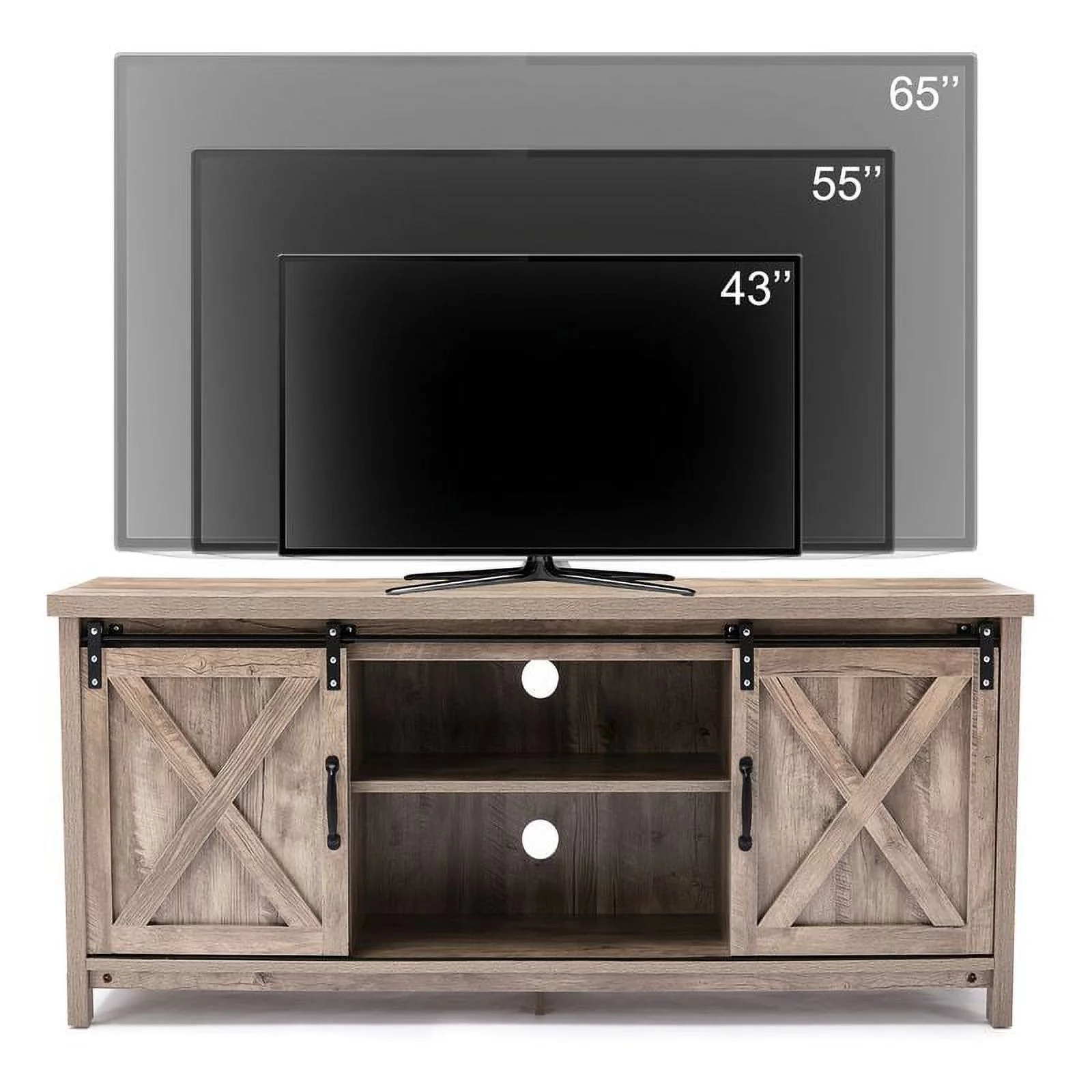 AKIUDEX Modern Farmhouse TV Stand Barn Door TV Cabinet for TVs up to 65", Media Furniture for Living Room, Gray Wash