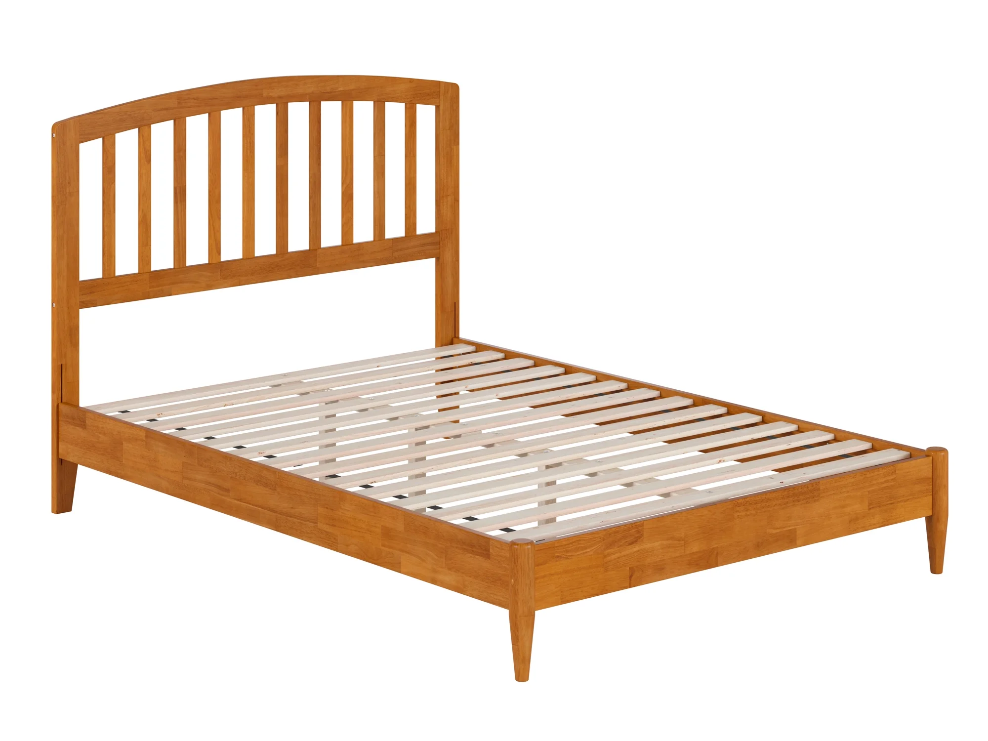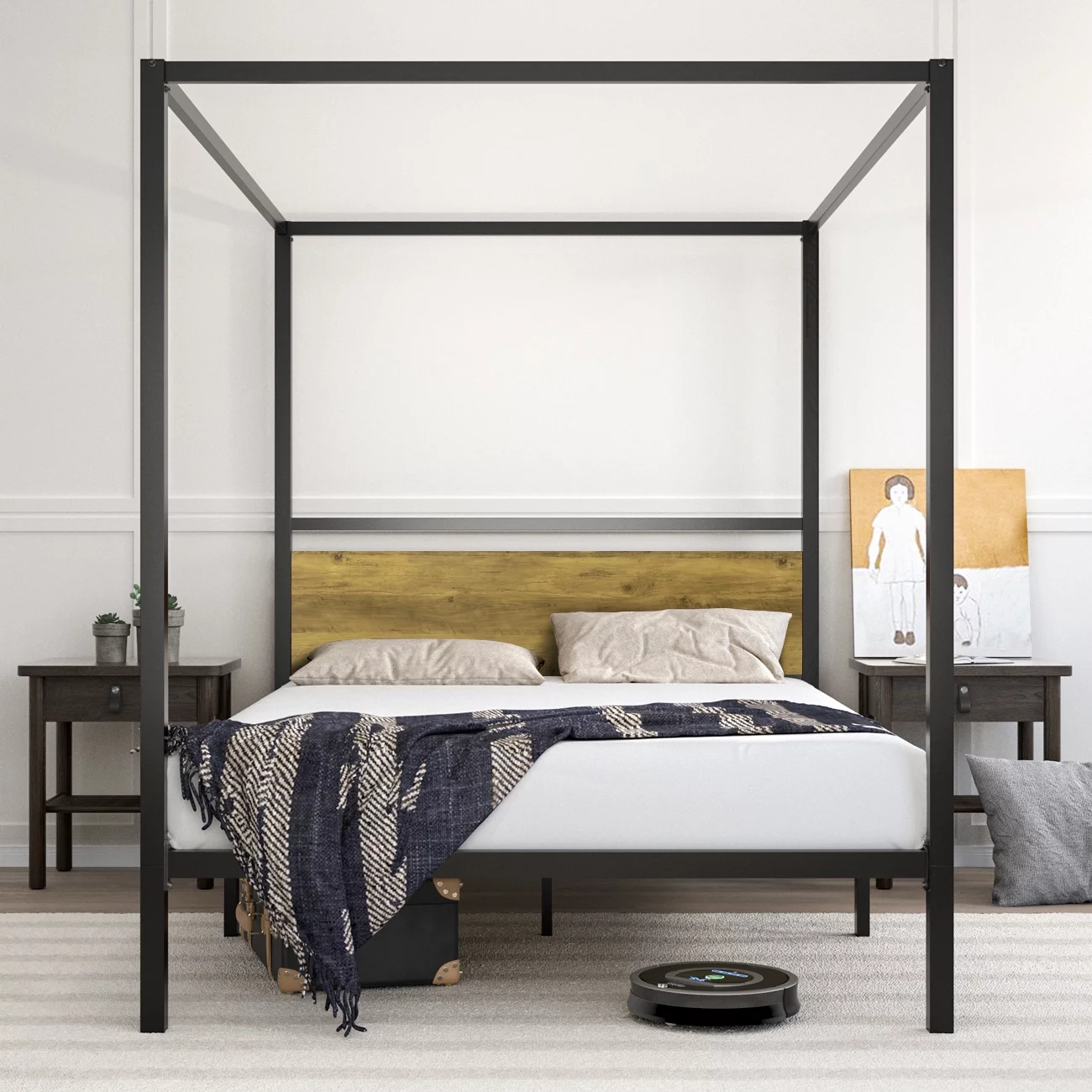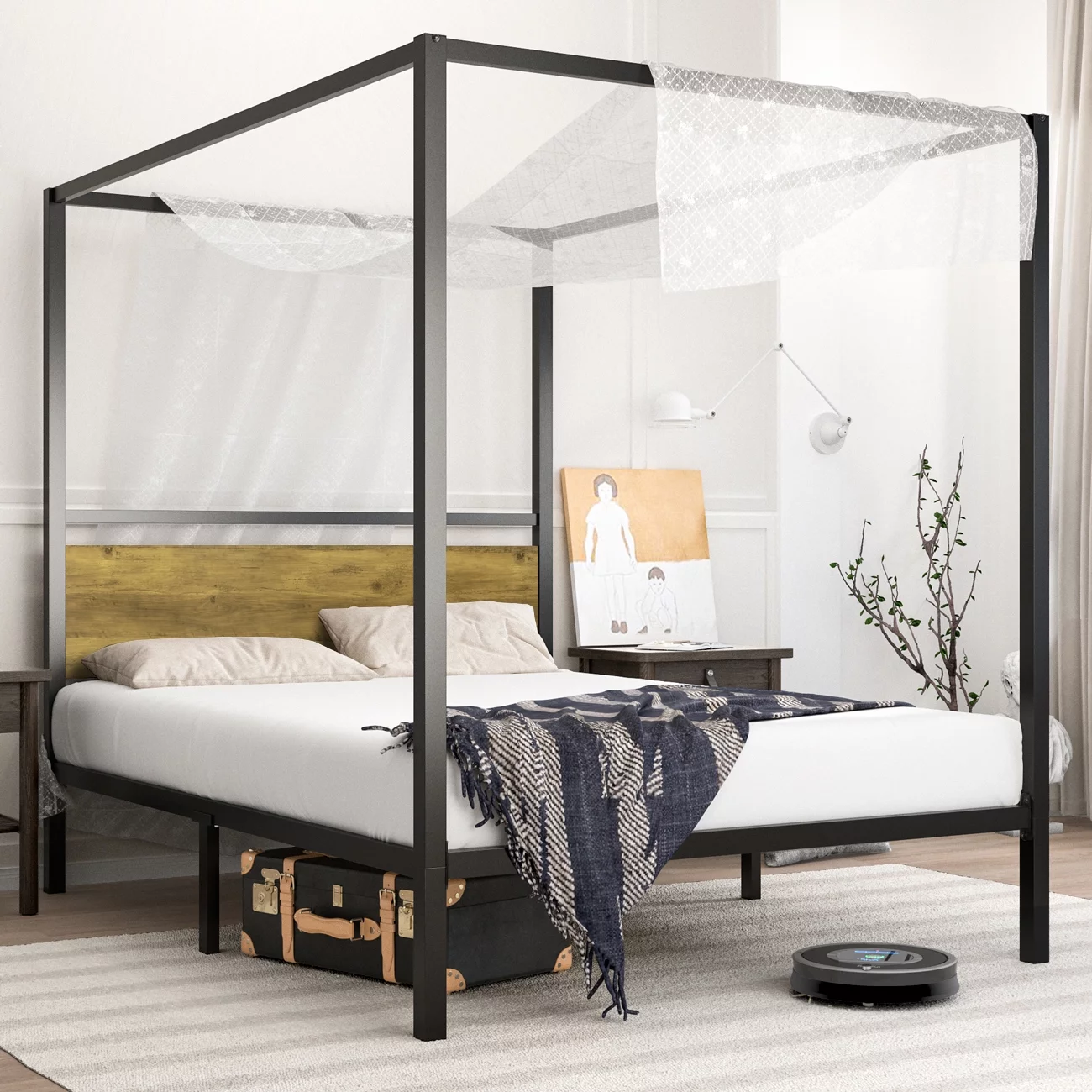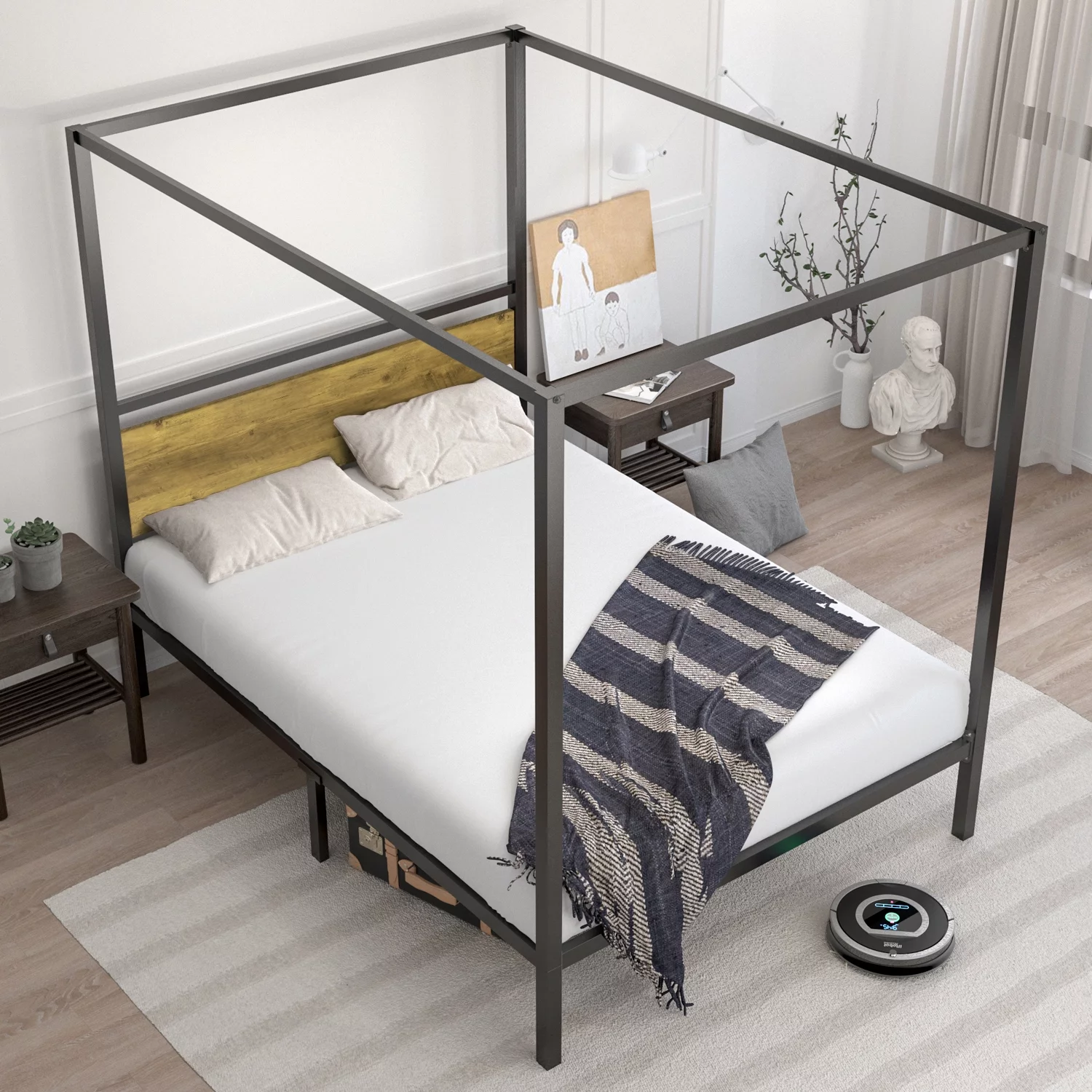 Allewie Full Size Canopy Platform Bed Frame with Wooden Headboard, Light Brown