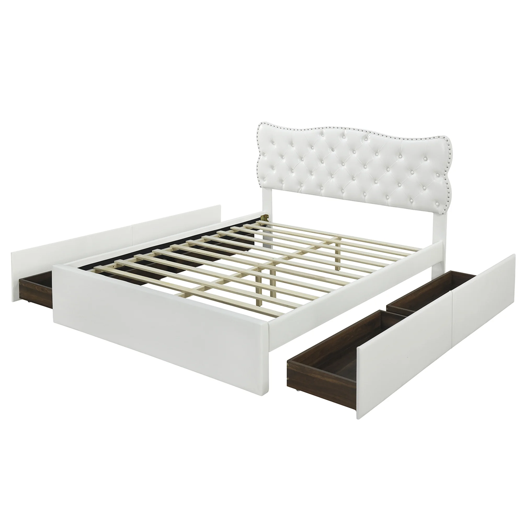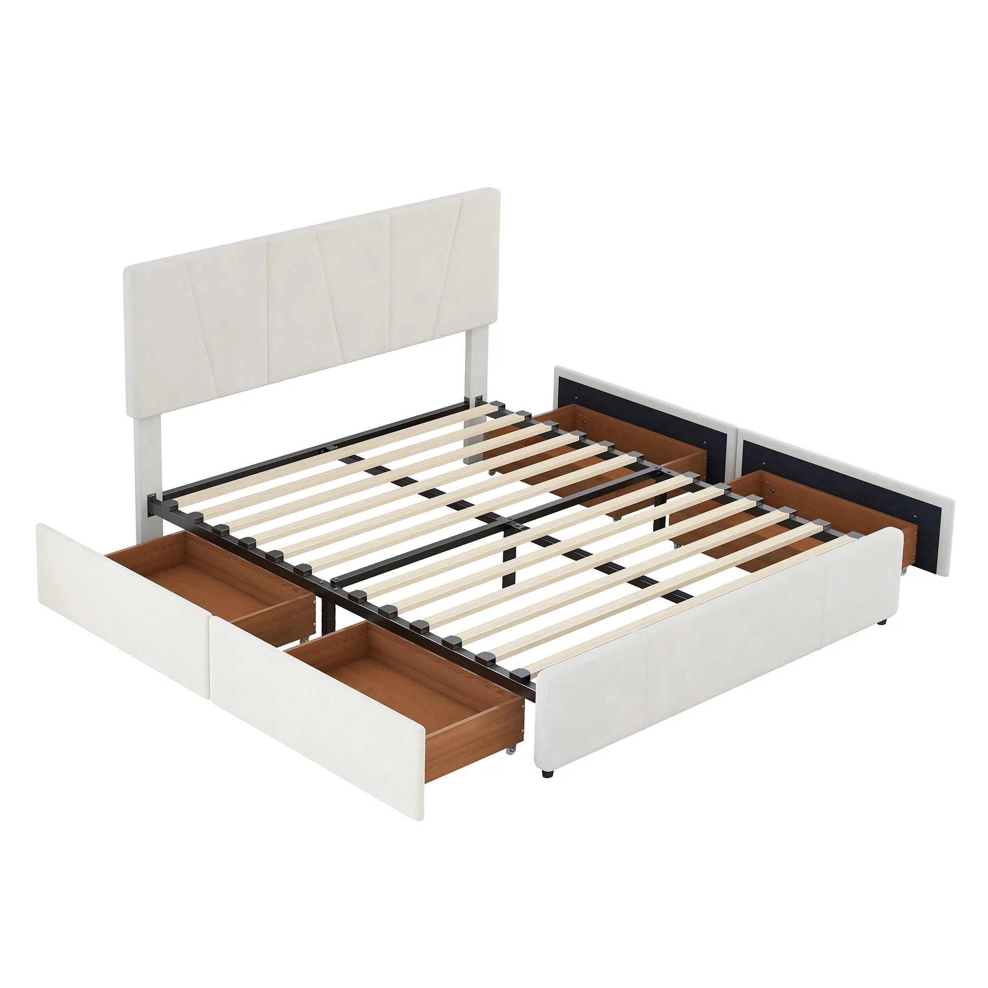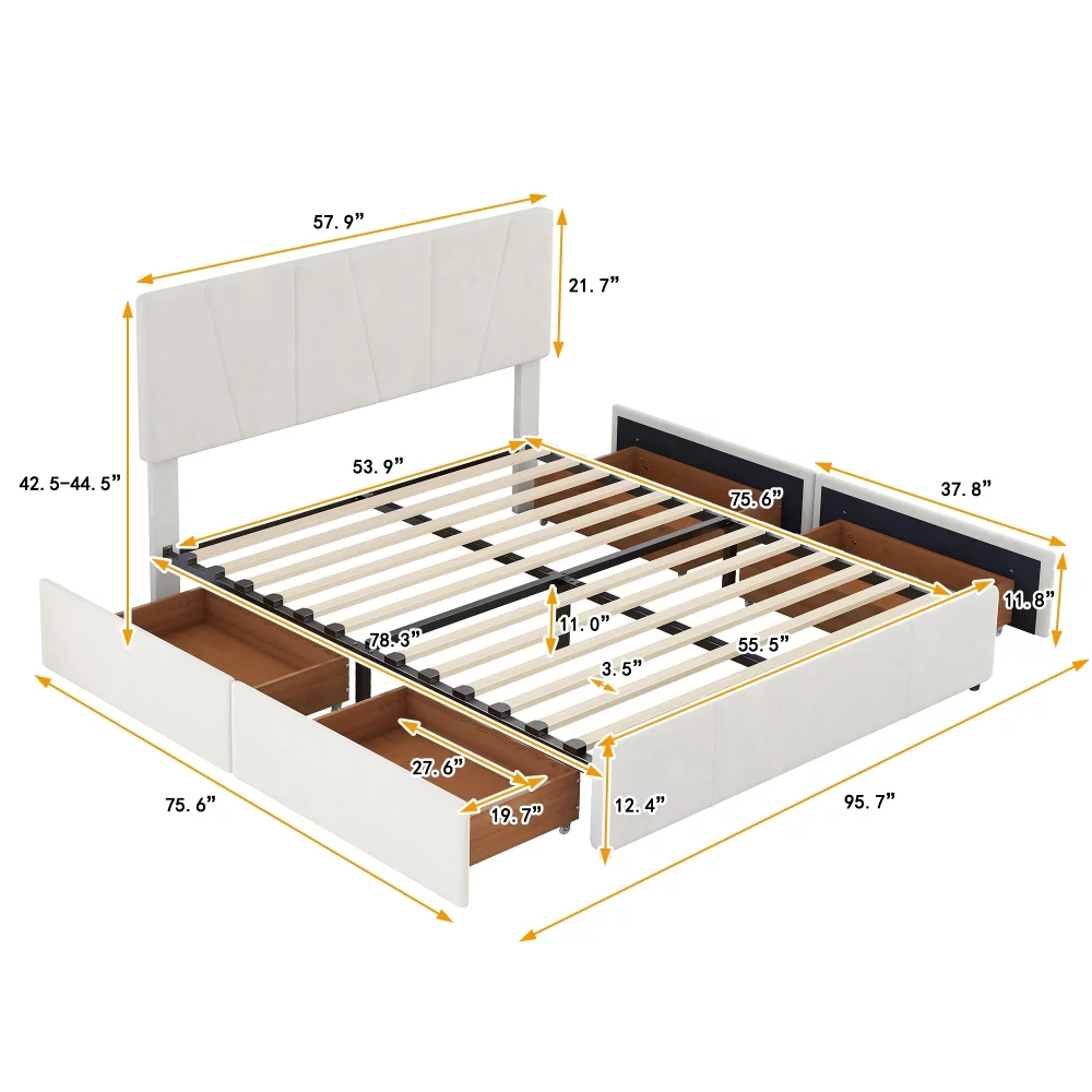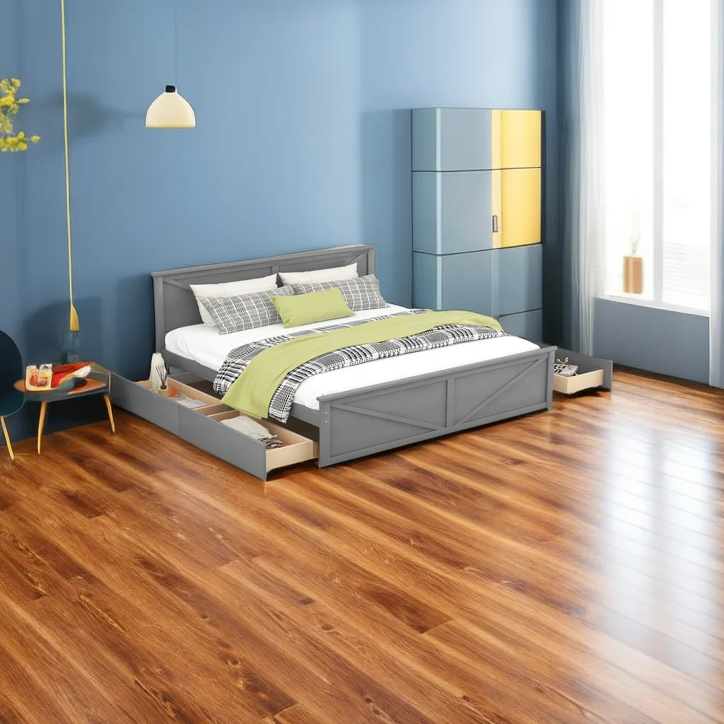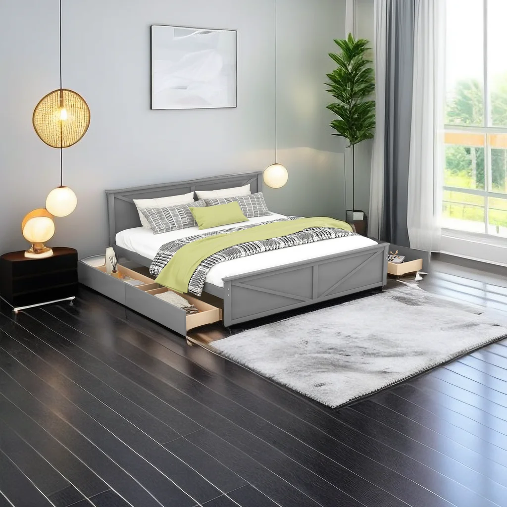 King Size Wooden Platform Bed with Four Storage Drawers and Support Legs