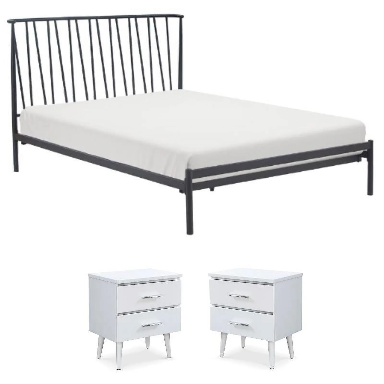 Home Square 3-Piece Set with 2 Side Tables and Metal King Bed in White & Black