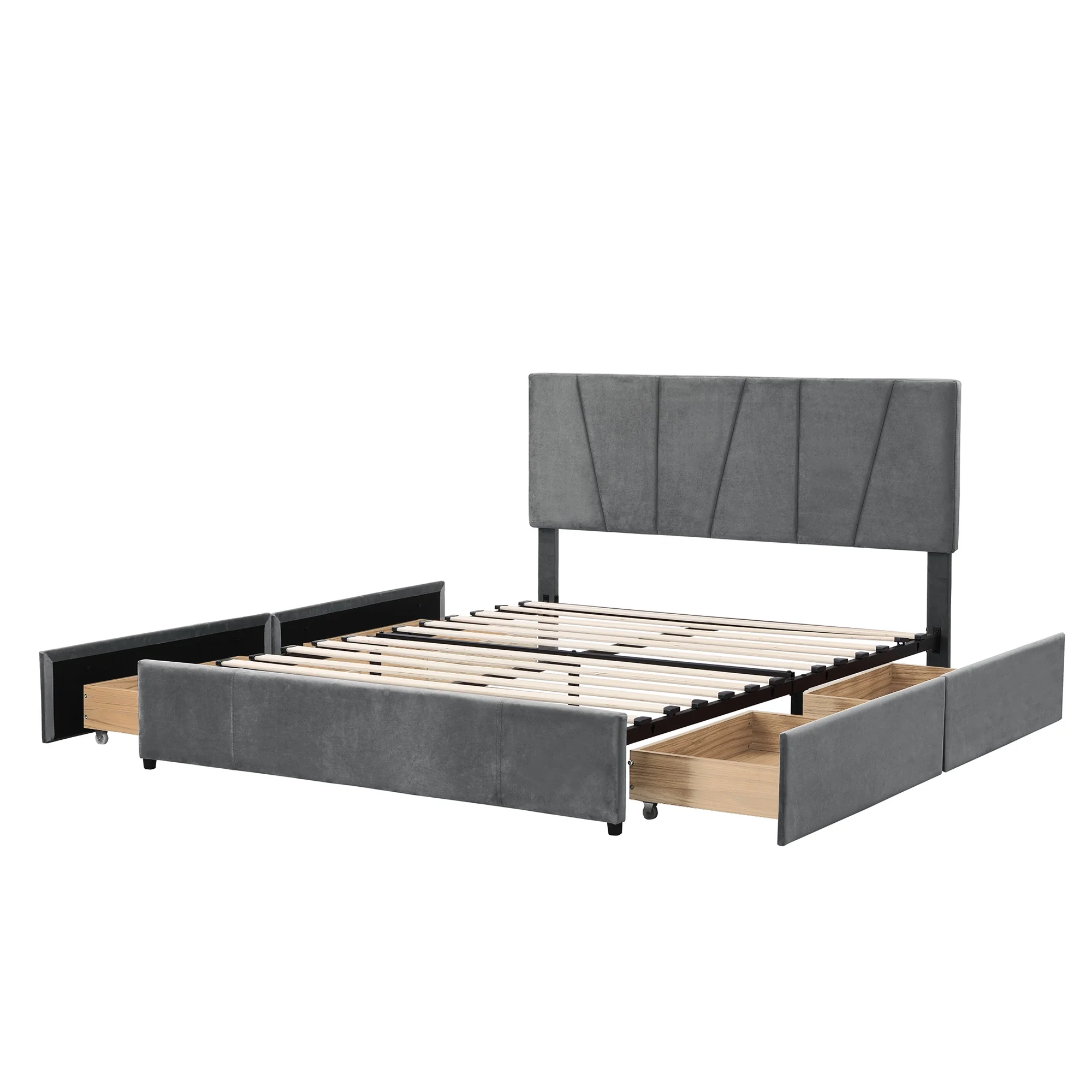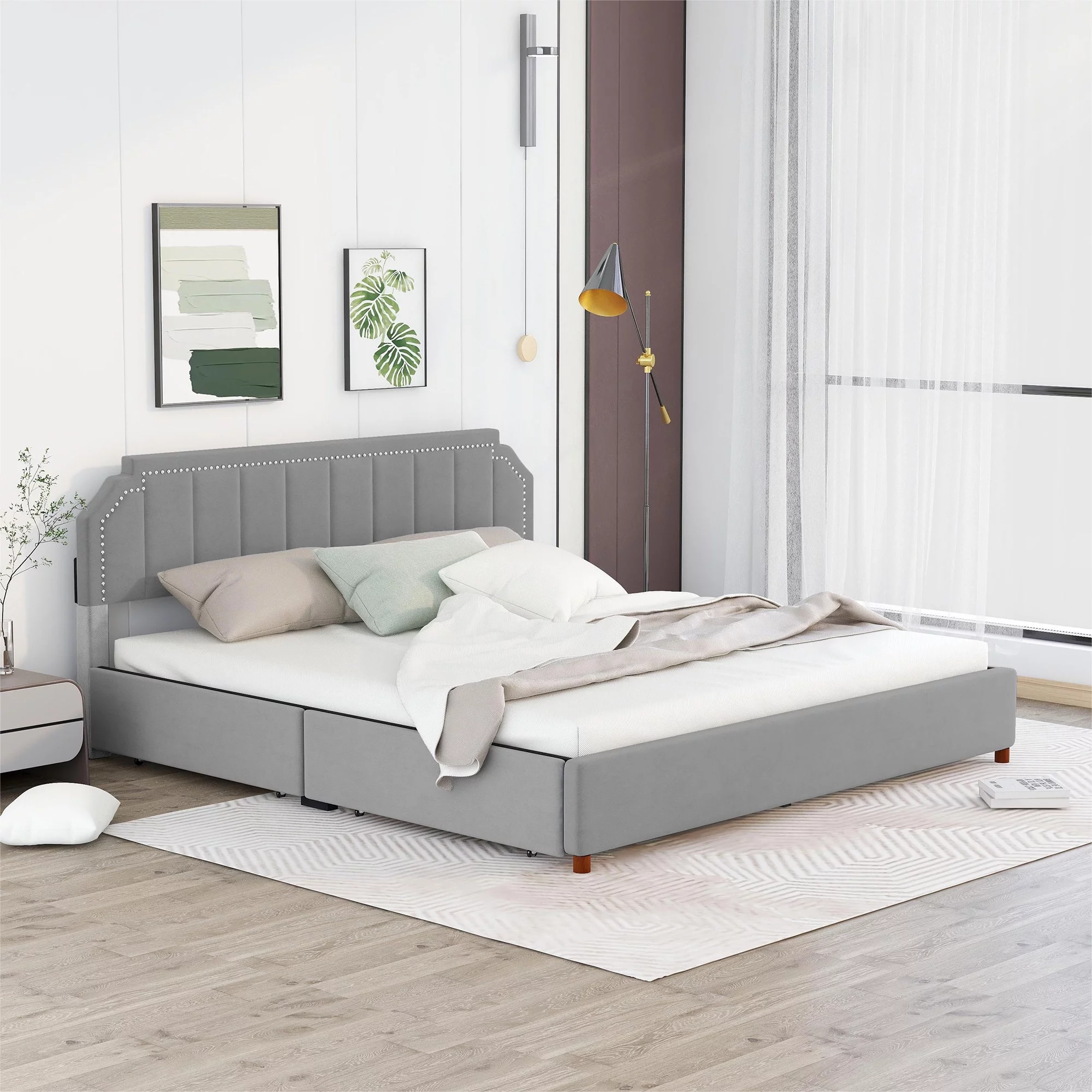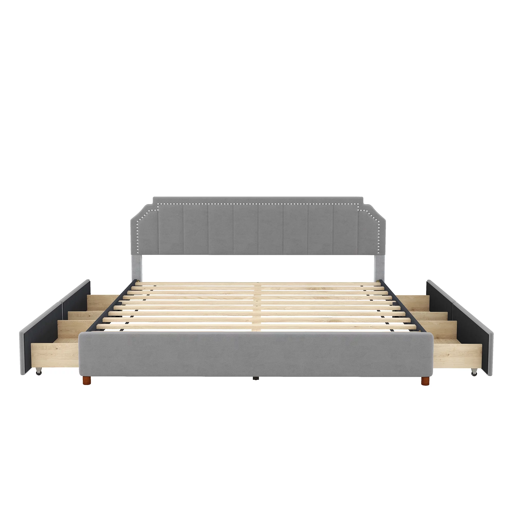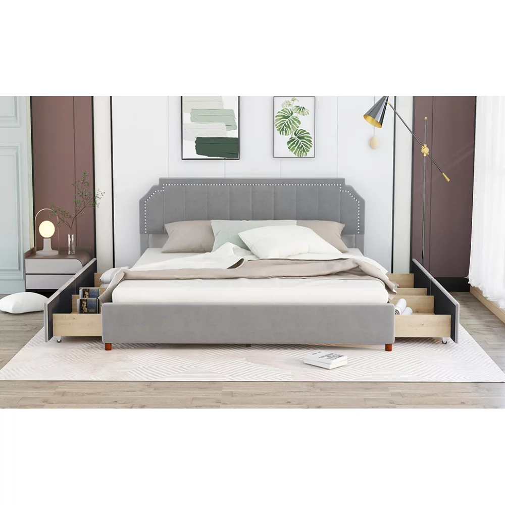 King Size Upholstery Platform Bed with Four Storage Drawers, Cosymart Support Legs, Grey