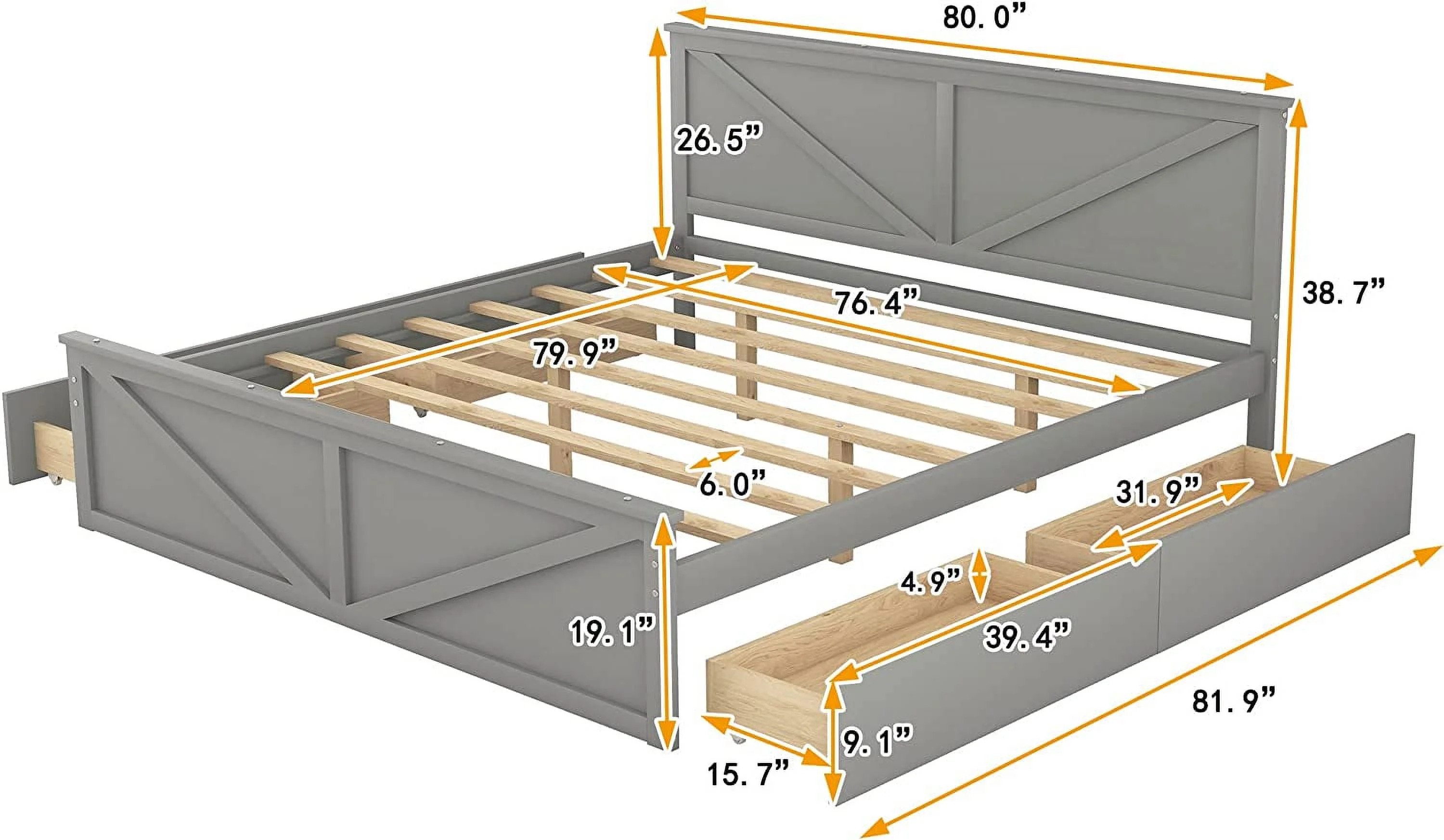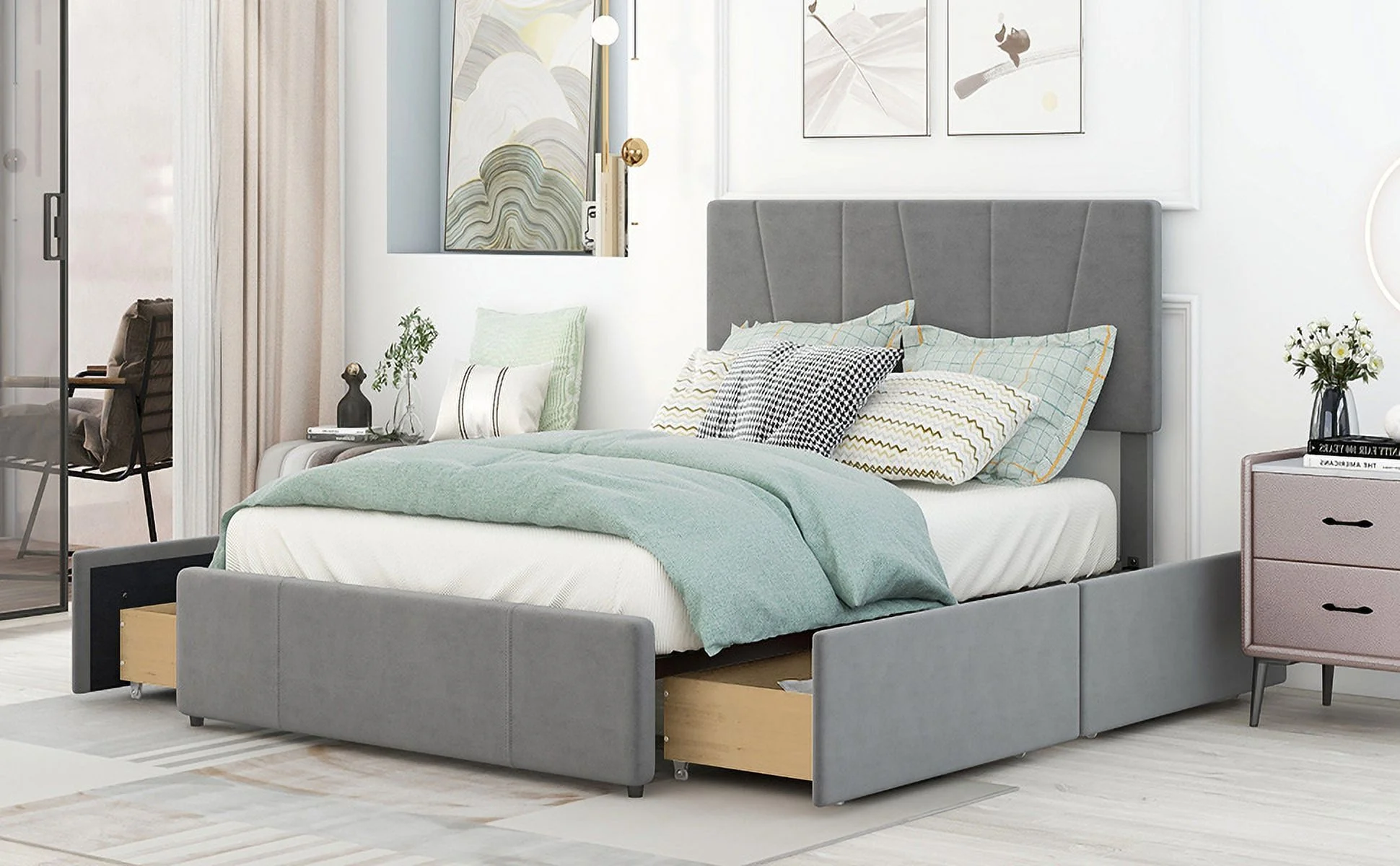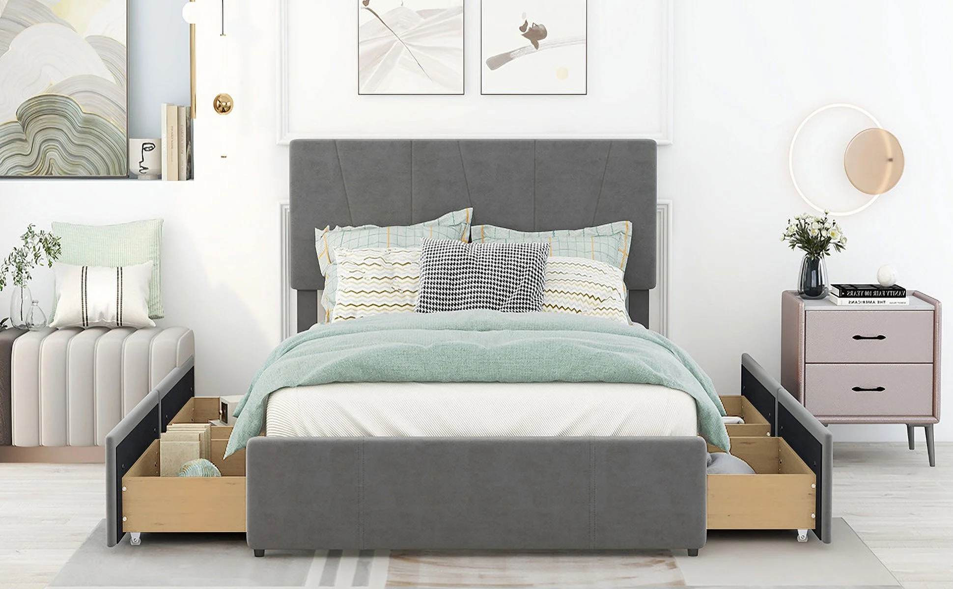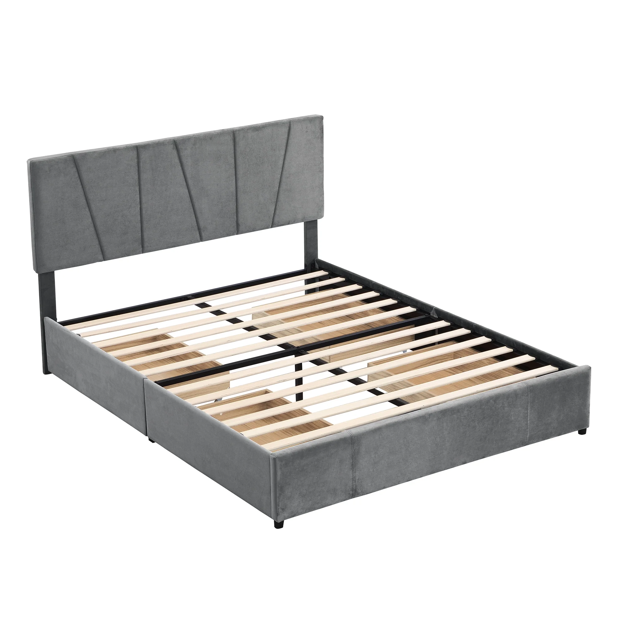 King Size Upholstery Platform Bed with Four Storage Drawers, Cosymart Support Legs, Grey