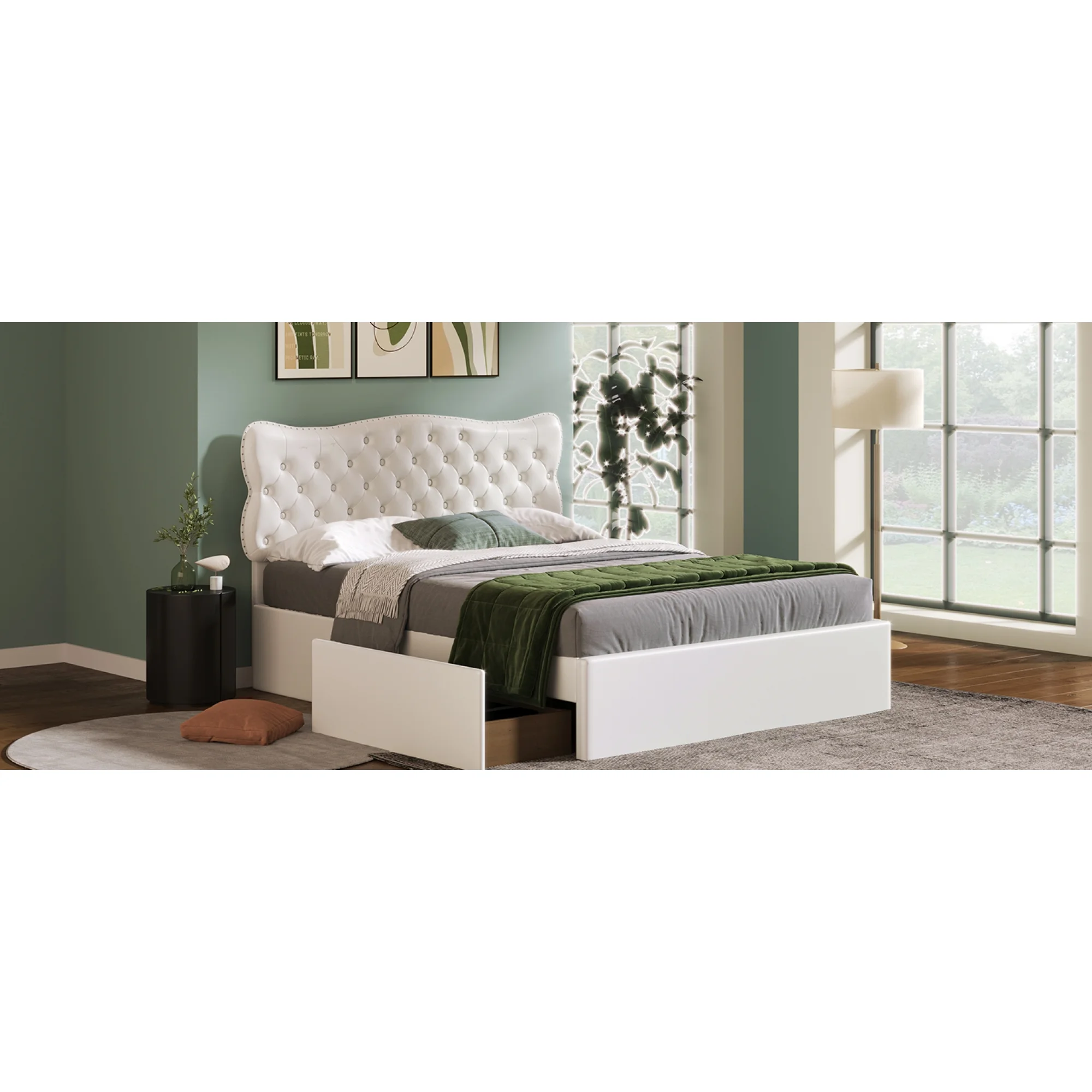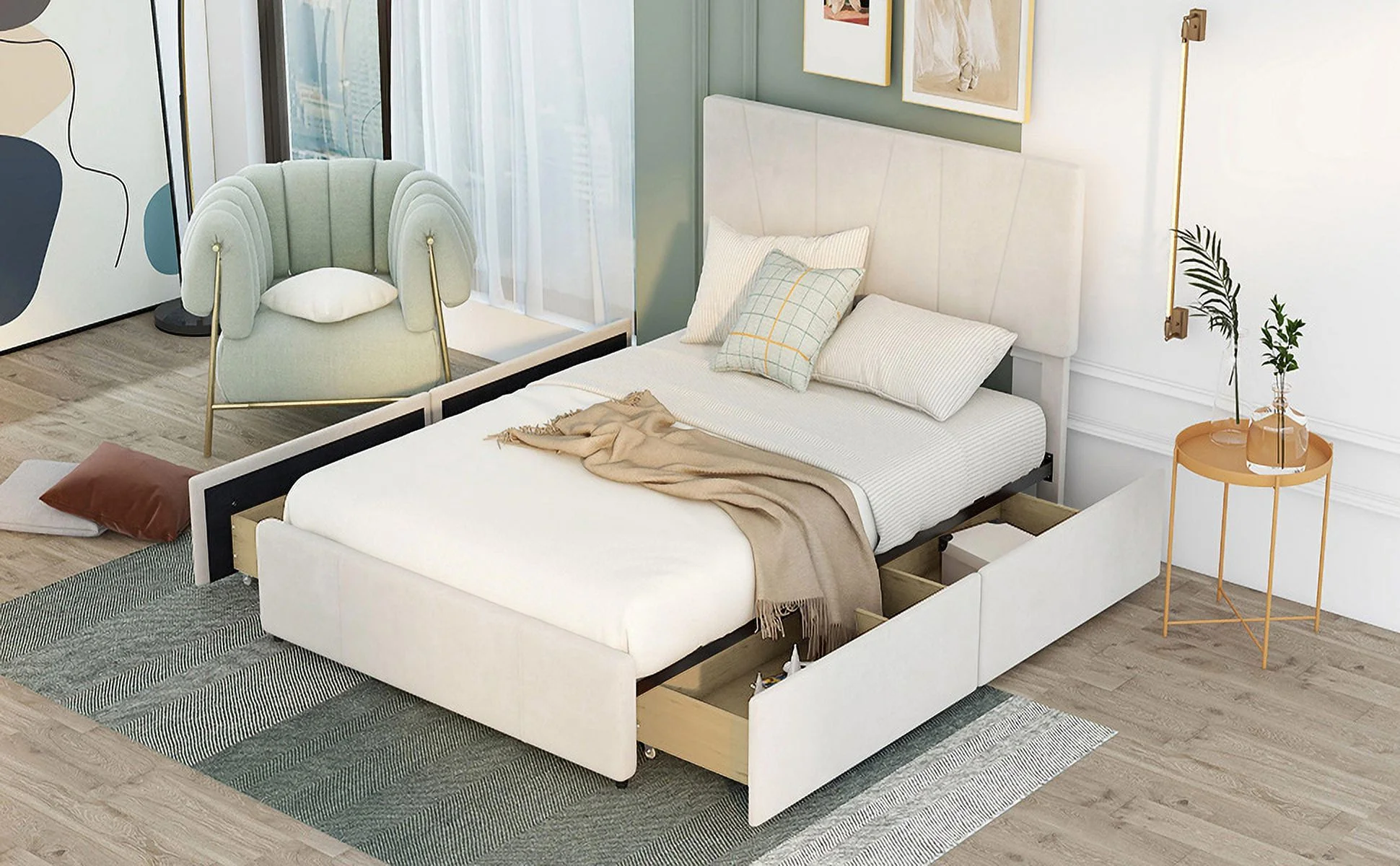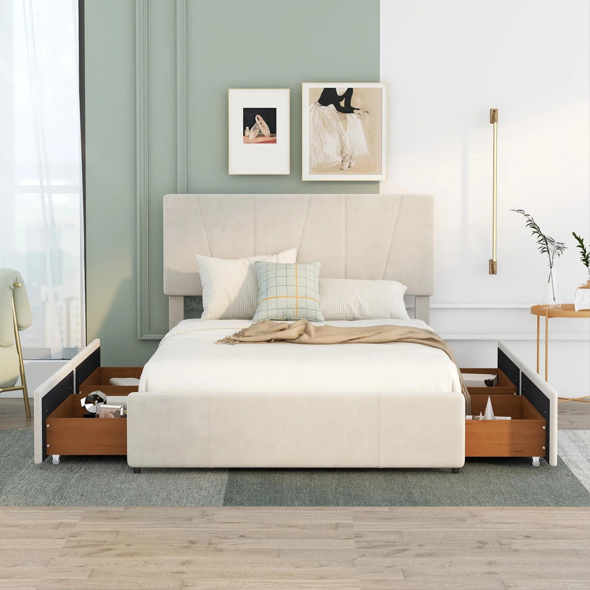 CoSoTower Queen Size Upholstery Platform Bed with Four Drawers On Two Sides, Adjustable Headboard, Beige