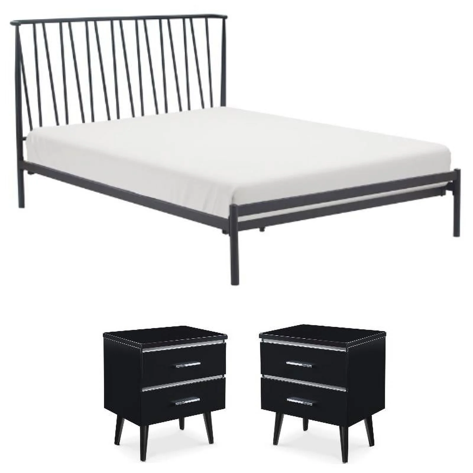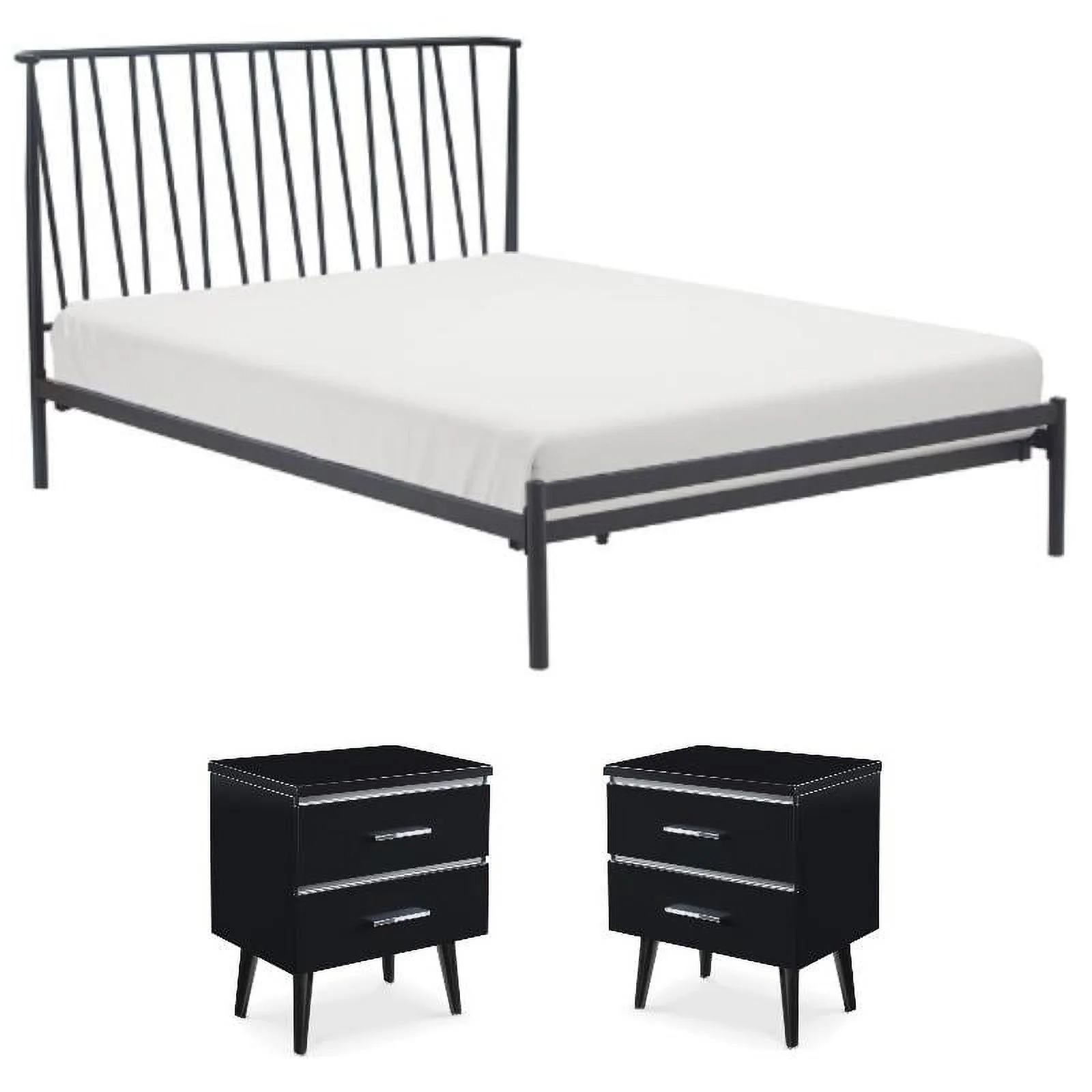 Home Square 3-Piece Set with 2 Side Tables and Metal Queen Bed in Black