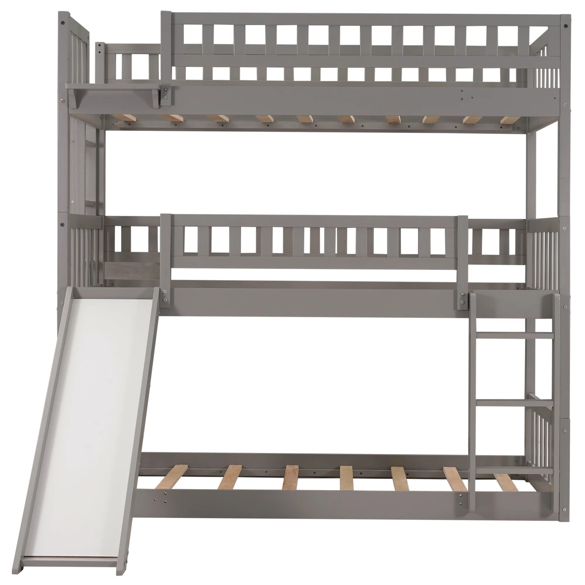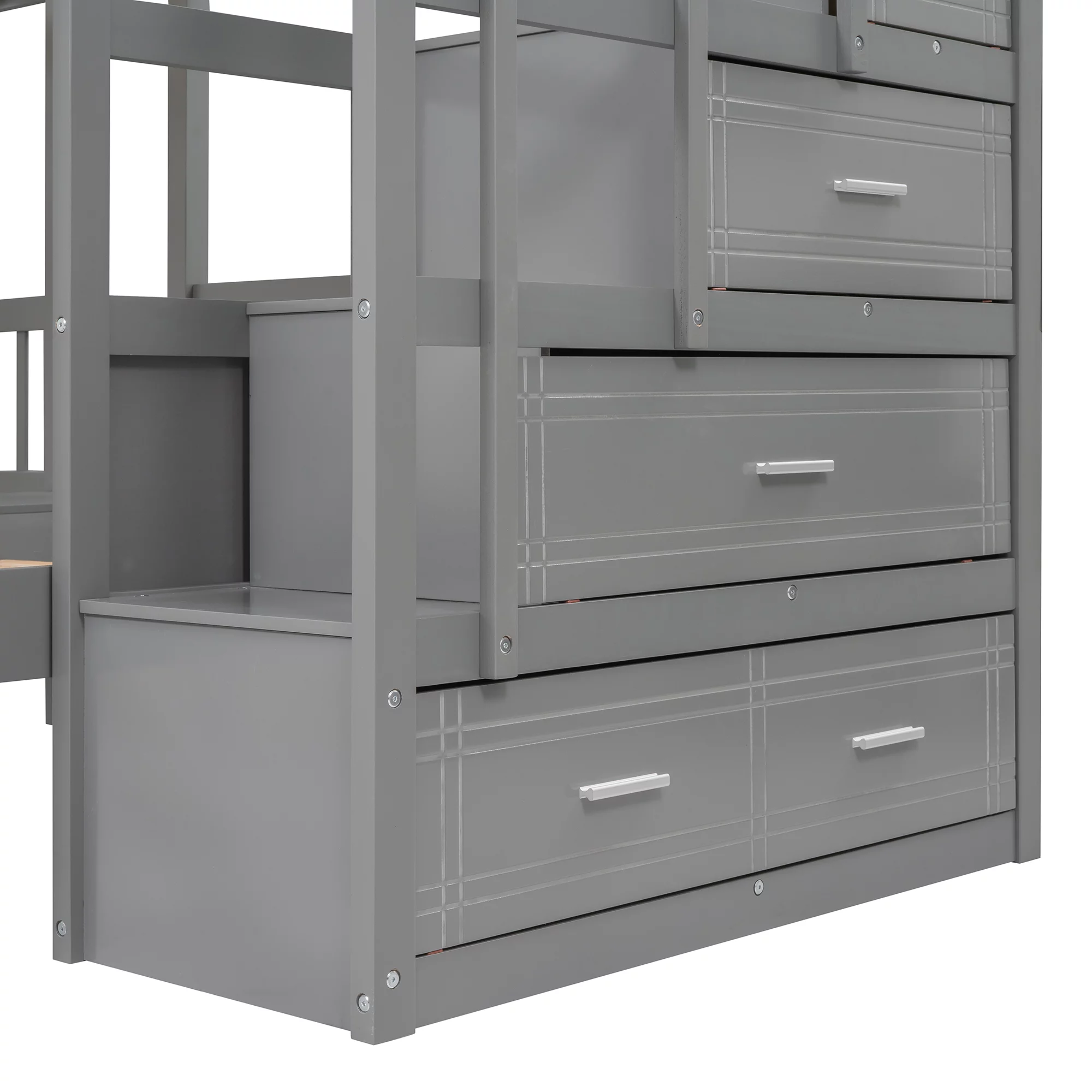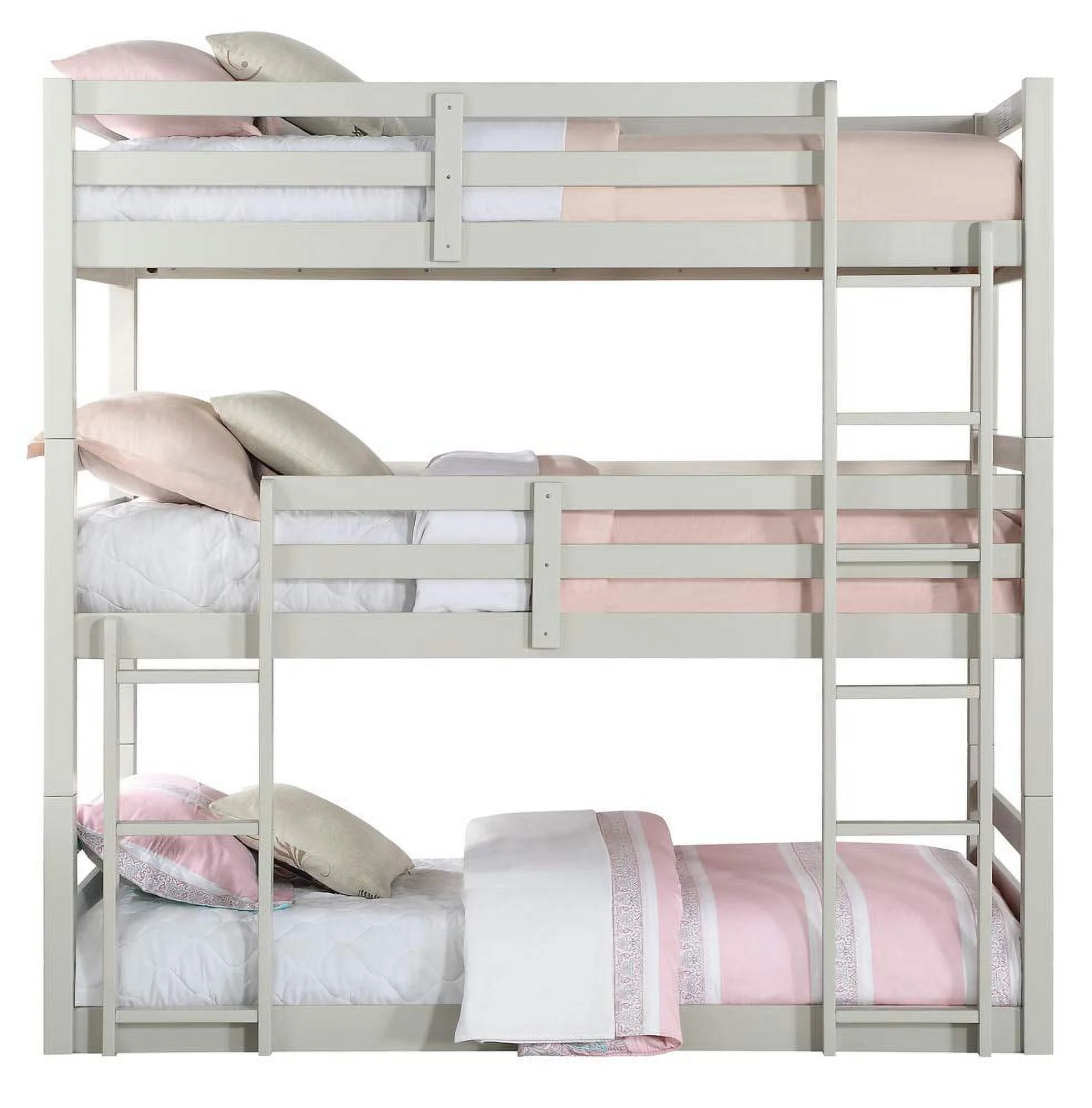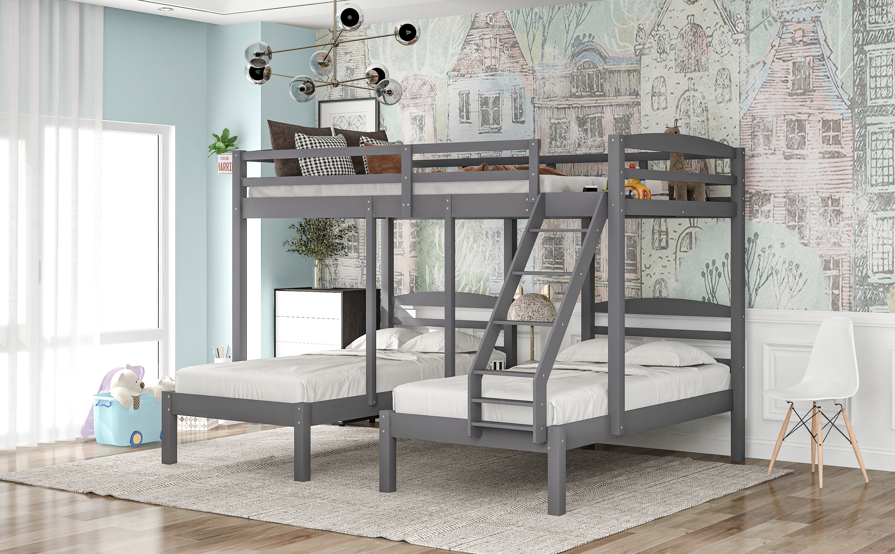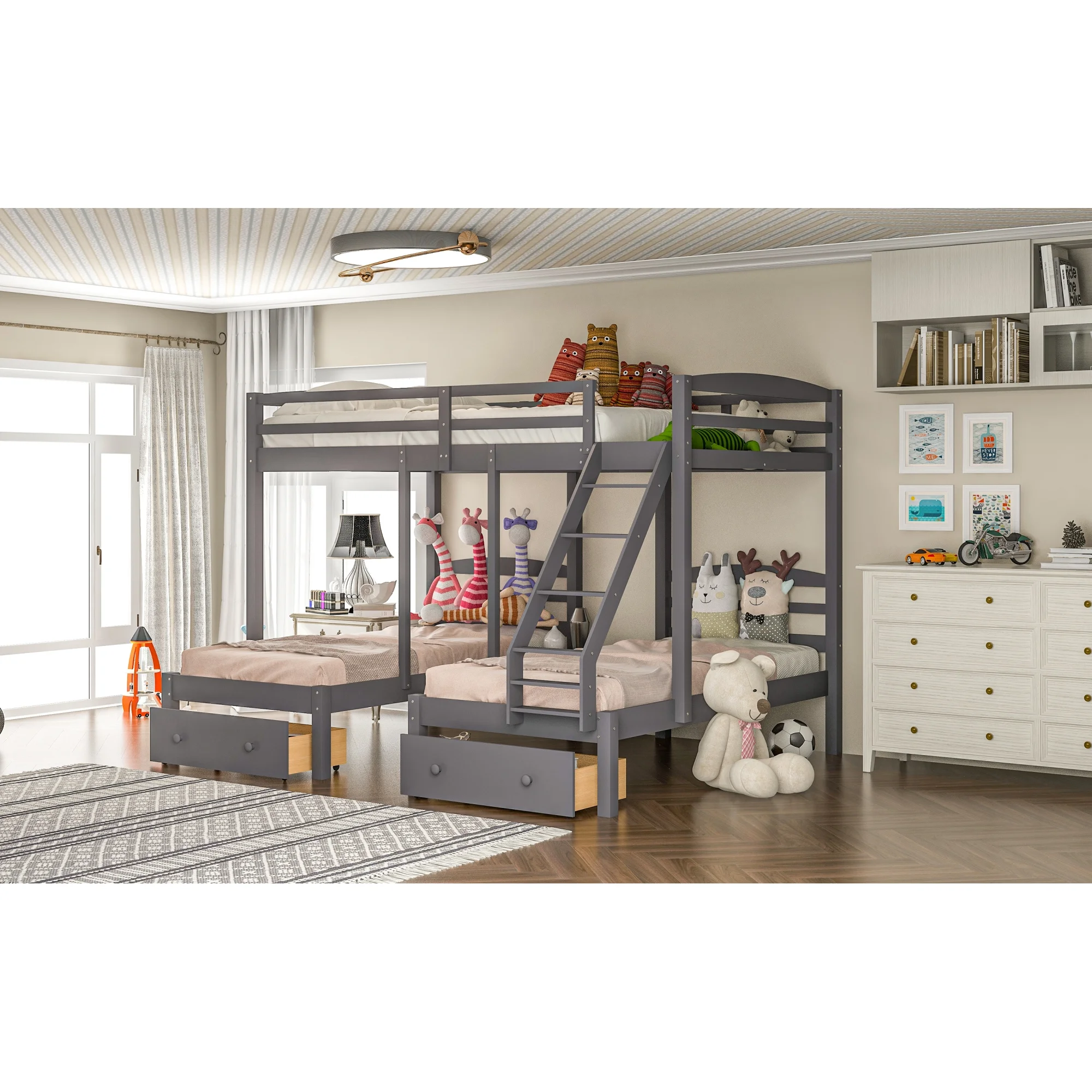 Dawn Whisper Full over Twin and Twin Bunk Bed, Triple Bunk Bed with Drawers, Gray