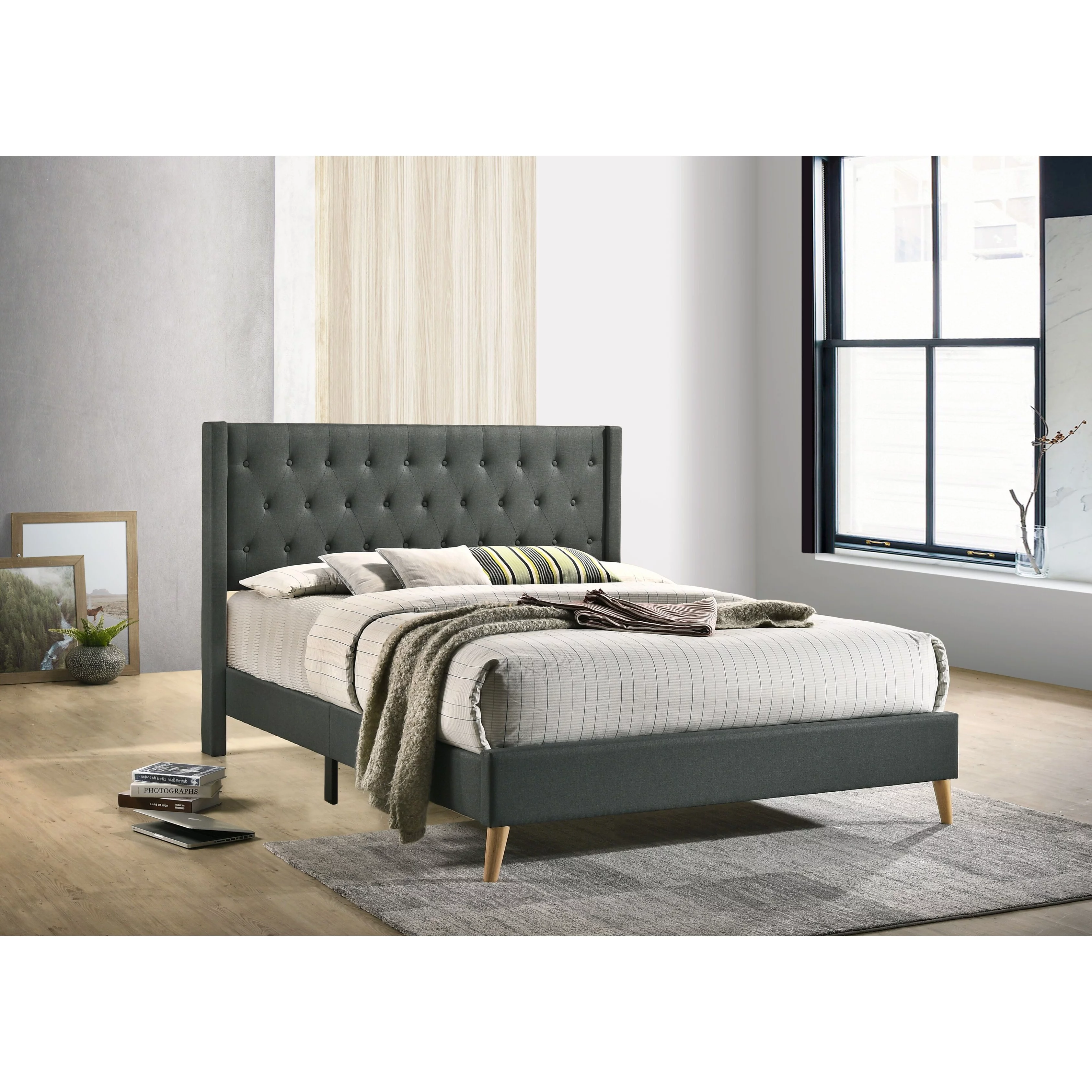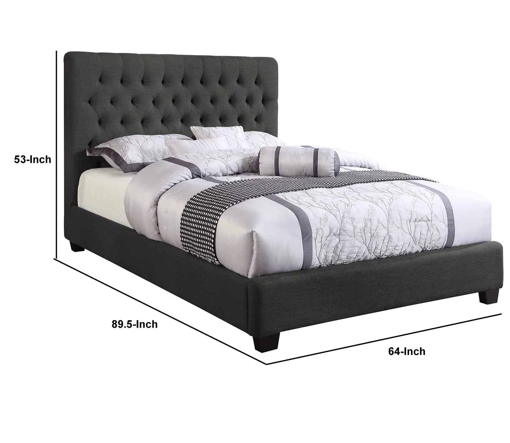 Benzara BM205555 Wooden Queen Size Platform Bed with Deep Button Tufted Headboard, Gray