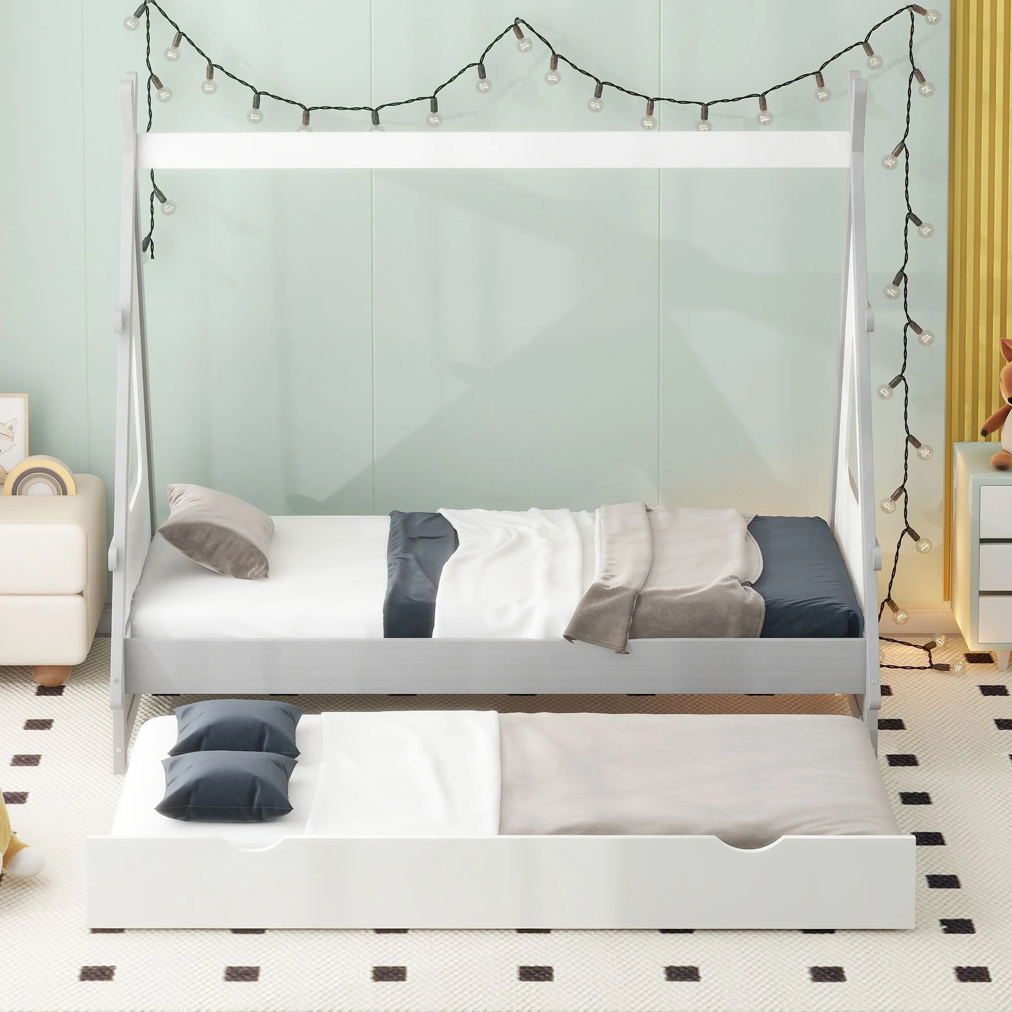 Bed Frame With Trundle, Kids Platform Bed With Pull Out Trundle,Solid Wood, No Box Spring Needed