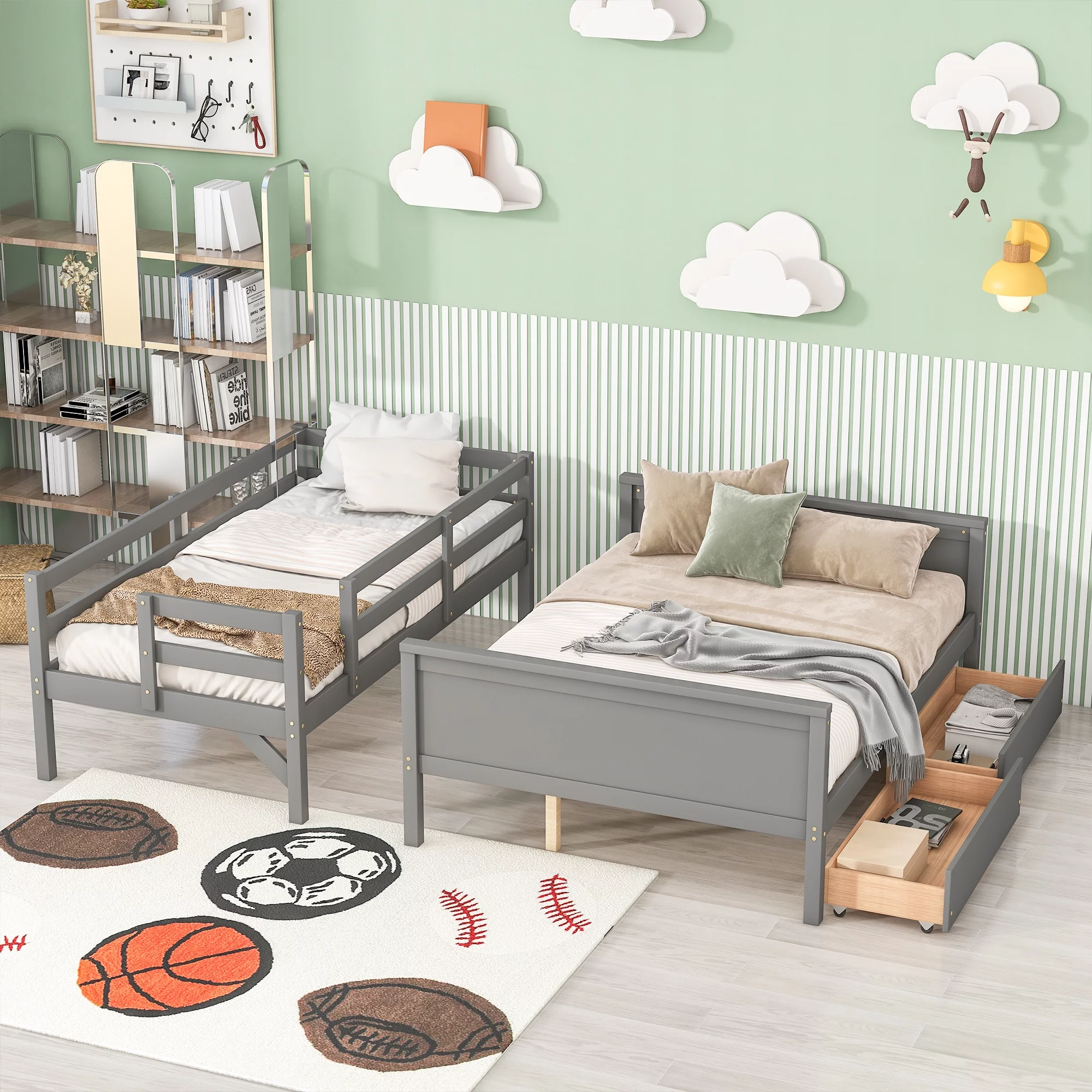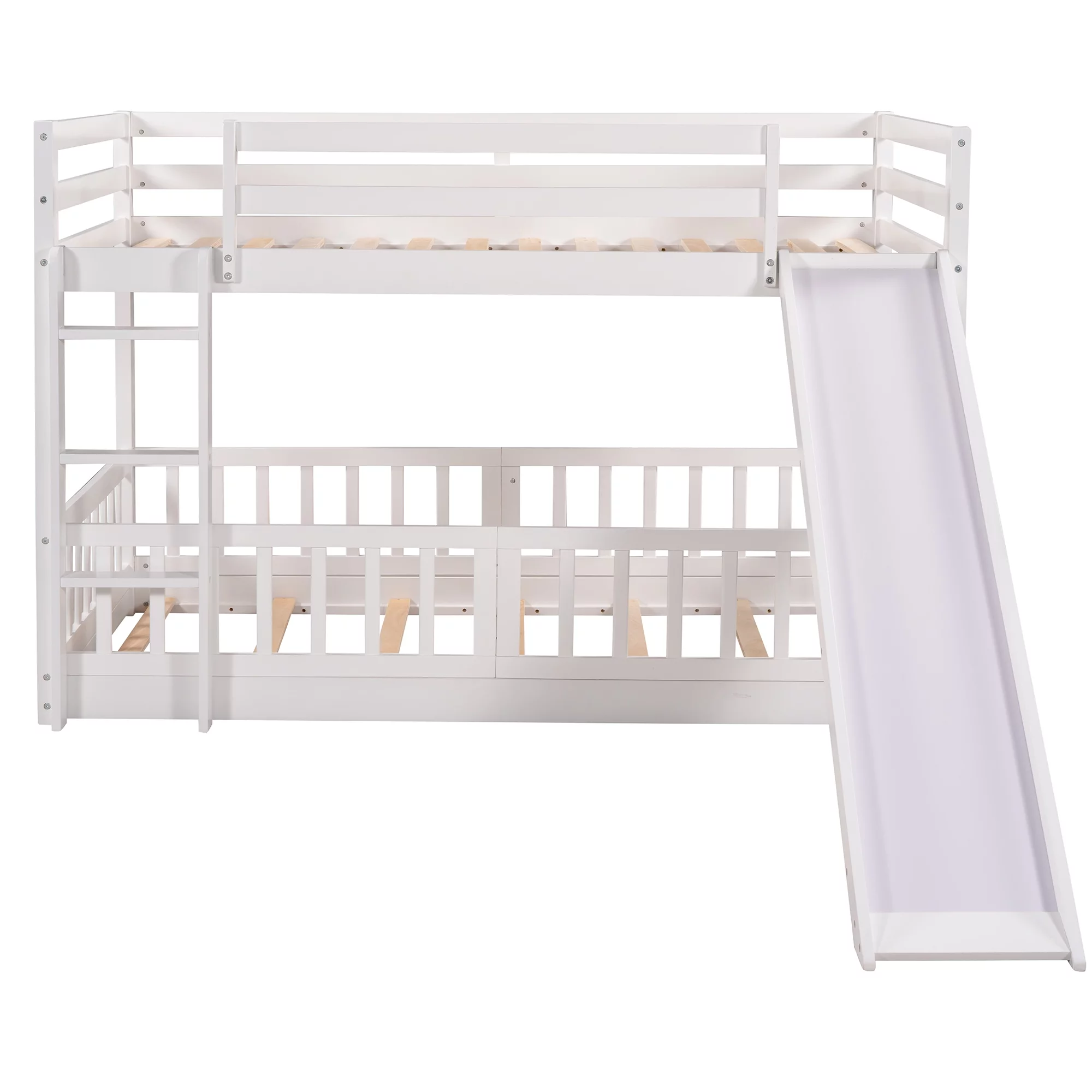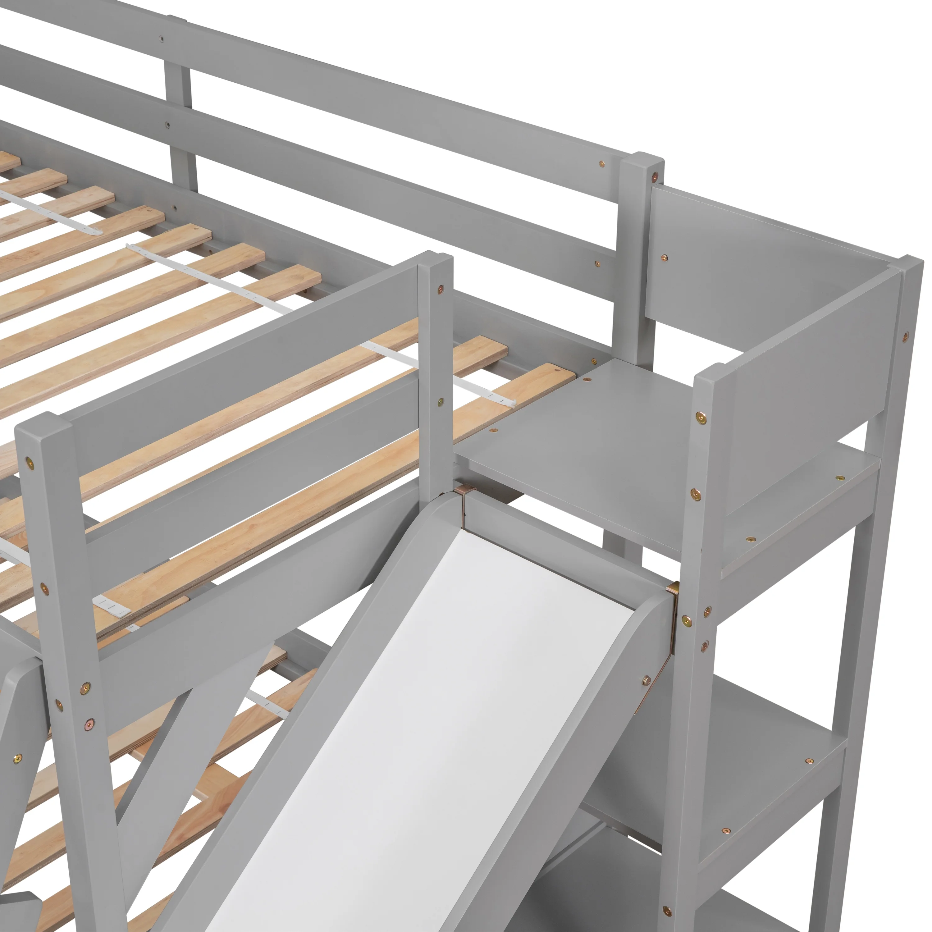 L-Shaped Bunk Bed Sets, Twin over Full & Twin over Twin Size with Slide and Ladder, Solid Wood Slats Support Solid Grey