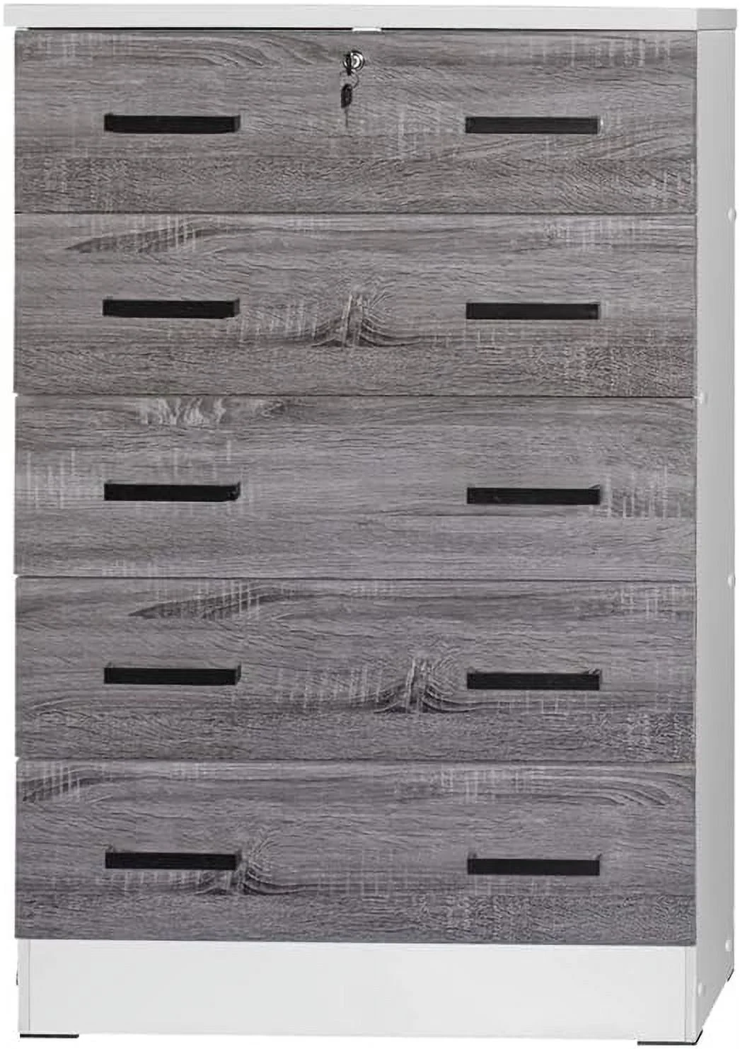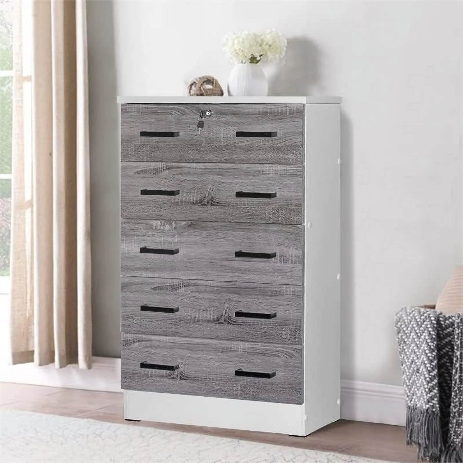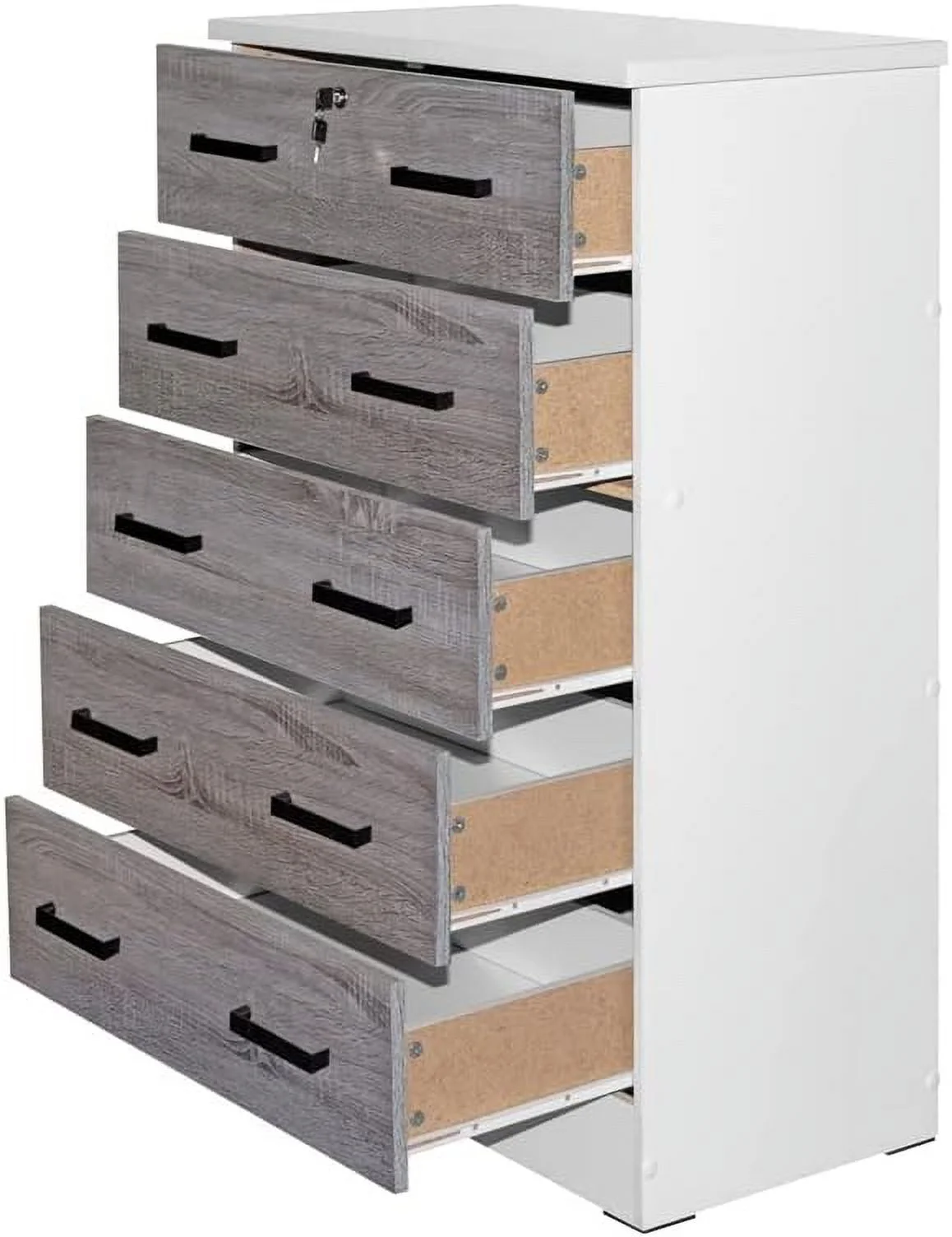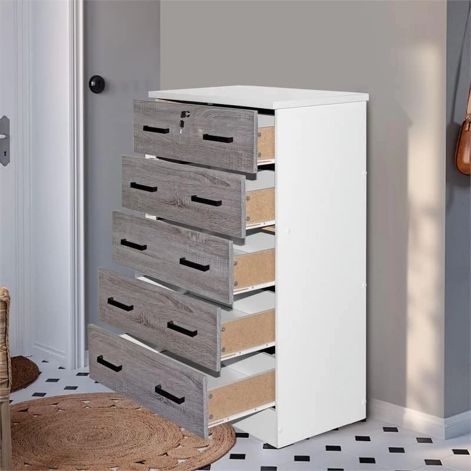 WC5-Wht-Gry Cindy 5 Drawer Chest Wooden Dresser with Lock, White & Gray