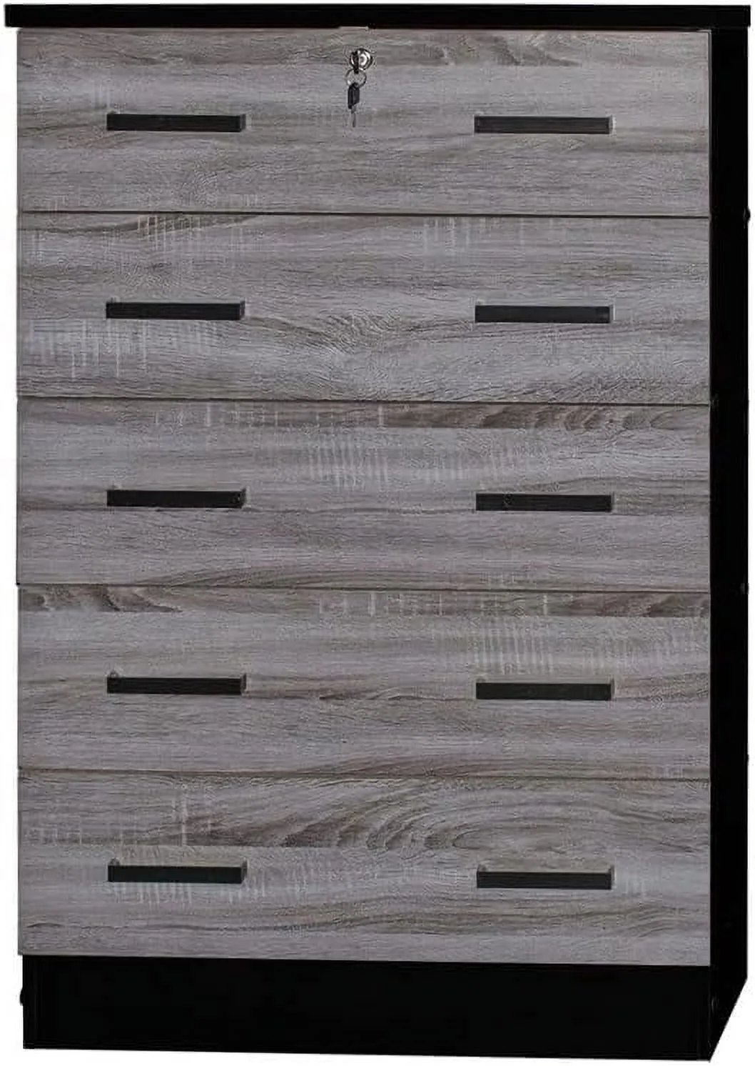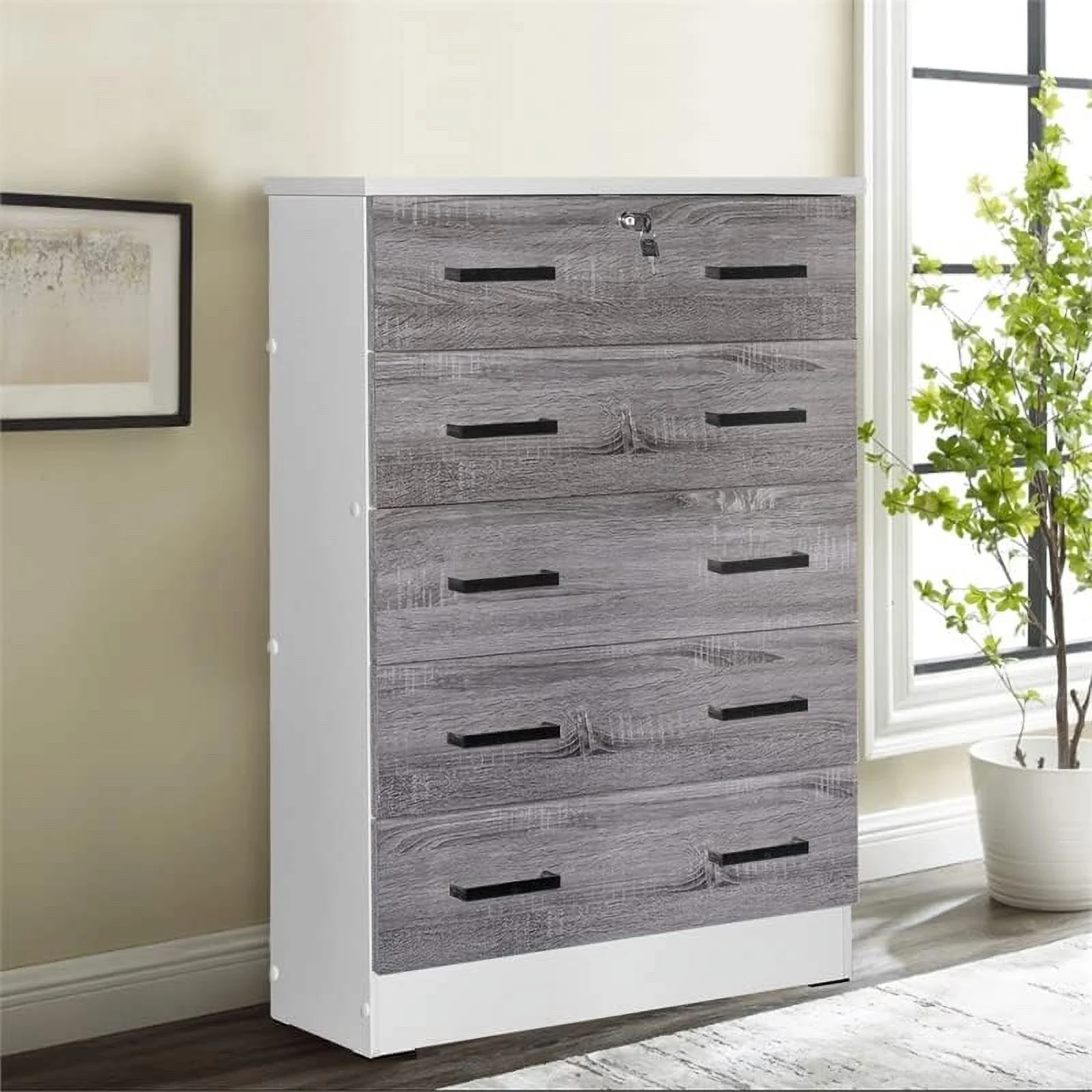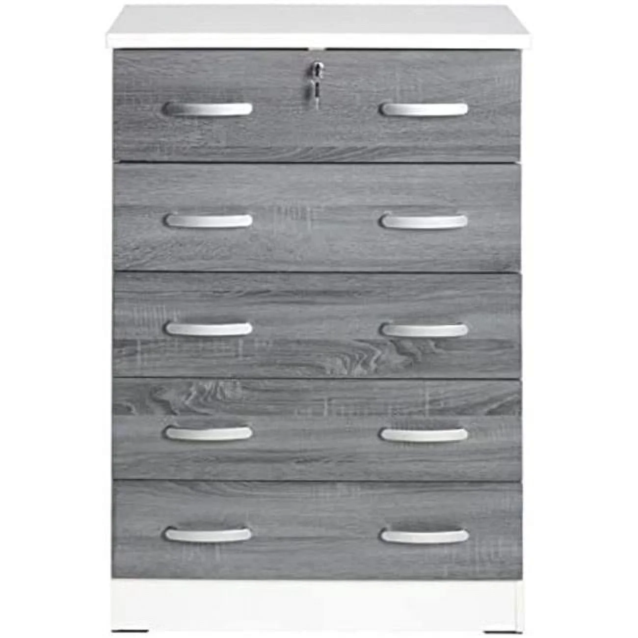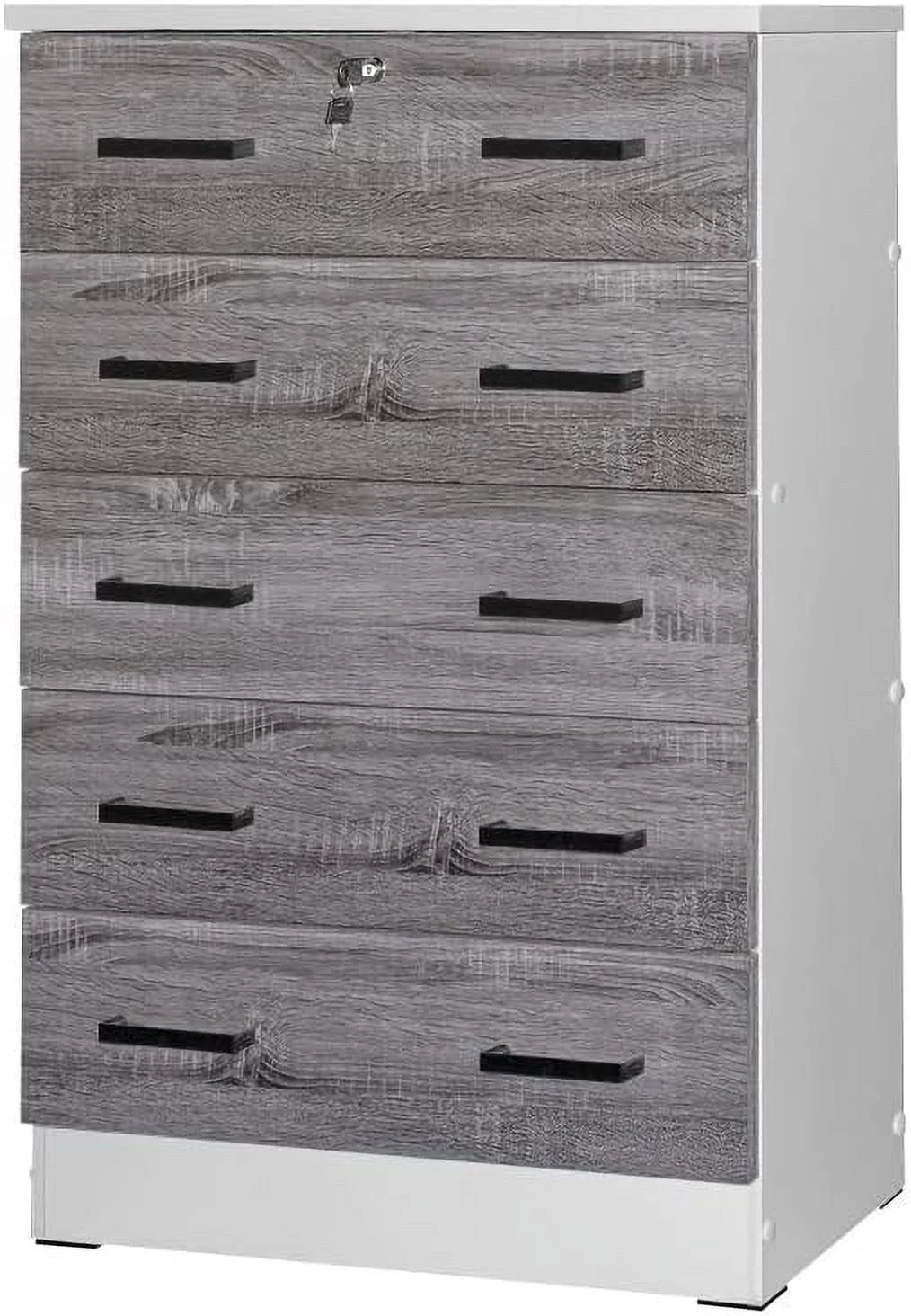 WC5-Wht-Gry Cindy 5 Drawer Chest Wooden Dresser with Lock, White & Gray