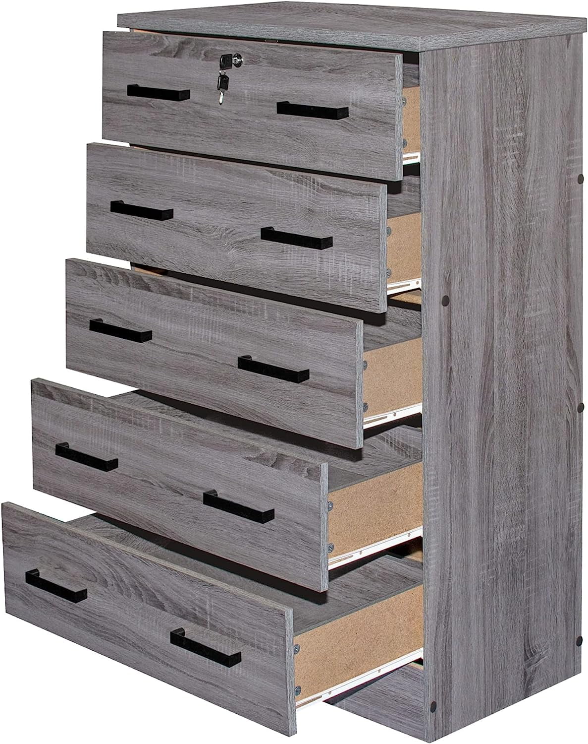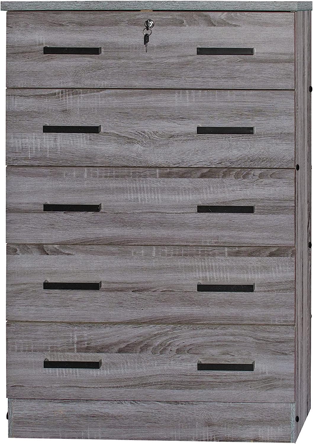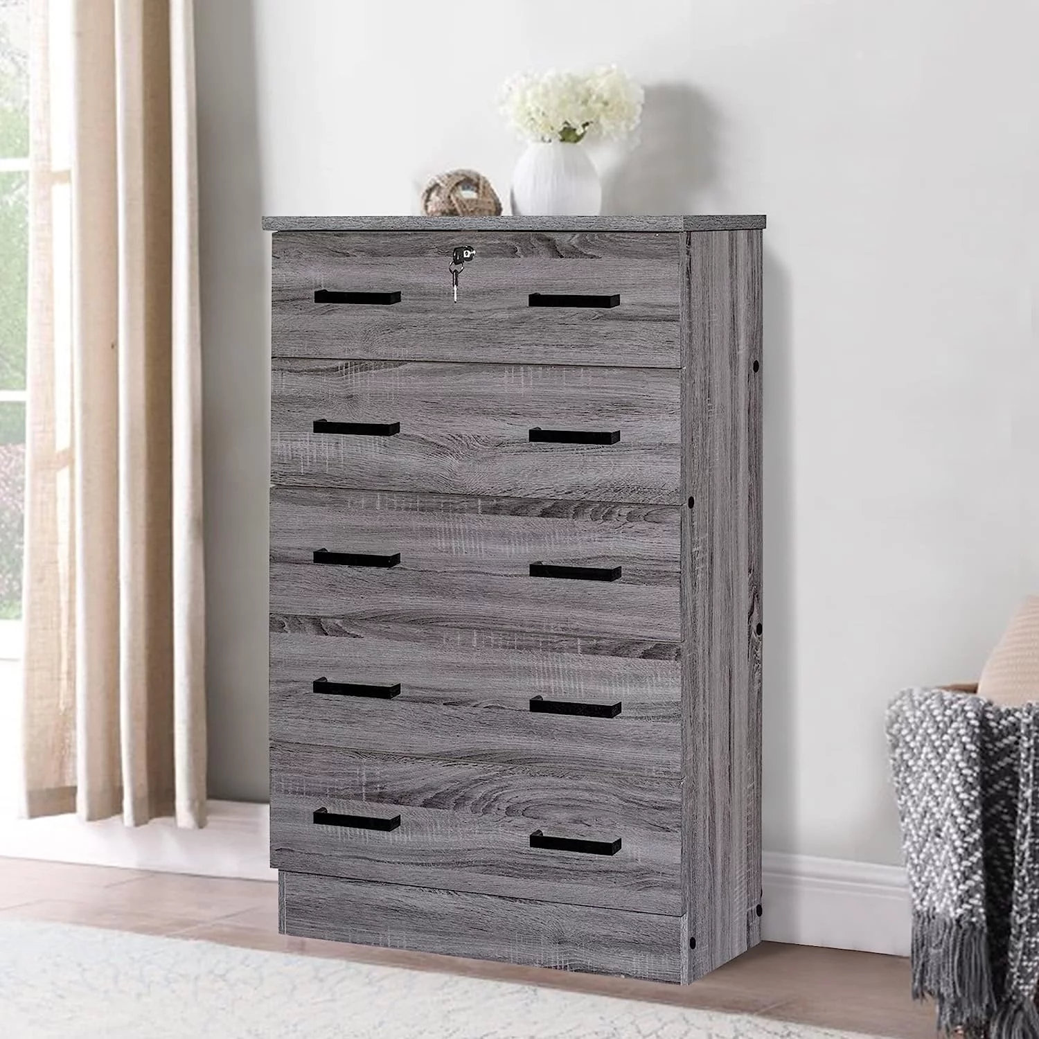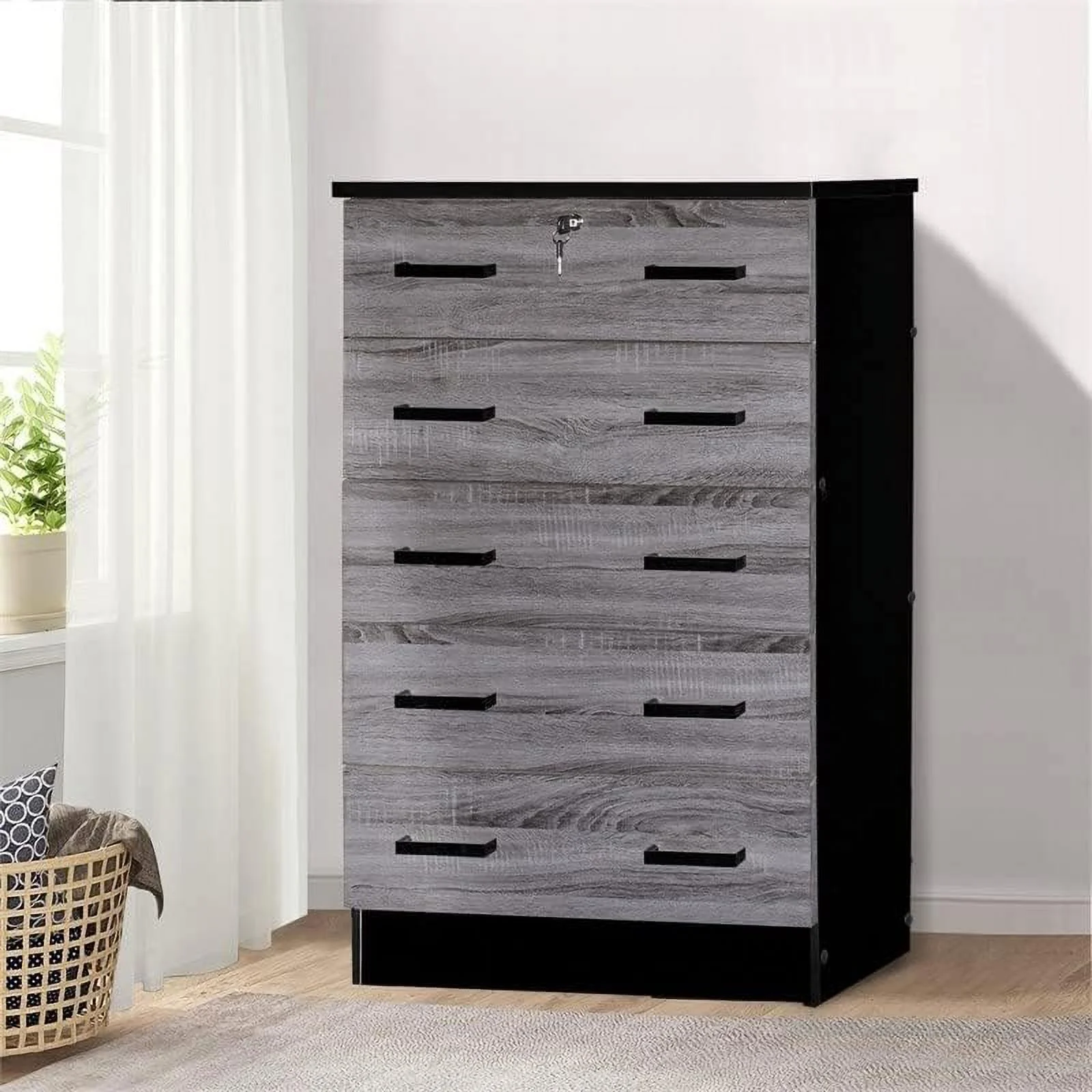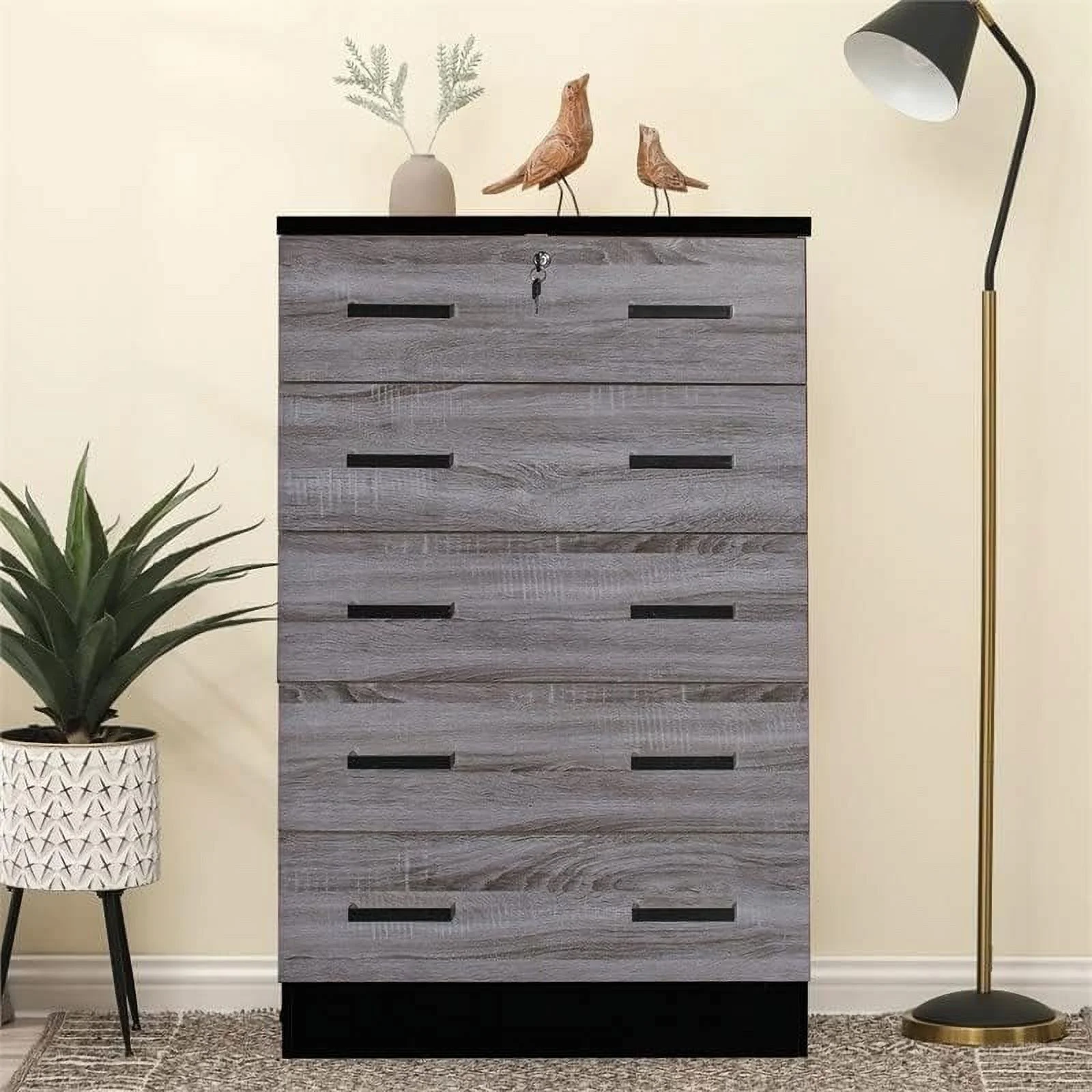 WC5-Wht-Gry Cindy 5 Drawer Chest Wooden Dresser with Lock, White & Gray