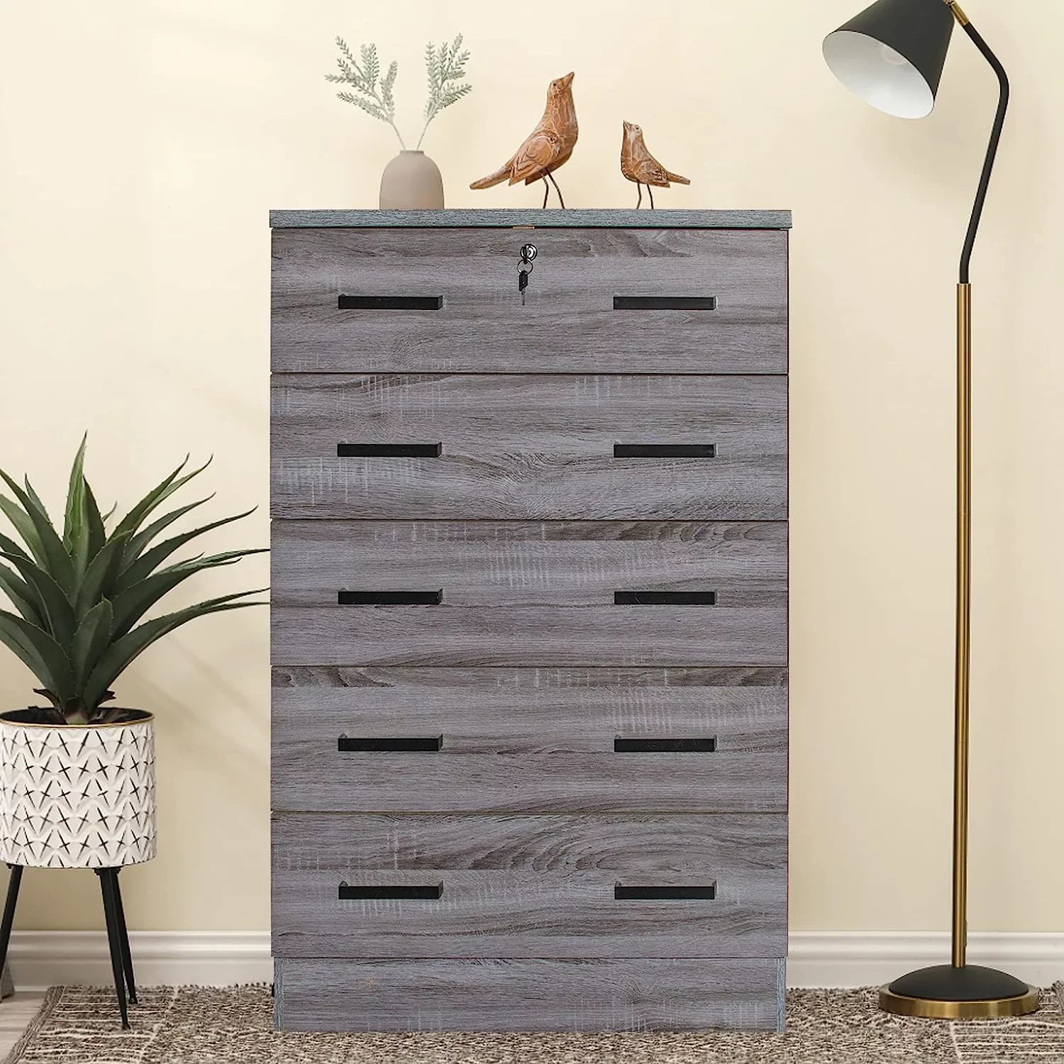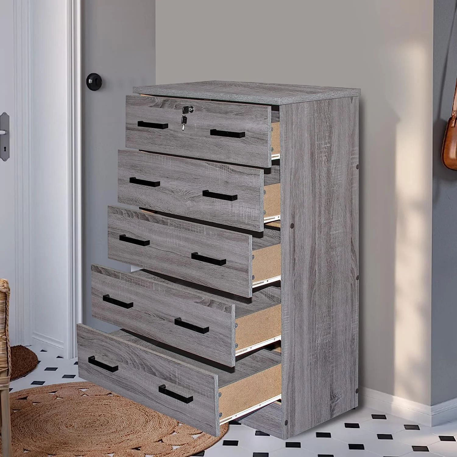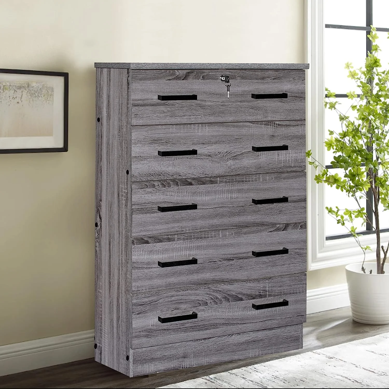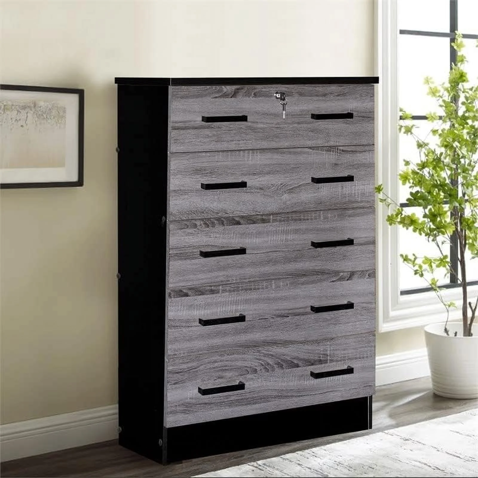 WC5-Wht-Gry Cindy 5 Drawer Chest Wooden Dresser with Lock, White & Gray