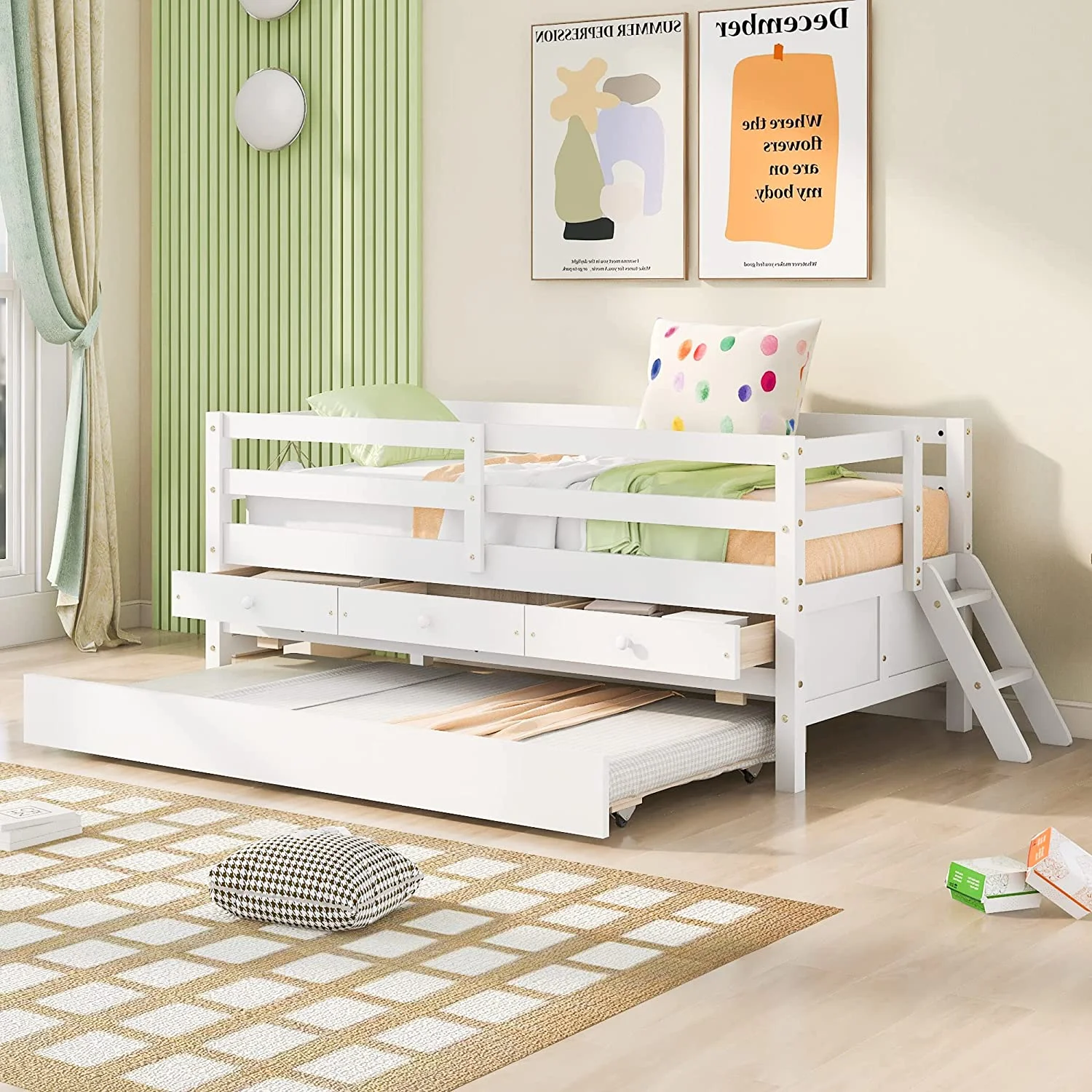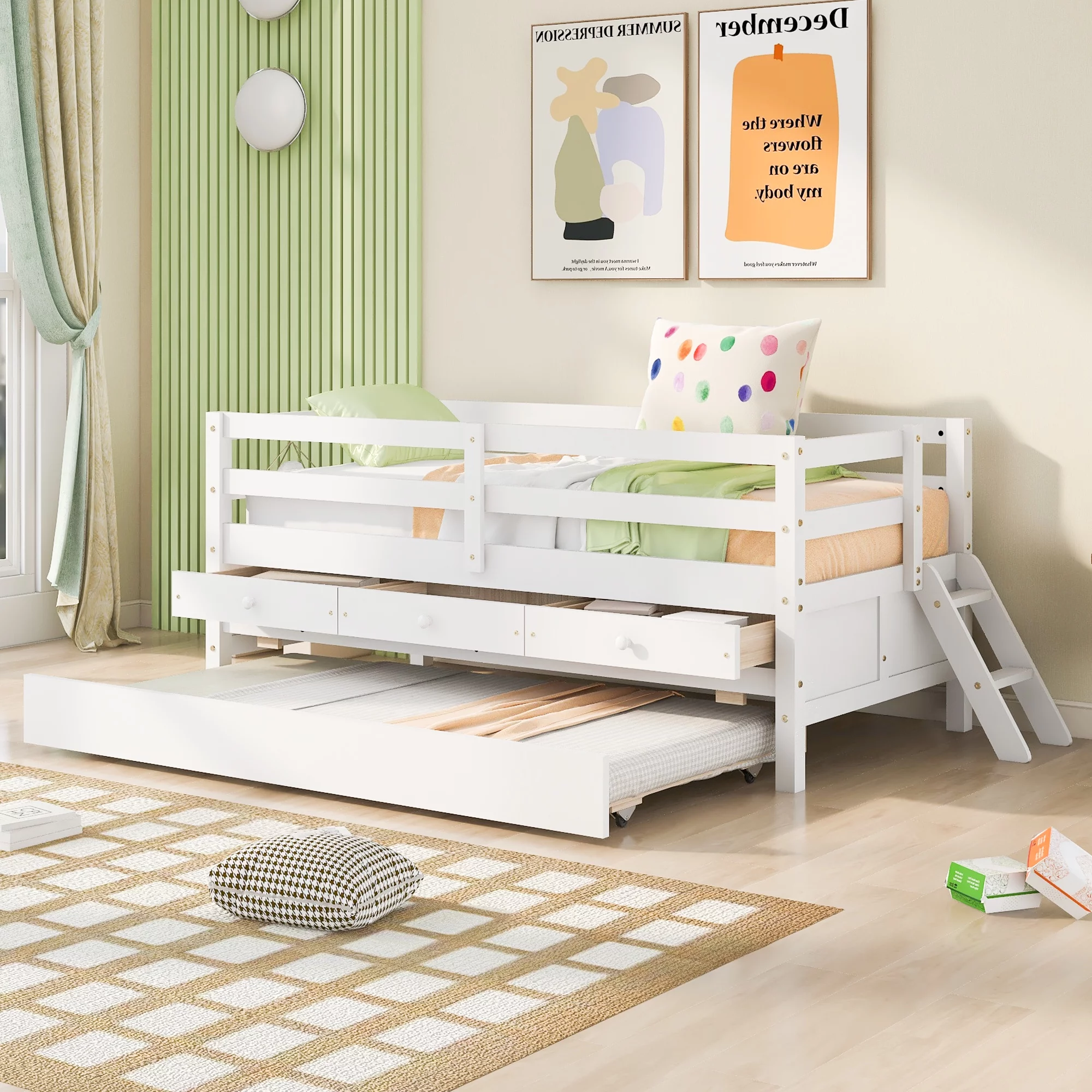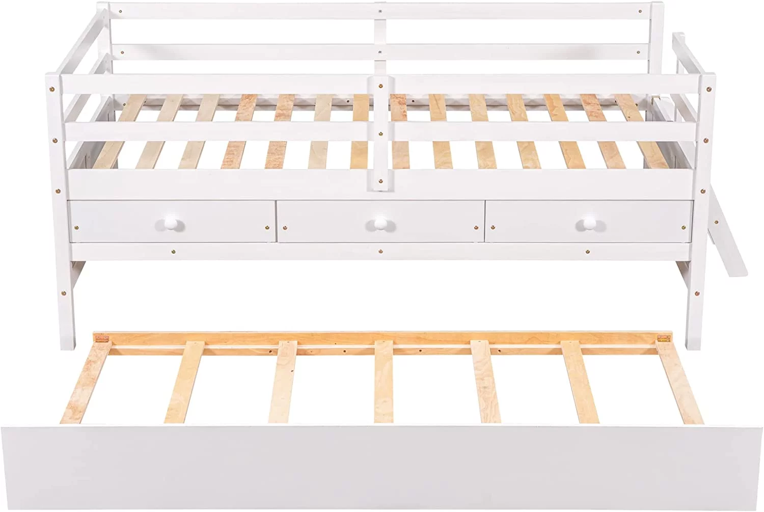 YJTONWIN Low Loft Bed Twin Size with Full Safety Fence Ladder and Trundle White